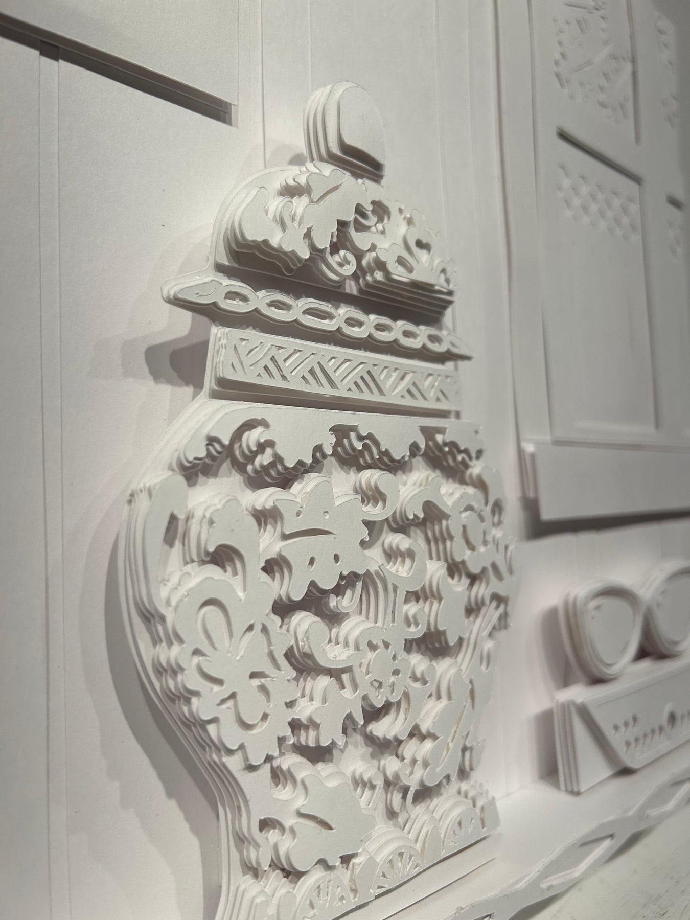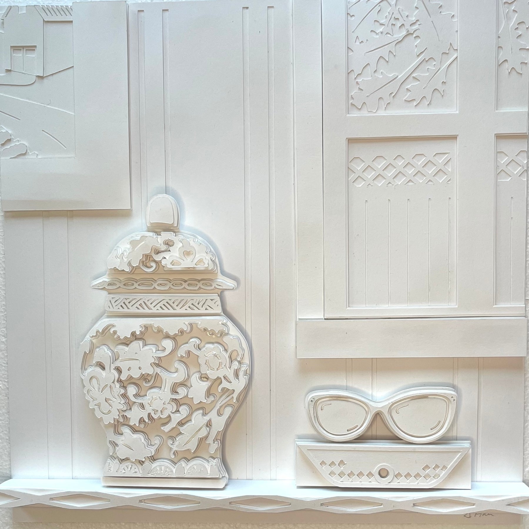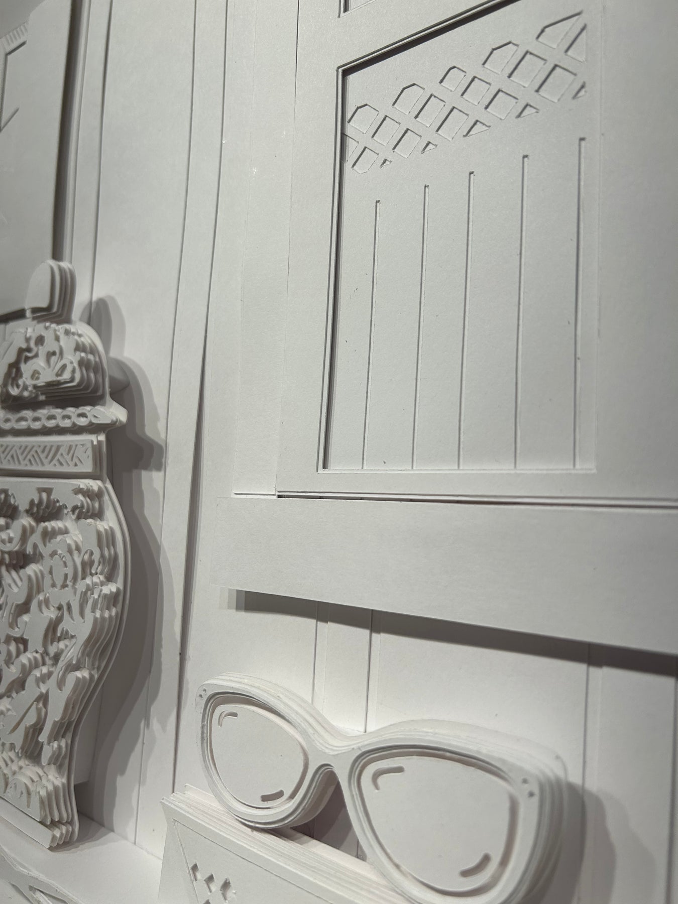 Susan Ryder's art is created by meticulously cutting and layering crisp white paper, distanced just a few millimeters apart. This technique allows for a full spectrum of colors to emerge solely from the shadows. The use of all white paper is important to allow the shadows to exist without distraction. The result is a dynamic sketch, rich with overlapping shadows that shift and change with the movement of light.