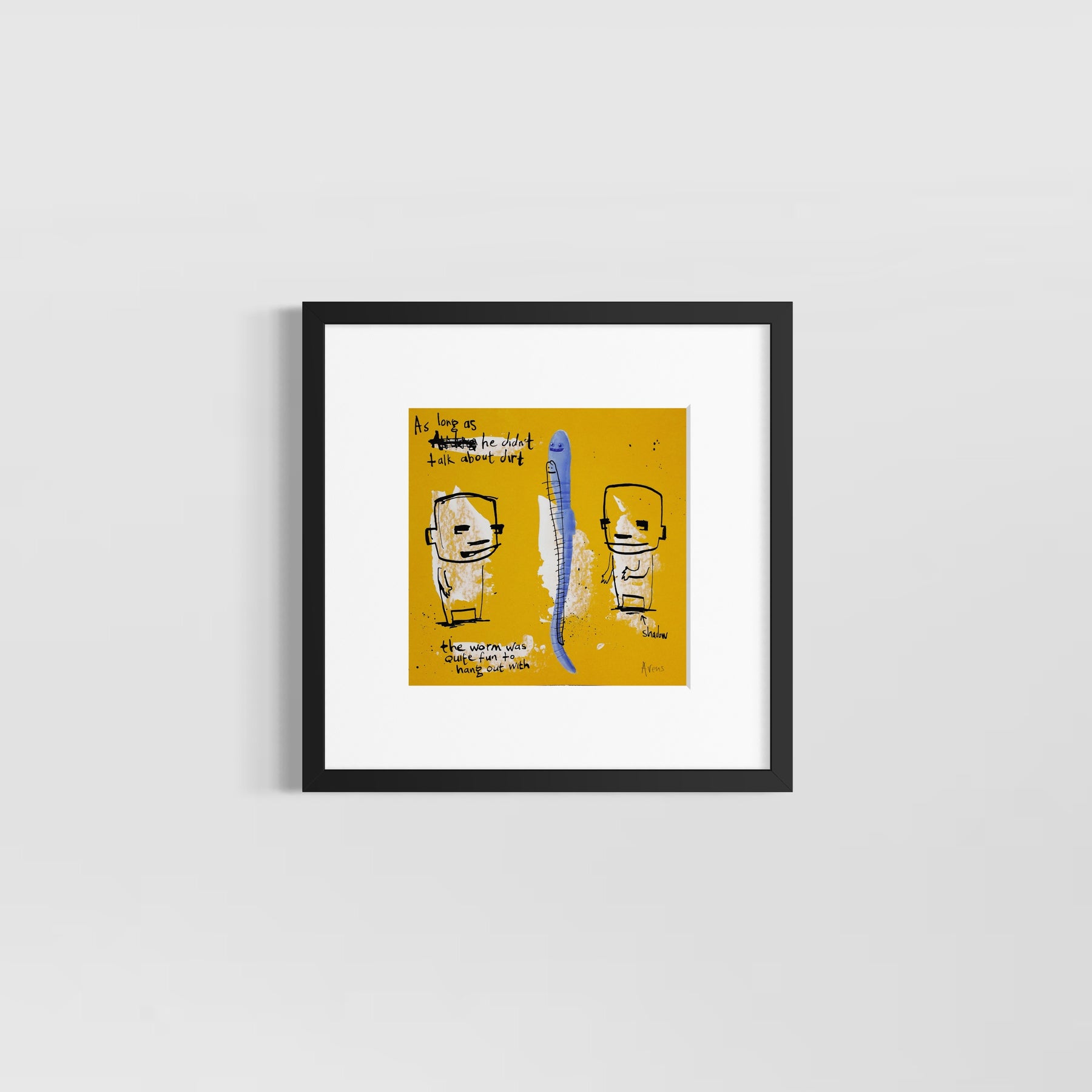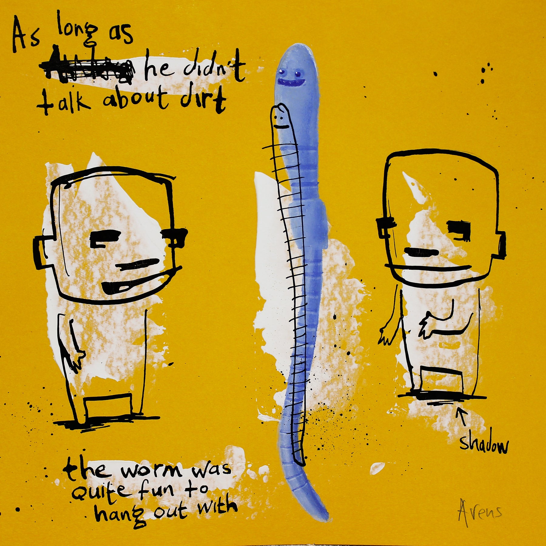 Comic doodle illustration in ink with blue worm on yellow background line drawing figures funny humor