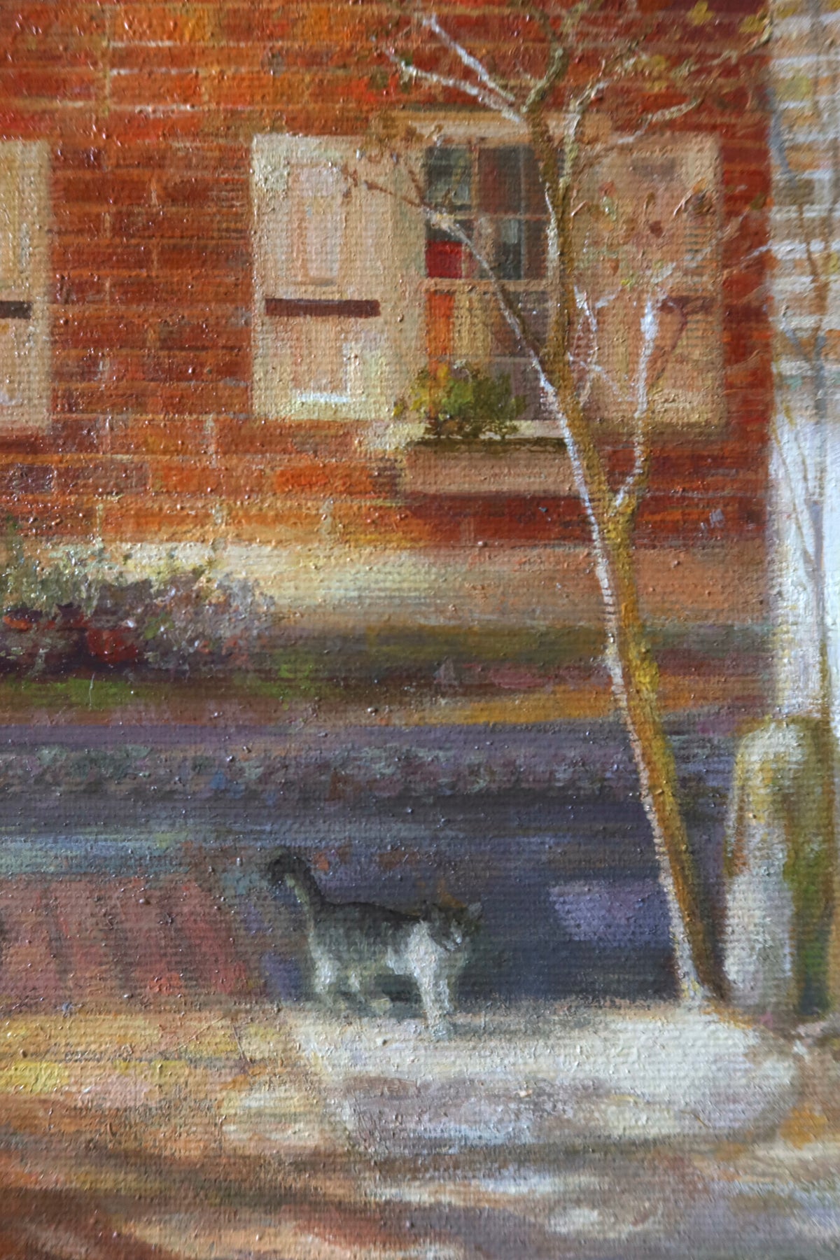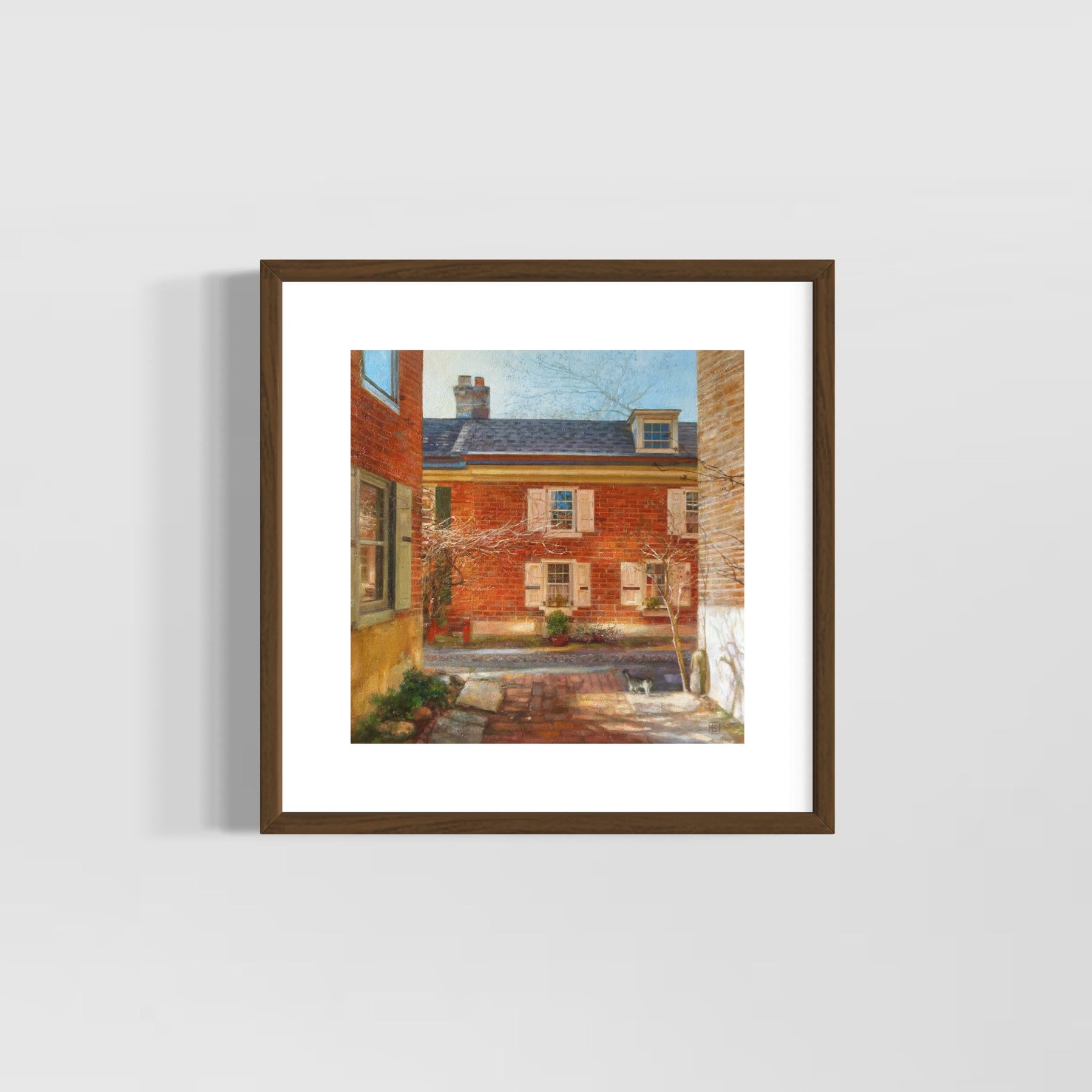 bright brick home alley way with trees blue sky sun shine landscape philadelphia in oil painted landscape realism