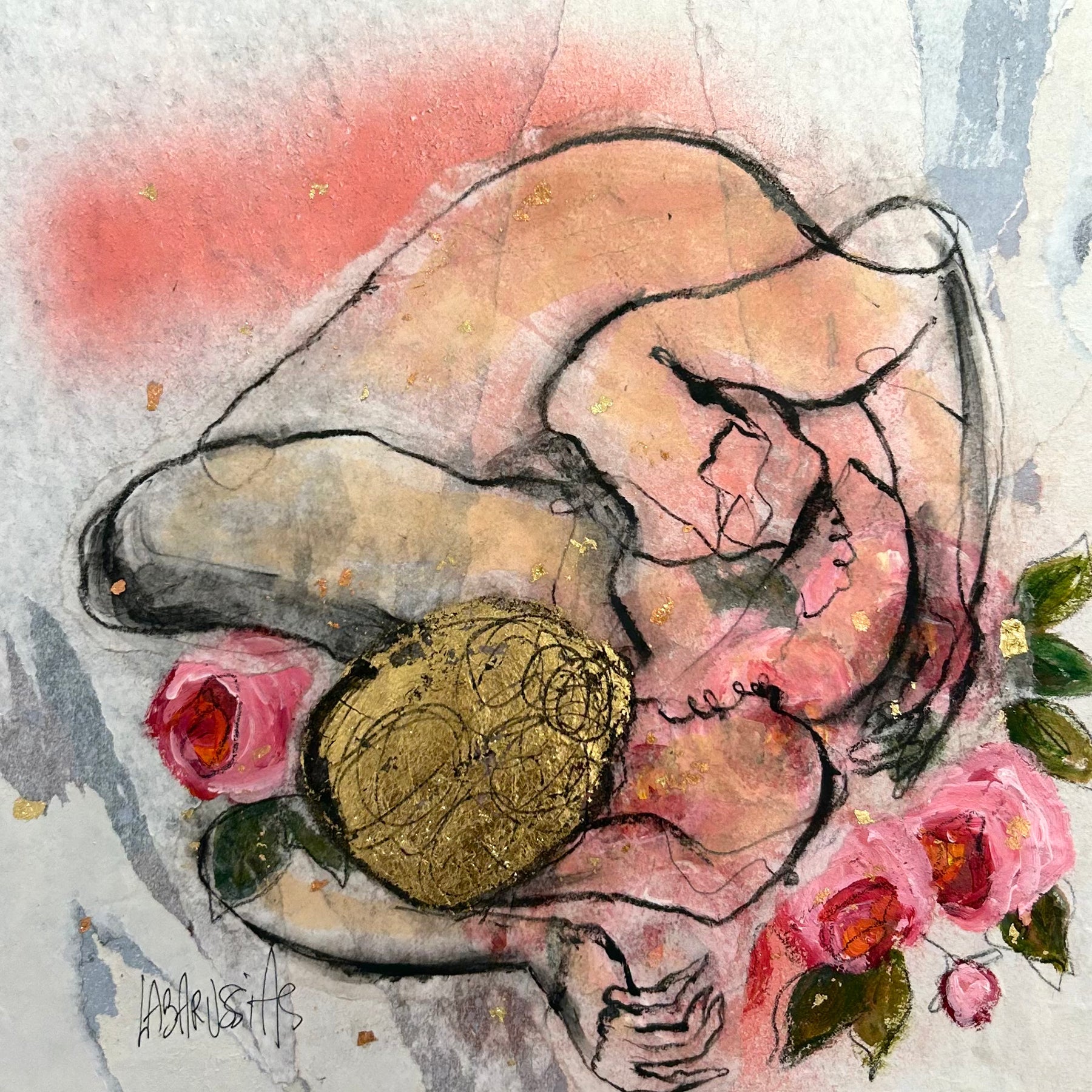 French figurative artist Corinne Labarussias seeks to reveal human desire and form in her delicate watercolor, charcoal, and gold leaf nudes. These totally unique romantic portraits offer a lens of distortion that resists convention. Her characters are erotic and psychological, beautiful and raw. Labarussias conceives of her drawings as a spontaneous dance, with rhythm and movement, captured in a moment, then frozen in time. Her use of recycled materials like old magazines and handmade paper texturize her work in a powerful multi-dimensional way.