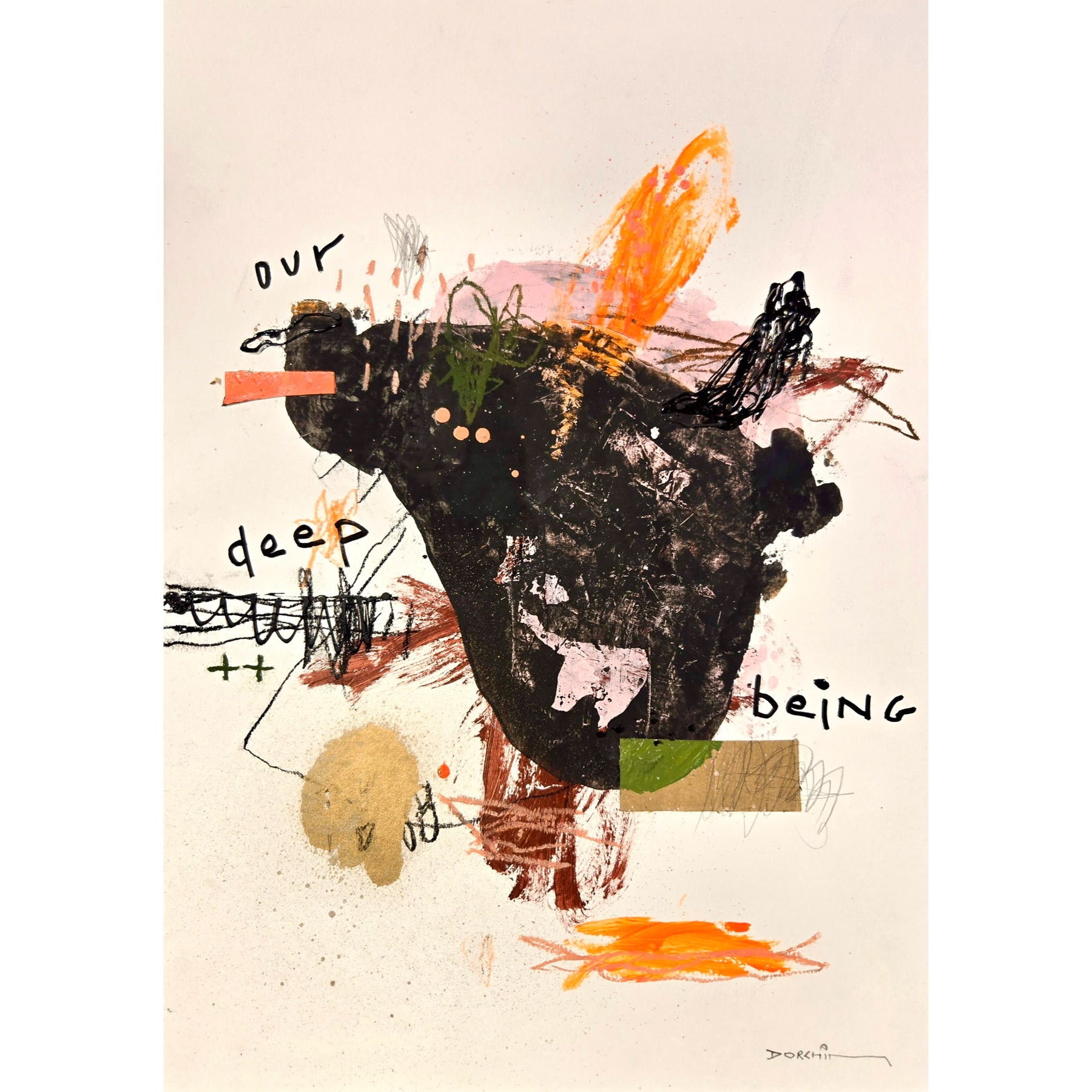 Abstract mixed media artwork on paper by Laurent Dorchin in brown, pink, orange and white. Organic linework and minimal illustrations with collage and text elements.