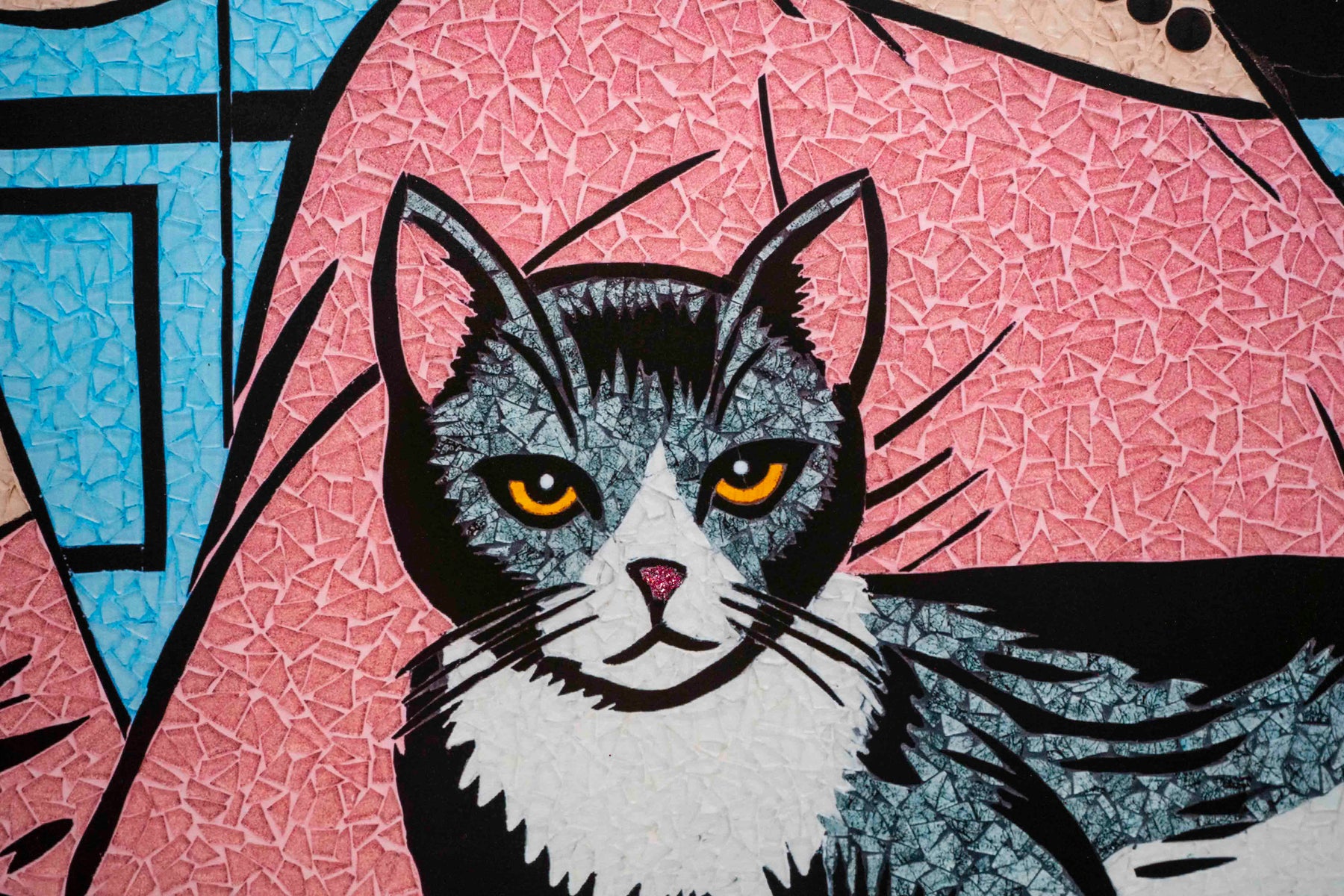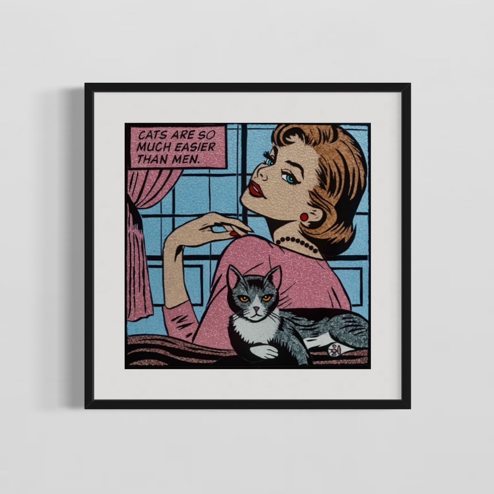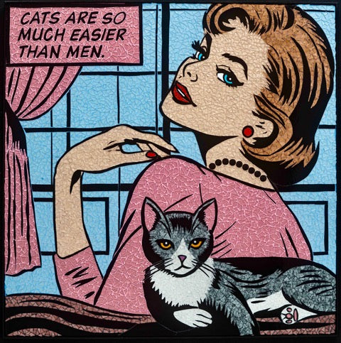 woman in pink with red earrings, lips, and nails looking over shoulder behind cat in grey with pink text bubble in comic book style stained glass mosaic print