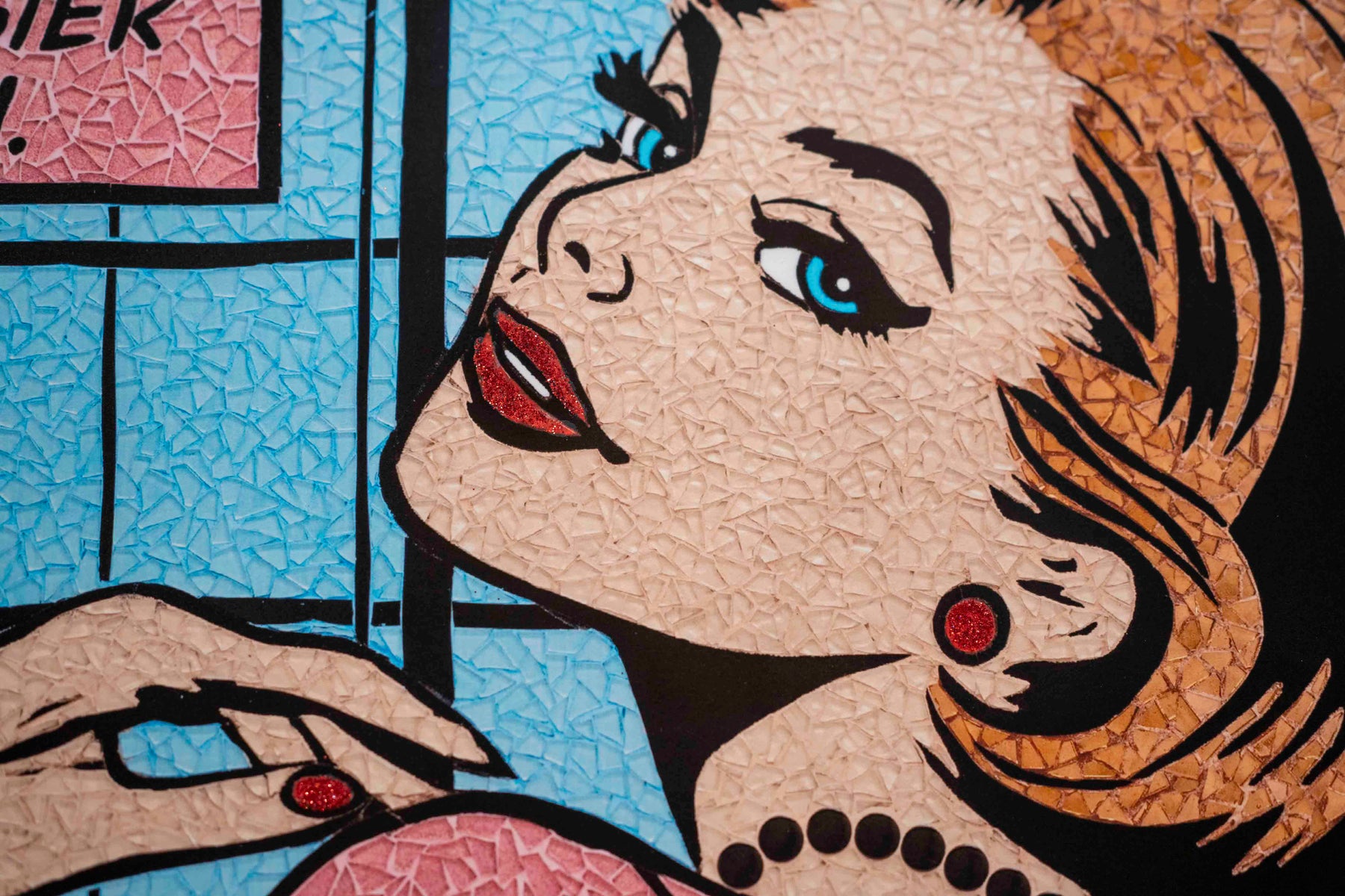 Sarah Fishbein, a contemporary glass mosaic artist based in the Atlantic Highlands of New Jersey, has been pushing the boundaries of visual art for nearly 20 years. Initially grounded in editorial video production, Fishbein artistic journey has led her to embrace the bold, graphic style of Lichtenstein Pop Art Mosaics. She infuses her mosaics with the vibrant, comic-book aesthetic of 1950s and romance comics, creating striking reinterpretations of pop culture through the timeless medium of glass.