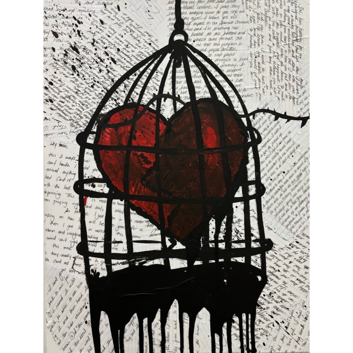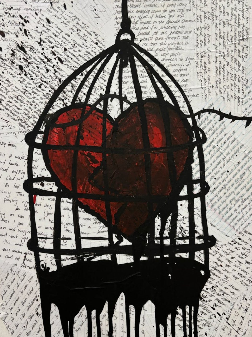 “The two paintings form a cohesive mixed media piece using acrylic paint and old love letters sent throughout the time span of 5 years. One painting depicts the heart inside a cage, symbolizing love constrained by choice. The other painting shows a heart in a similar cage, but this one is representing love caged due to circumstance. Despite the separation, the hearts are connected by an ethereal thread of letters, illustrating the enduring bond of love across distance.” Roxsana Diaz, artist