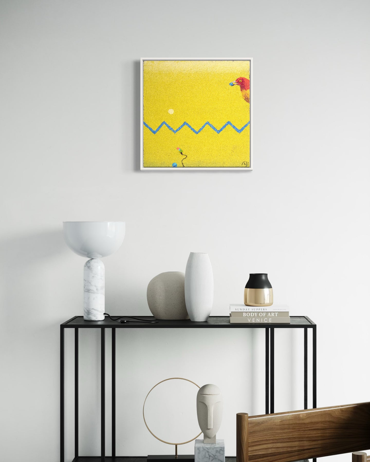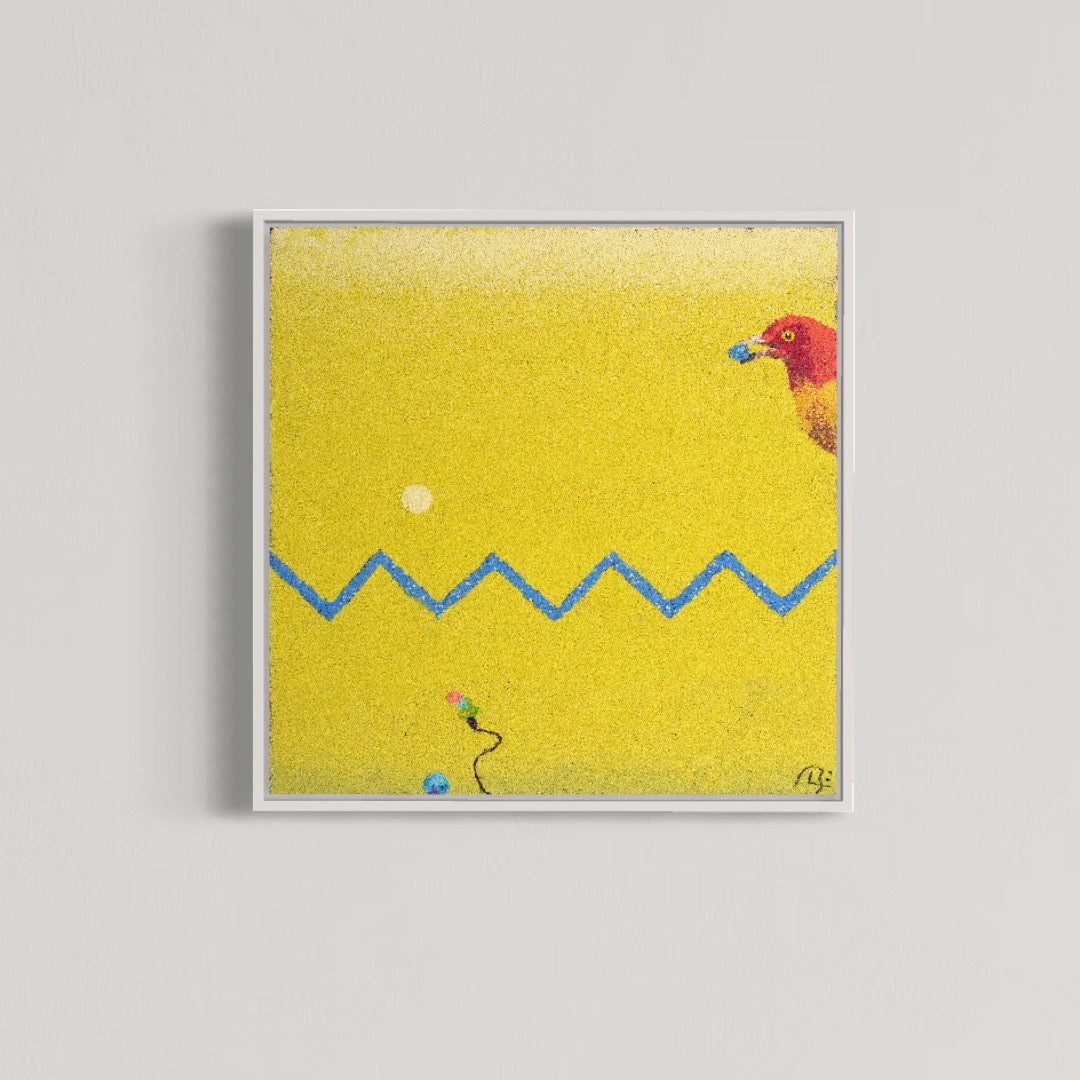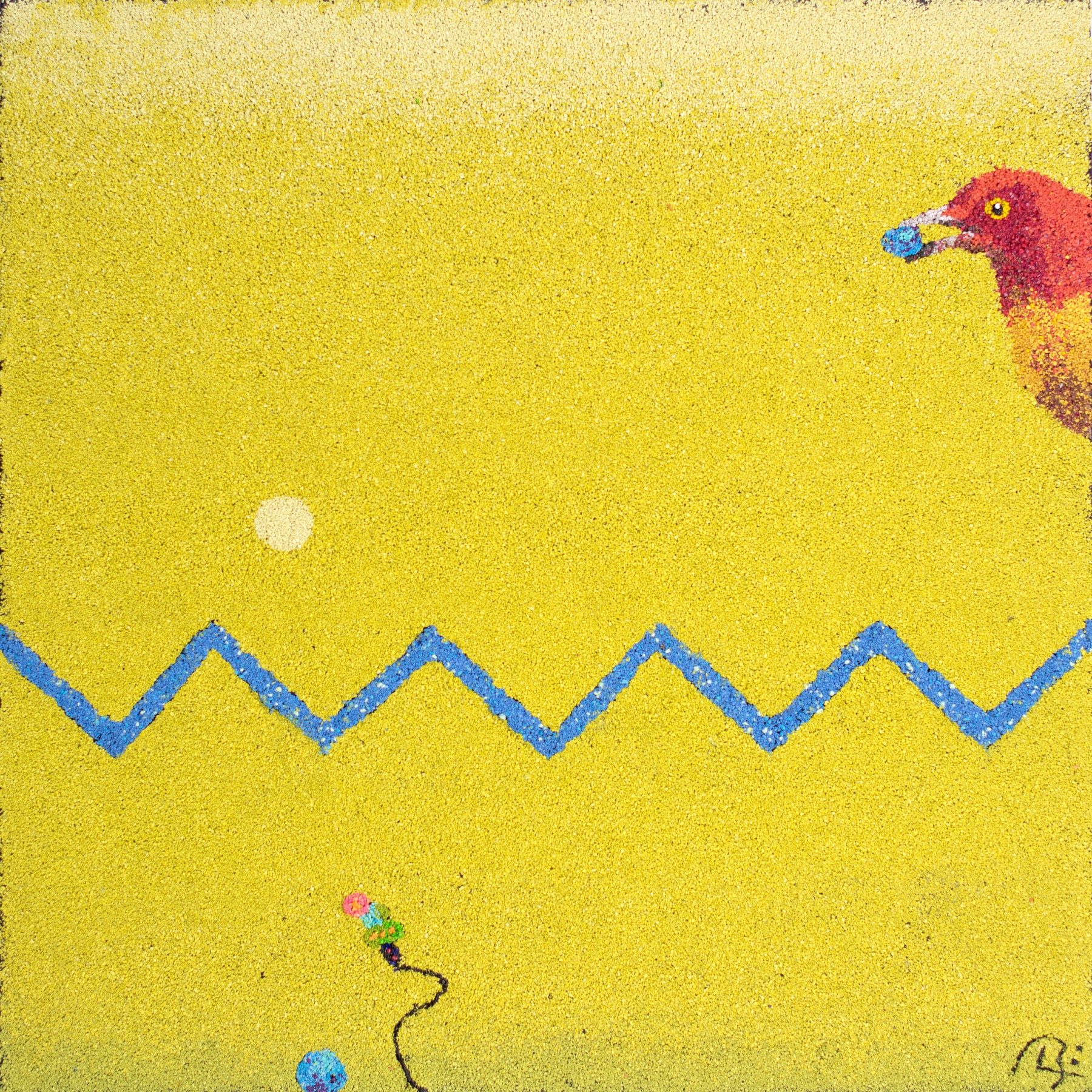 20"x20" abstract piece using crushed volcanic rock and acrylic paint with a bird and abstract forms over a yellow background.
