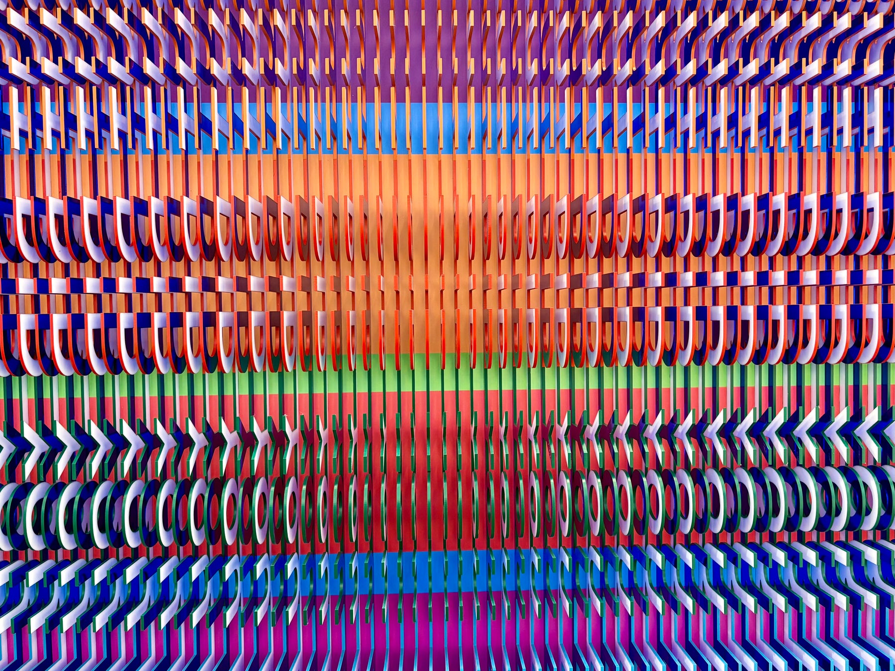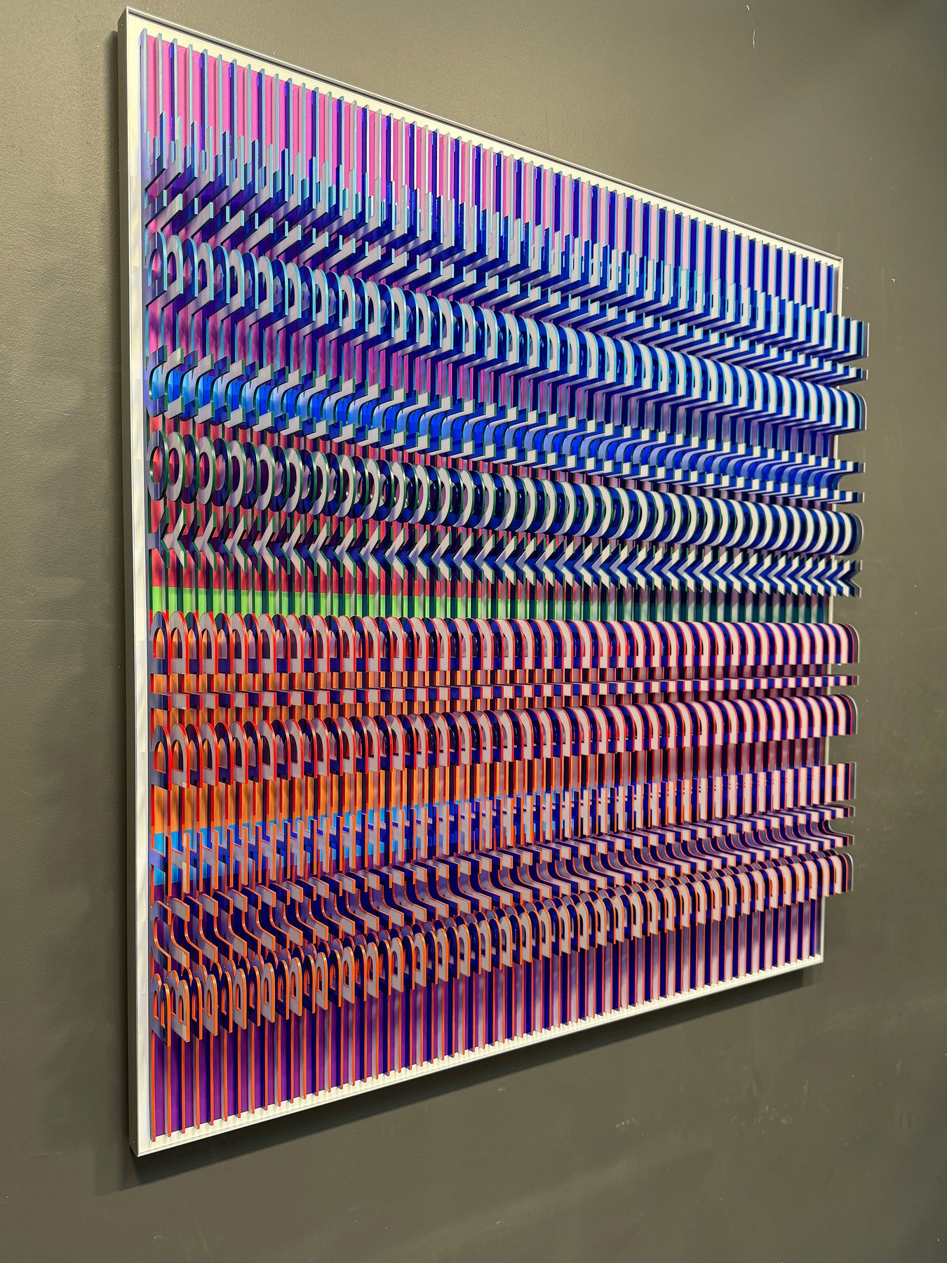 Margulis is drawn to scenes that allow him to explore composition in its most basic geometric forms: symmetry, asymmetry, volume, shapes, forms, limits, transitions and more. The challenge of creating balanced compositions in unexpected ways is fundamentally what attracts the artist’s eye and fuels his ideas.  The artist begins with 3D digital software from which he designs and maps his 3D objects and compositions, ultimately cutting them into layers from different types of plastic and aluminum composites. Most of Jose’s work uses acrylic sheets and aluminum composites in various colors, textures, and patterns, often inspired further by traditional Mexican arts.