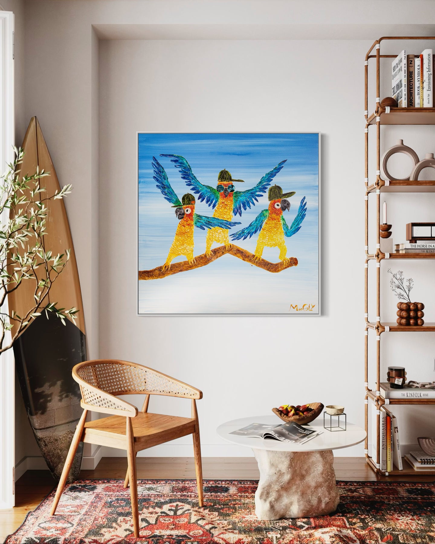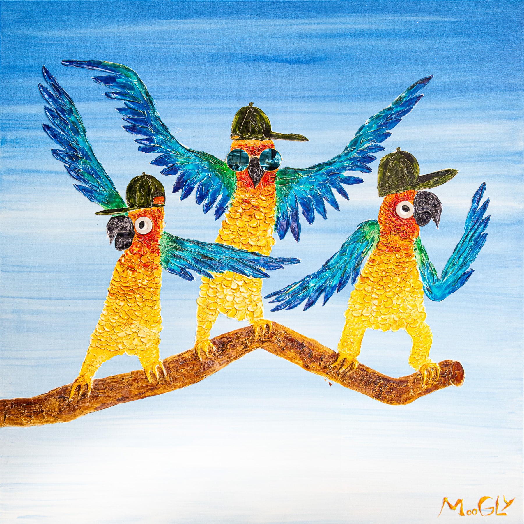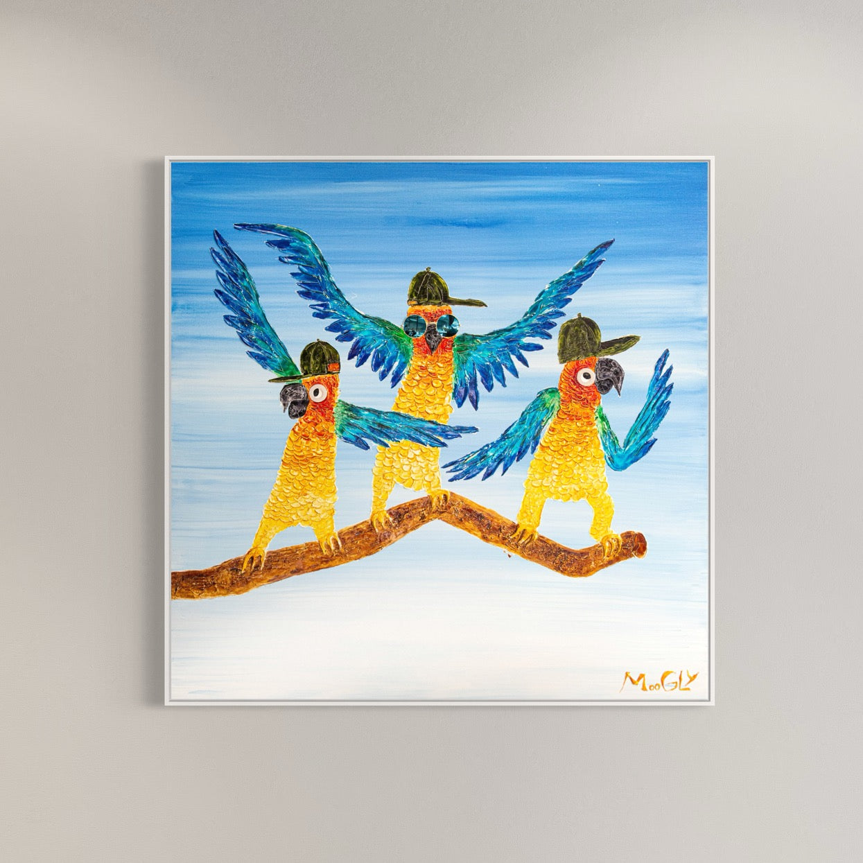 Acrylic 48" x 48" Dancers painting by Moogly. Brightly colored, fun and animated dancing parrots with hats and sunglasses on. Colors include blue, green, yellow and orange.