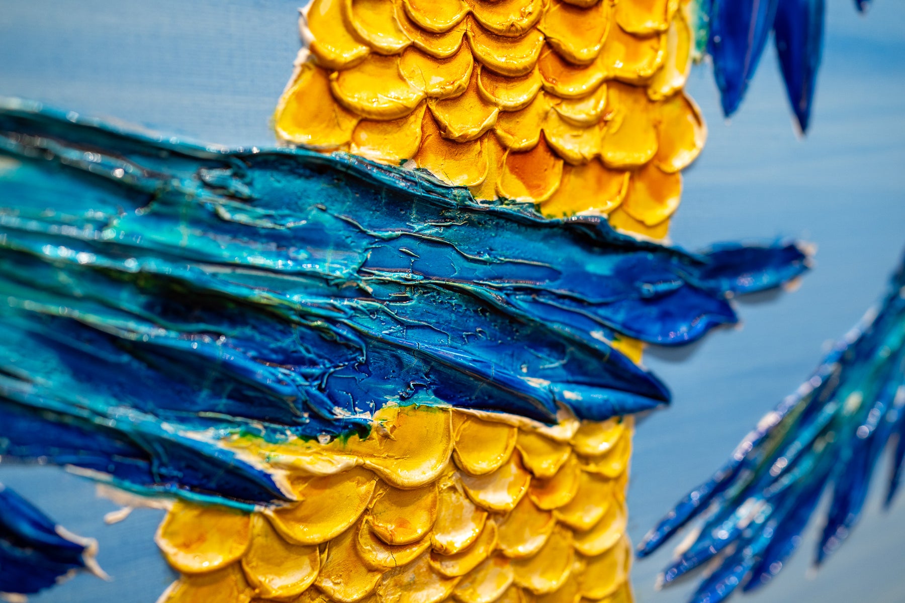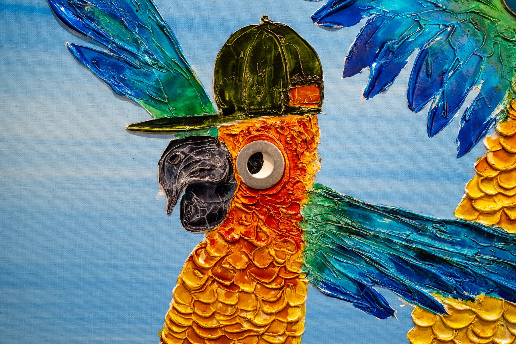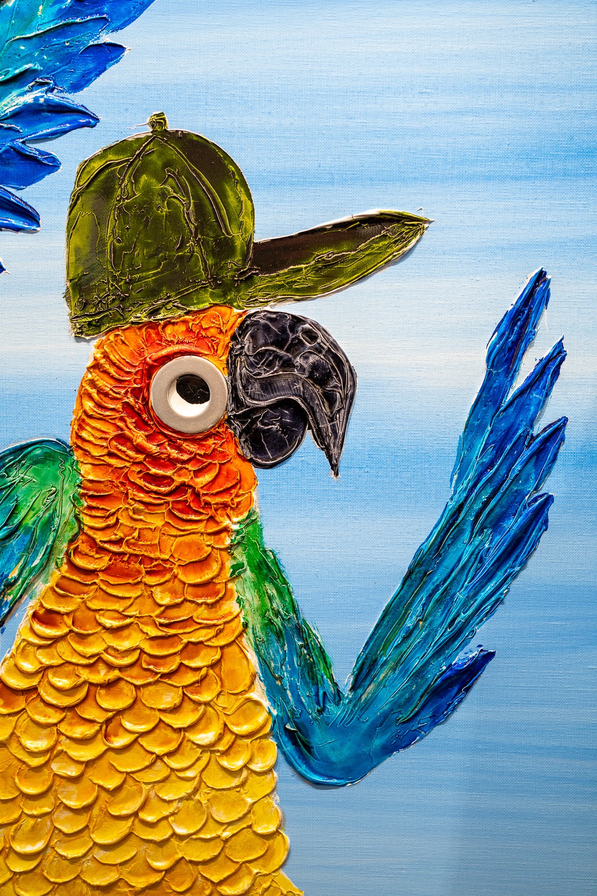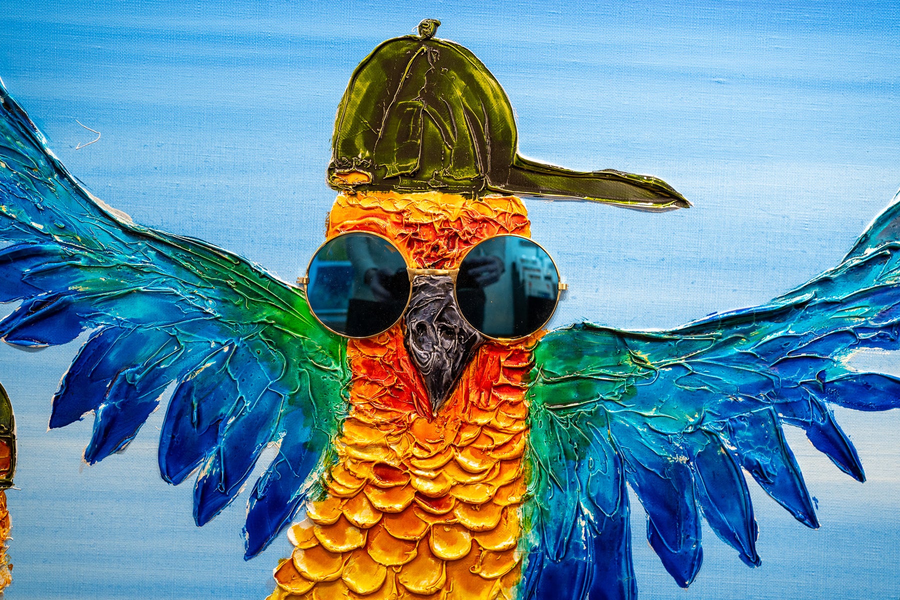 Acrylic 48" x 48" Dancers painting by Moogly. Brightly colored, fun and animated dancing parrots with hats and sunglasses on. Colors include blue, green, yellow and orange.