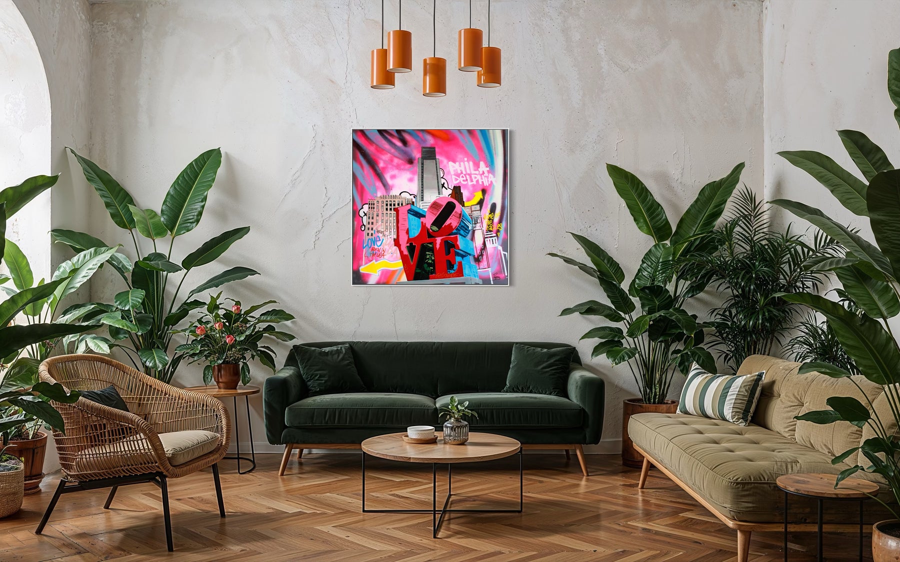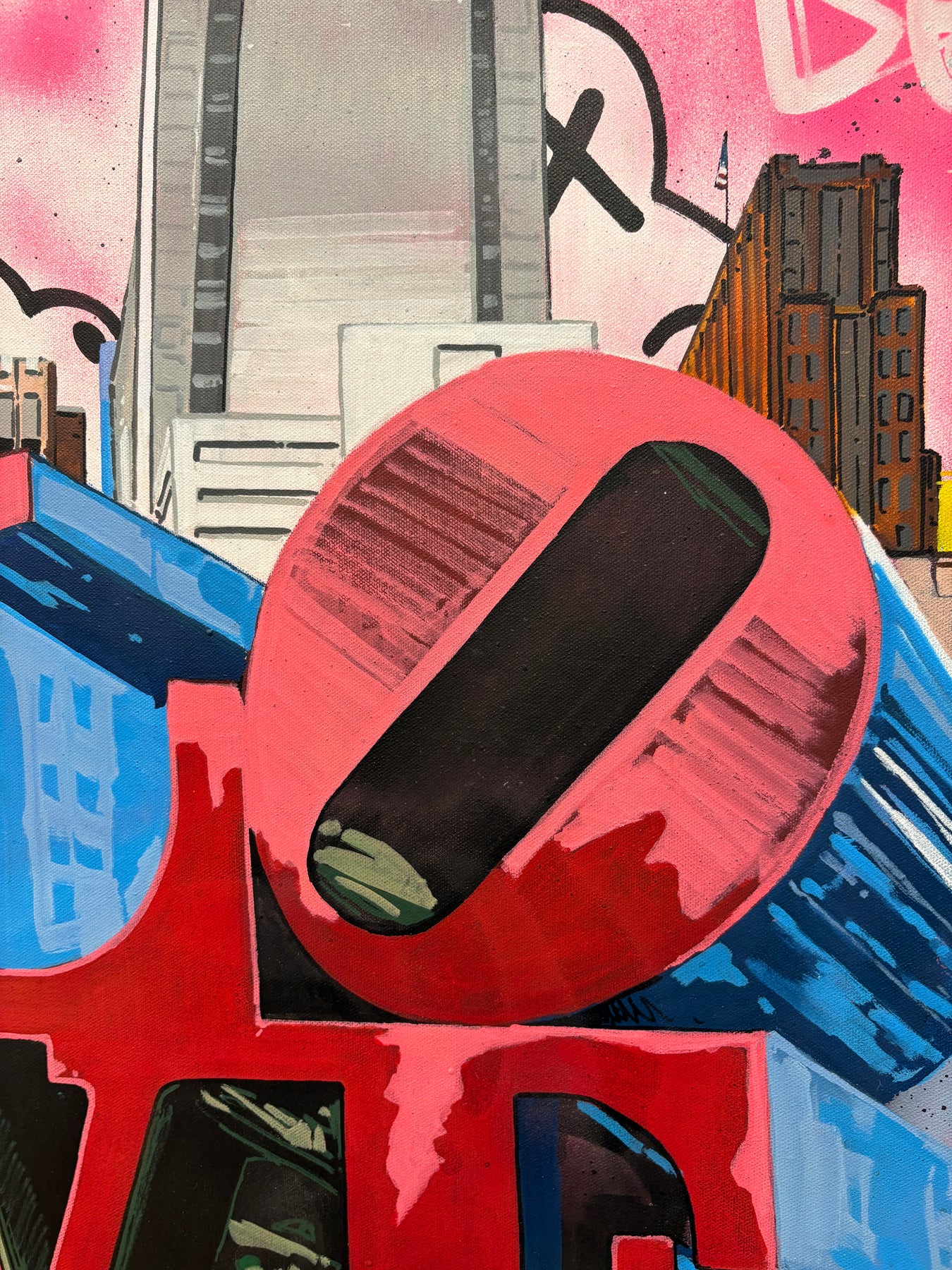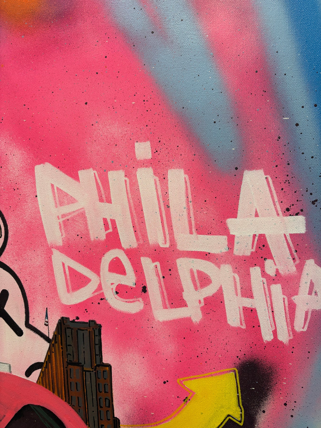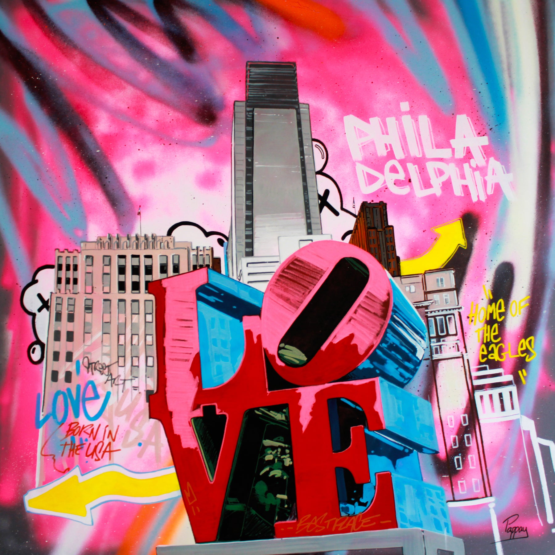 vibrant graphic illustration philadelphia love park sign buildings landscape graffiti marker in pink bold letters