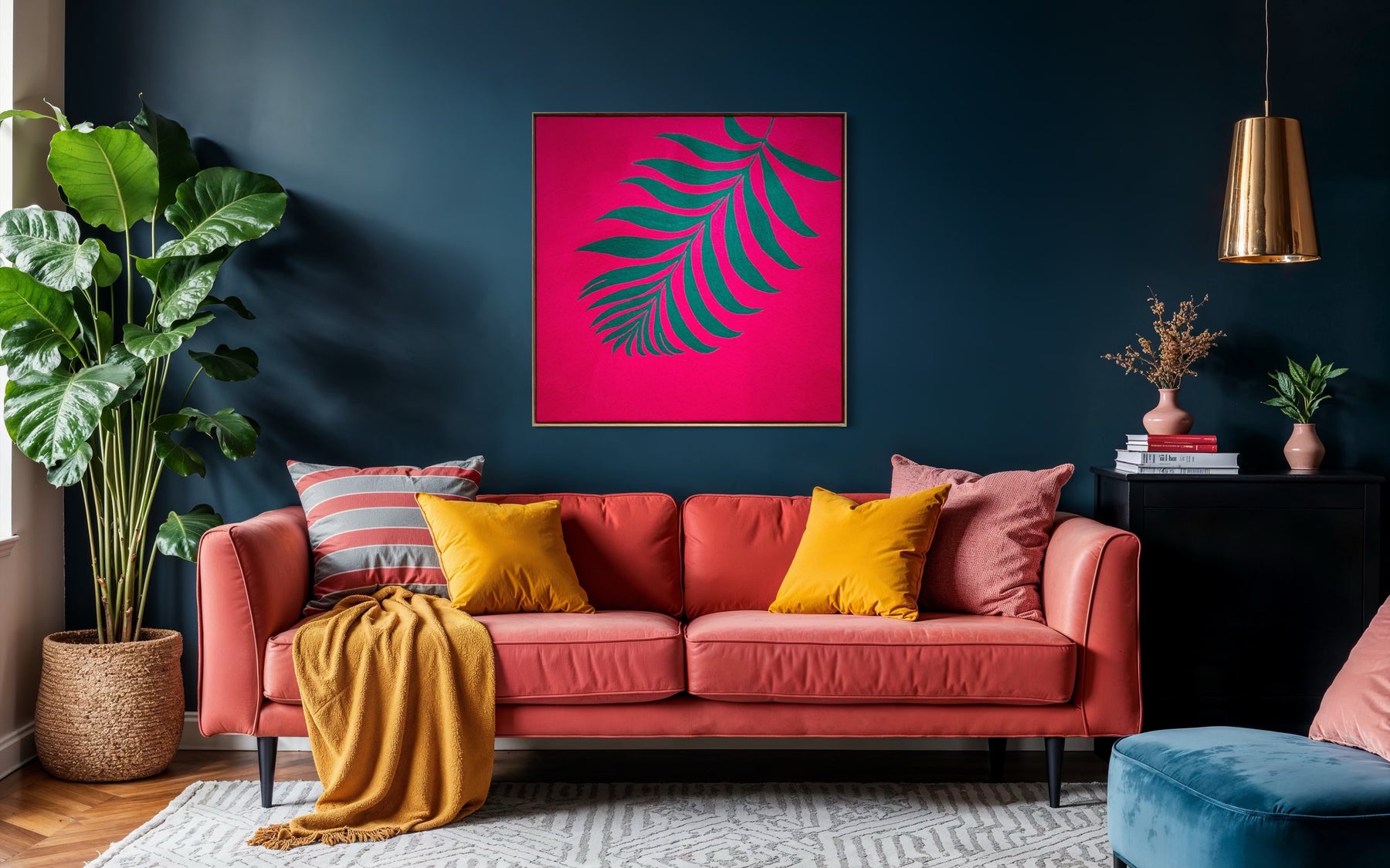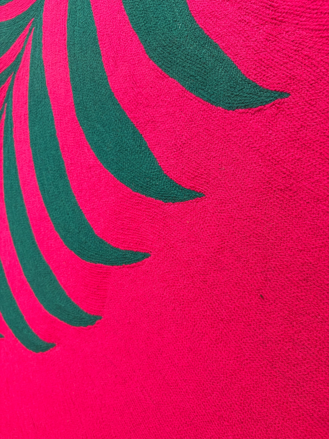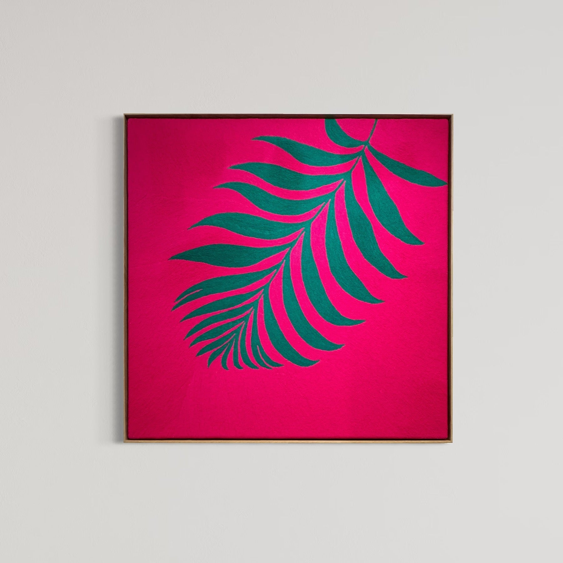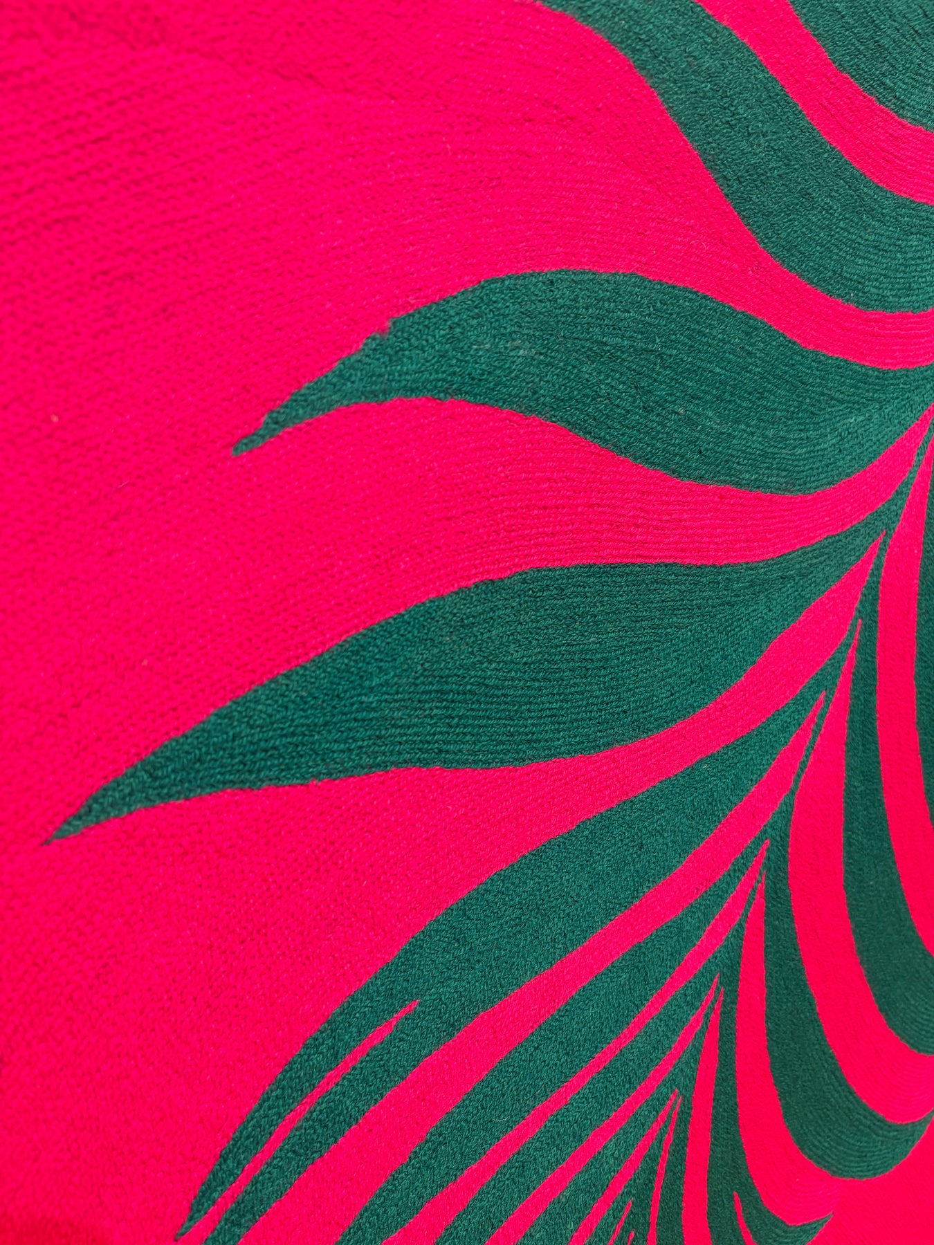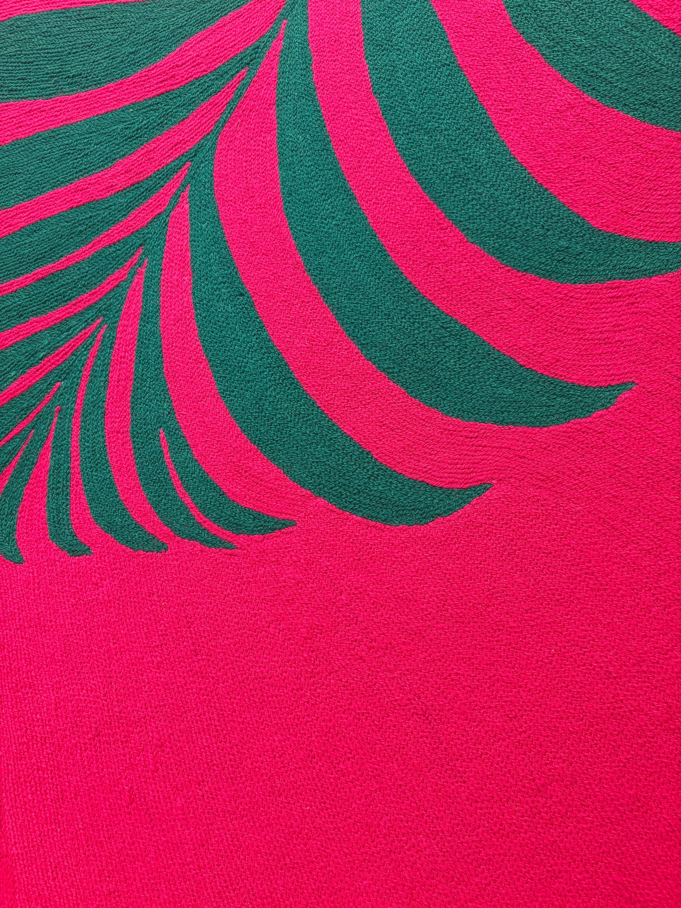 42.5"x42.5" chain-stitched textile with a tropical leaf over a bright pink background.