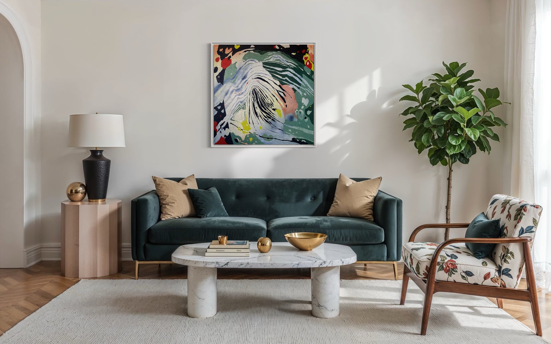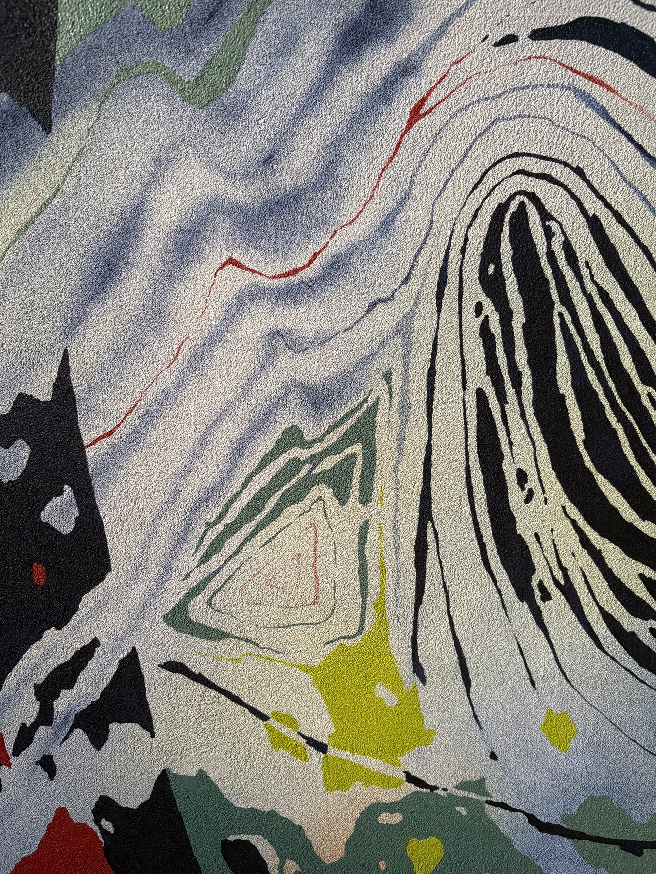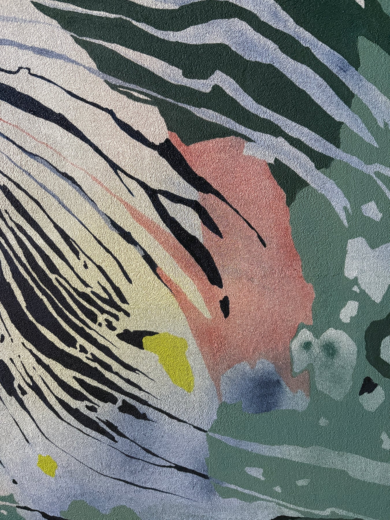 Erin Touey’s work straddles the line between abstraction and representation in her new series of pumice-primed canvas oil paintings. Touey utilizes fluid shapes, variation of line weight, non representational color, distortion of perspective, and in this series, the texture of the pumice primed canvas to bring her often tangible subject matter into the abstract realm. With a limited palette consisting only of Phthalo Blue, Cadmium Yellow, and Quinacridone Magenta, Touey challenges herself to mix all of her colors. The white of the canvas is preserved deliberately, the negative space making shapes that sometimes jump forward or fall back.