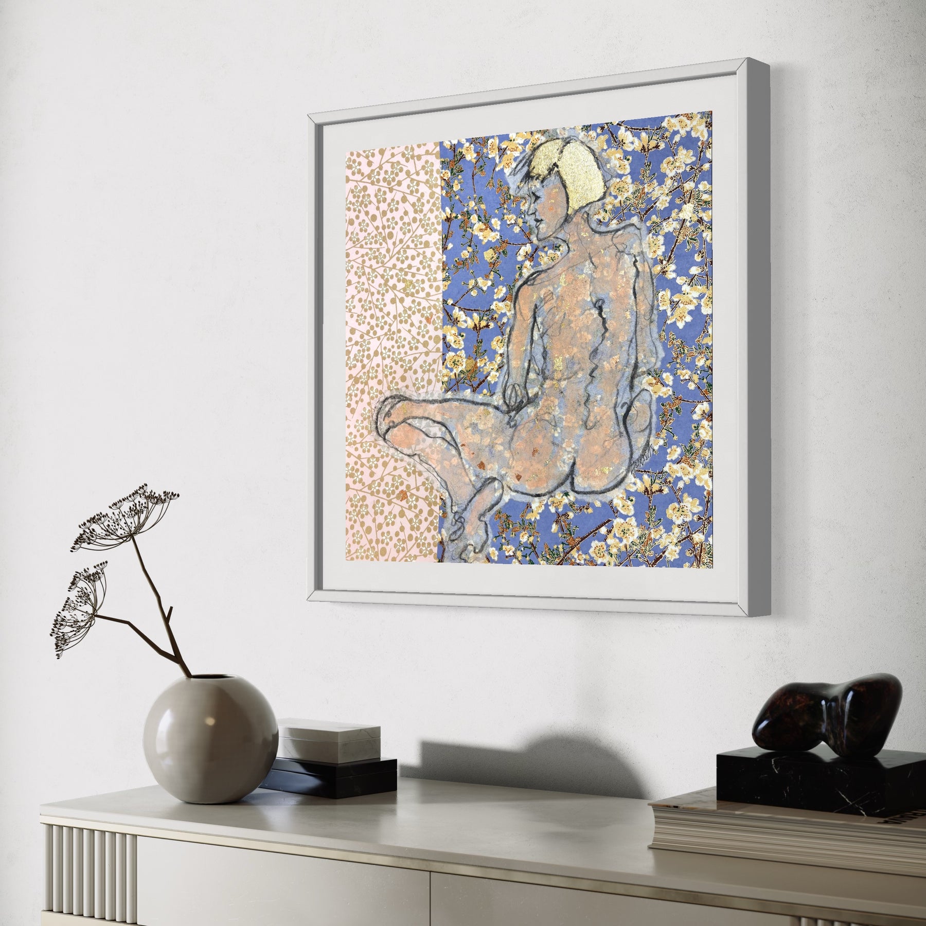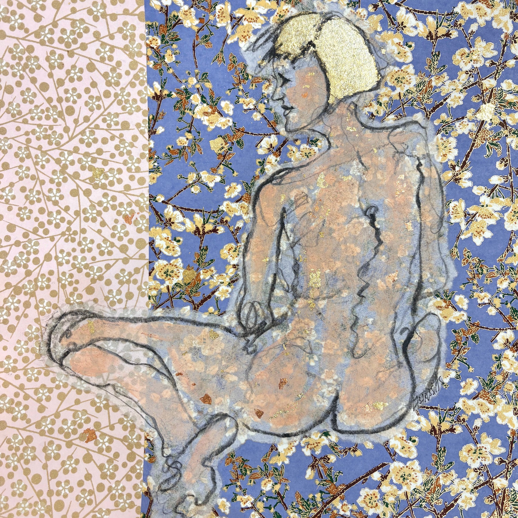 sitting woman figure gestural sketch drawing looking to side bent knees on floral blue paper collage