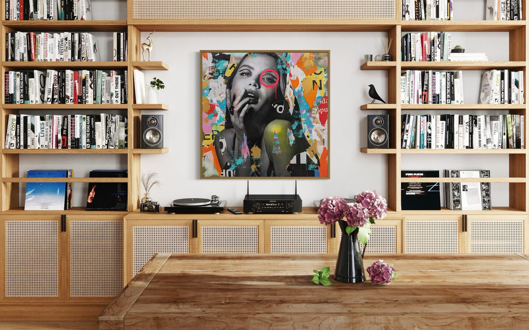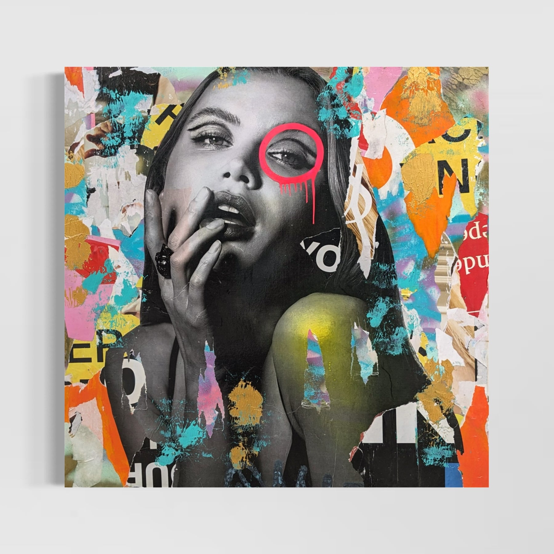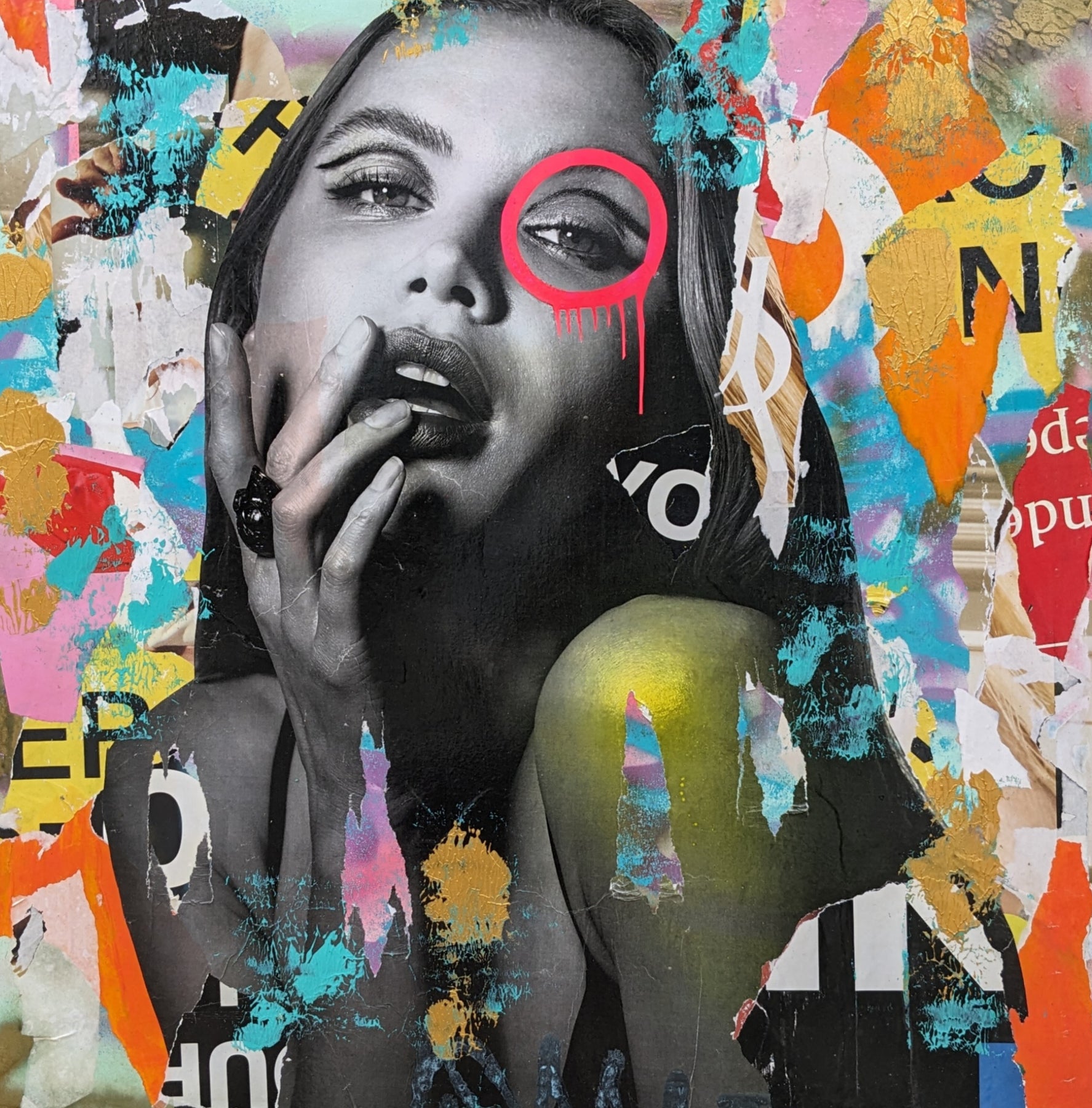 36" x 36" Acrylic paint, spray paint, wheat-paste, vintage advertisements, printed fragments on canvas. A woman surrounded by colorful paper fragments with DAIN's signature circle around the eye.