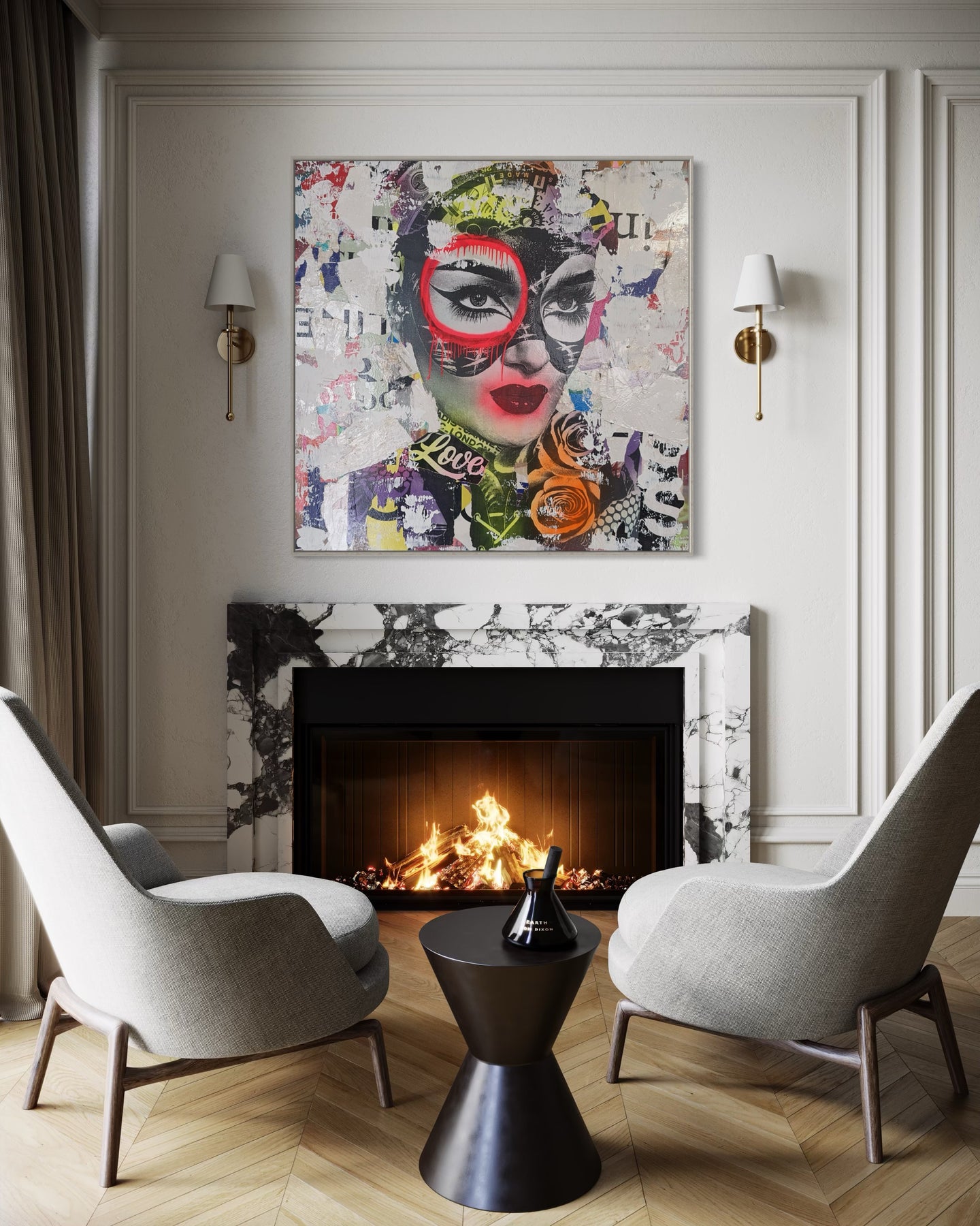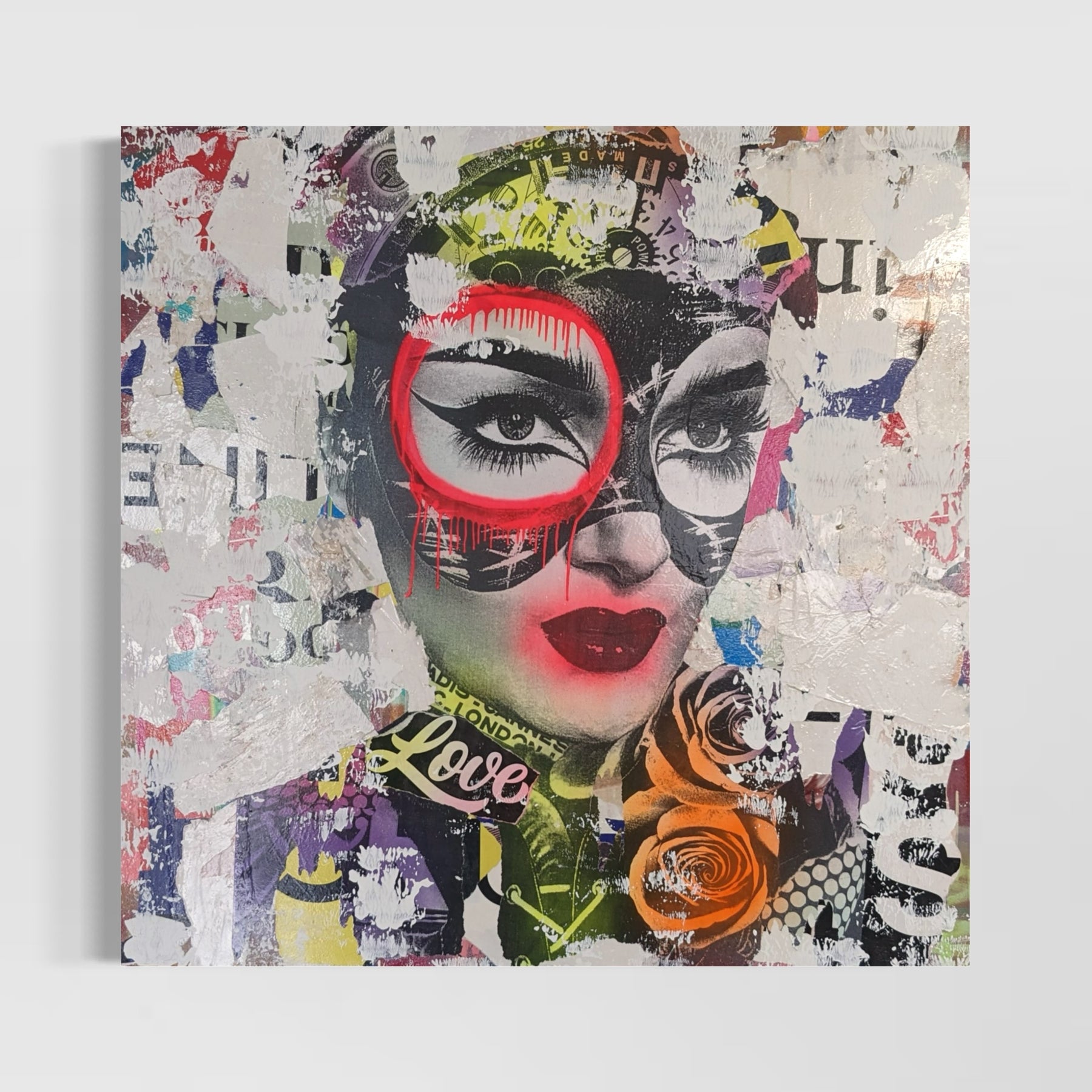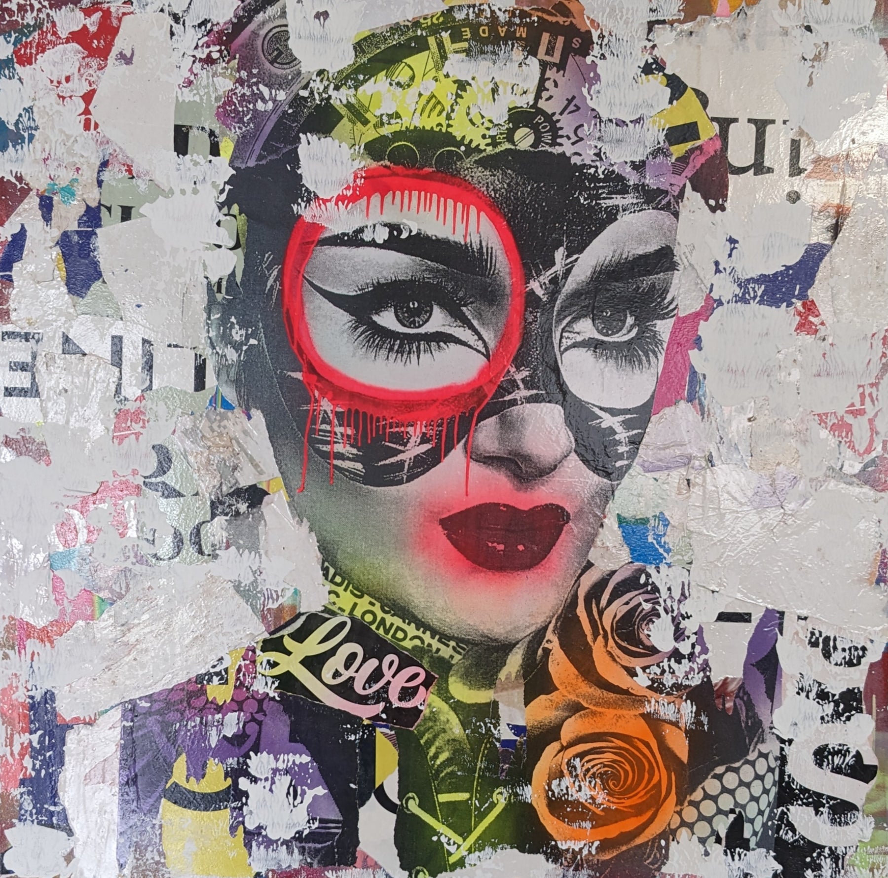 Truly distinctive among street artists today, DAIN has put in the time to cultivate his craft. Since the 1980s, this Brooklyn-born street artist has been hard at work musing city life with his street work now found throughout the boroughs. A self-taught painter, DAIN’s signature touch is the notable tagging with a ‘circle and a drip’ of just one of the eyes of his subject. When approaching a piece, DAIN first selects black and white images inspired by the mystique of bygone femininity. He then layers his primary images with additional smaller images like vintage advertisements and found paper fragments. Only at the end of his process does he pick colors to render a portrait in acrylic and spray paint.