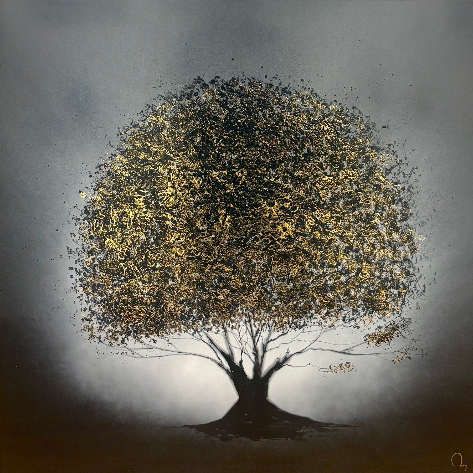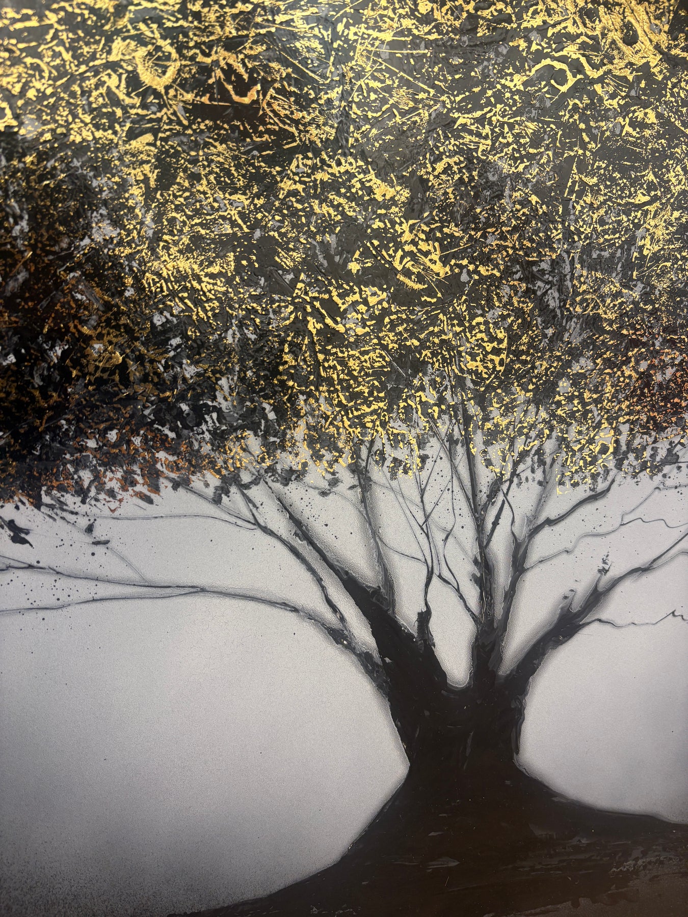 minimal tree in black white and grey lacquer with gold leaf detail accenting leafs light reflection trunk on smooth gradient background