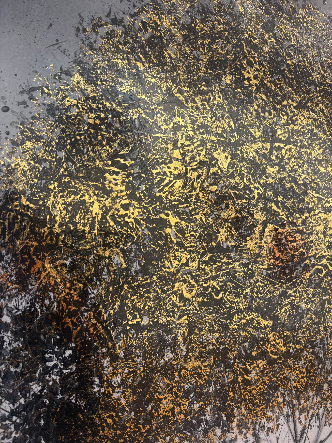 Julien Rey's story begins like all great stories: with an impossible dream. With achromatopsia (the absence of color vision), the artist sees only in black and white. Yet, this condition did not prevent him from traveling to the borders of Burma, from changing his life (he became a Buddhist monk), or from embarking on his art. From his trip to Burma, he brought back a perfect mastery of gold leaf and Chinese lacquer, a characteristic element in his work. His technique based on lacquer worked with a knife and gold leaf inlays places light at the center of his works. Marked by Zen philosophy, he creates minimal compositions that appear as suspended moments and poetic pauses. Julien Rey takes us on a journey through his paintings to urban landscapes and far-off lands.