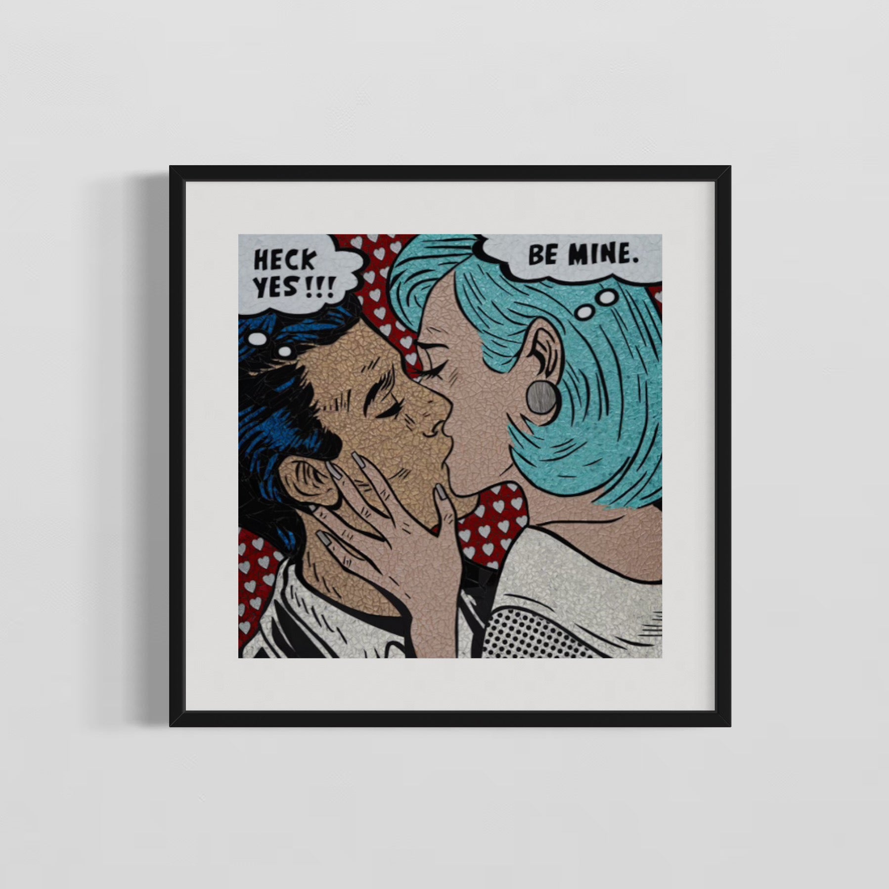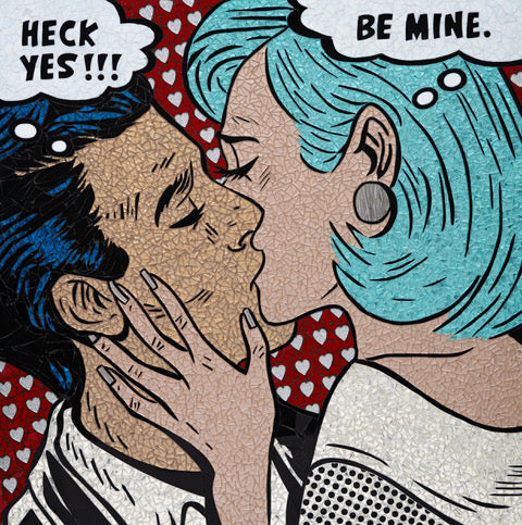 man with black hair in tuxedo kissing woman with blue short hair with thought bubbles in comic style on background of red and white hearts pattern in glass mosaic