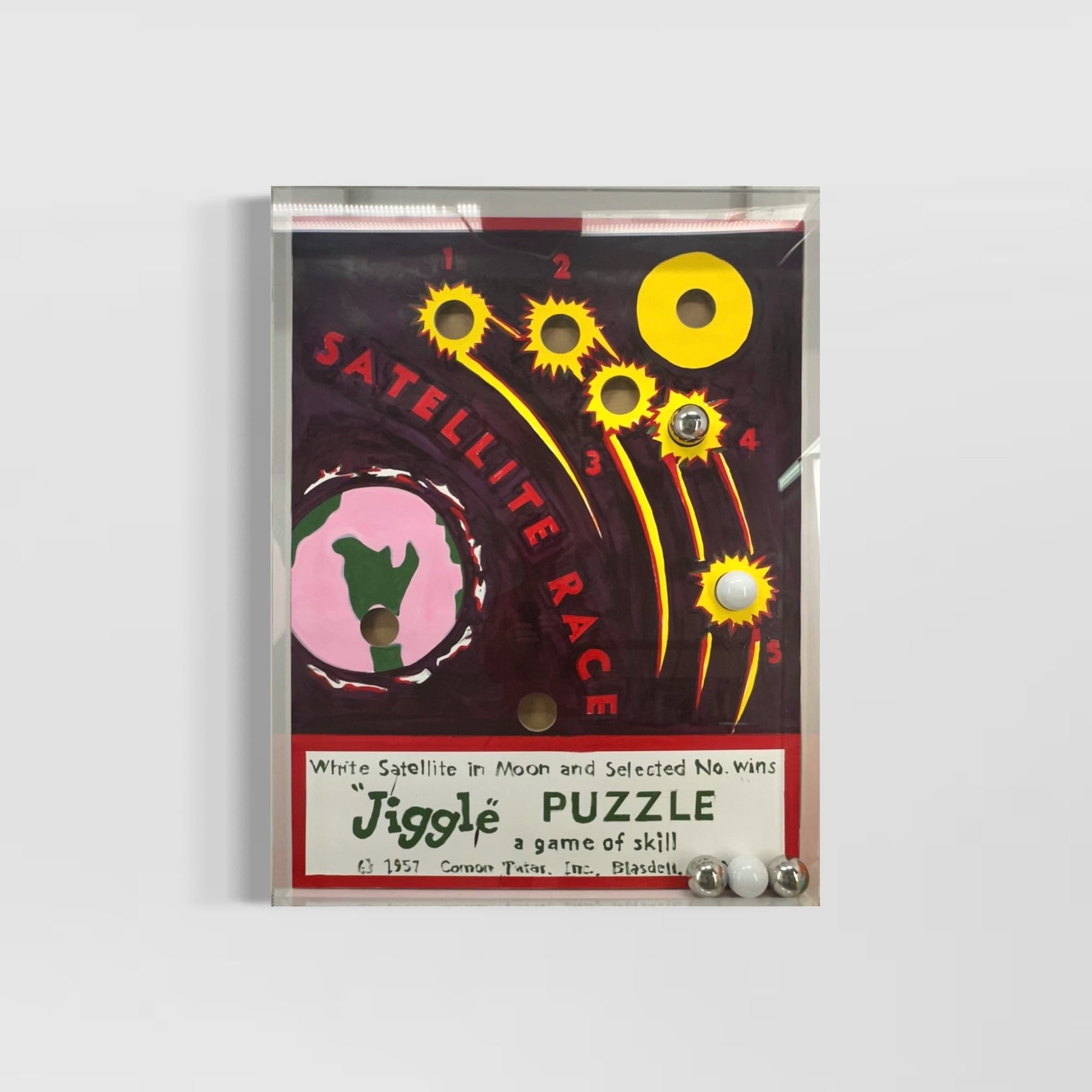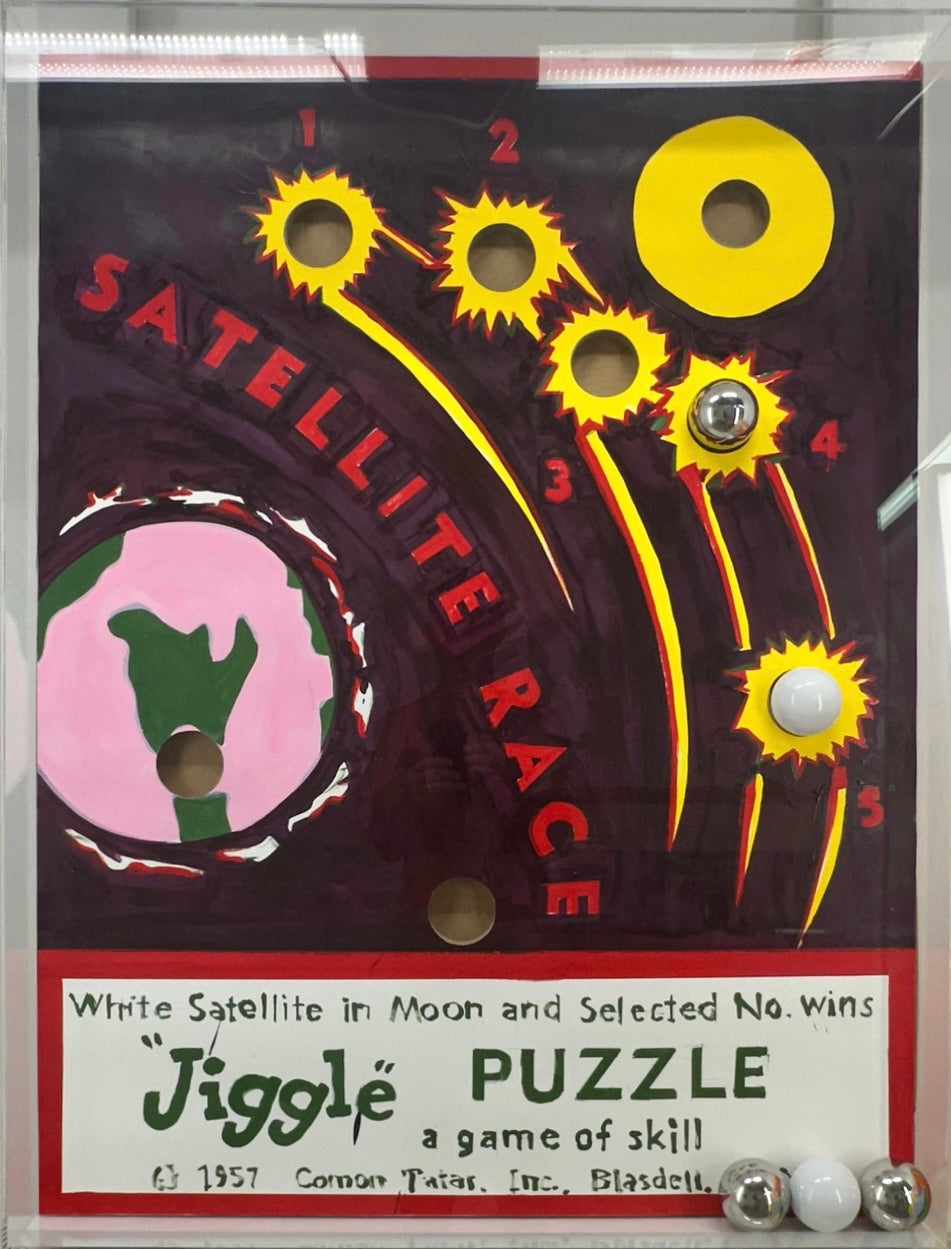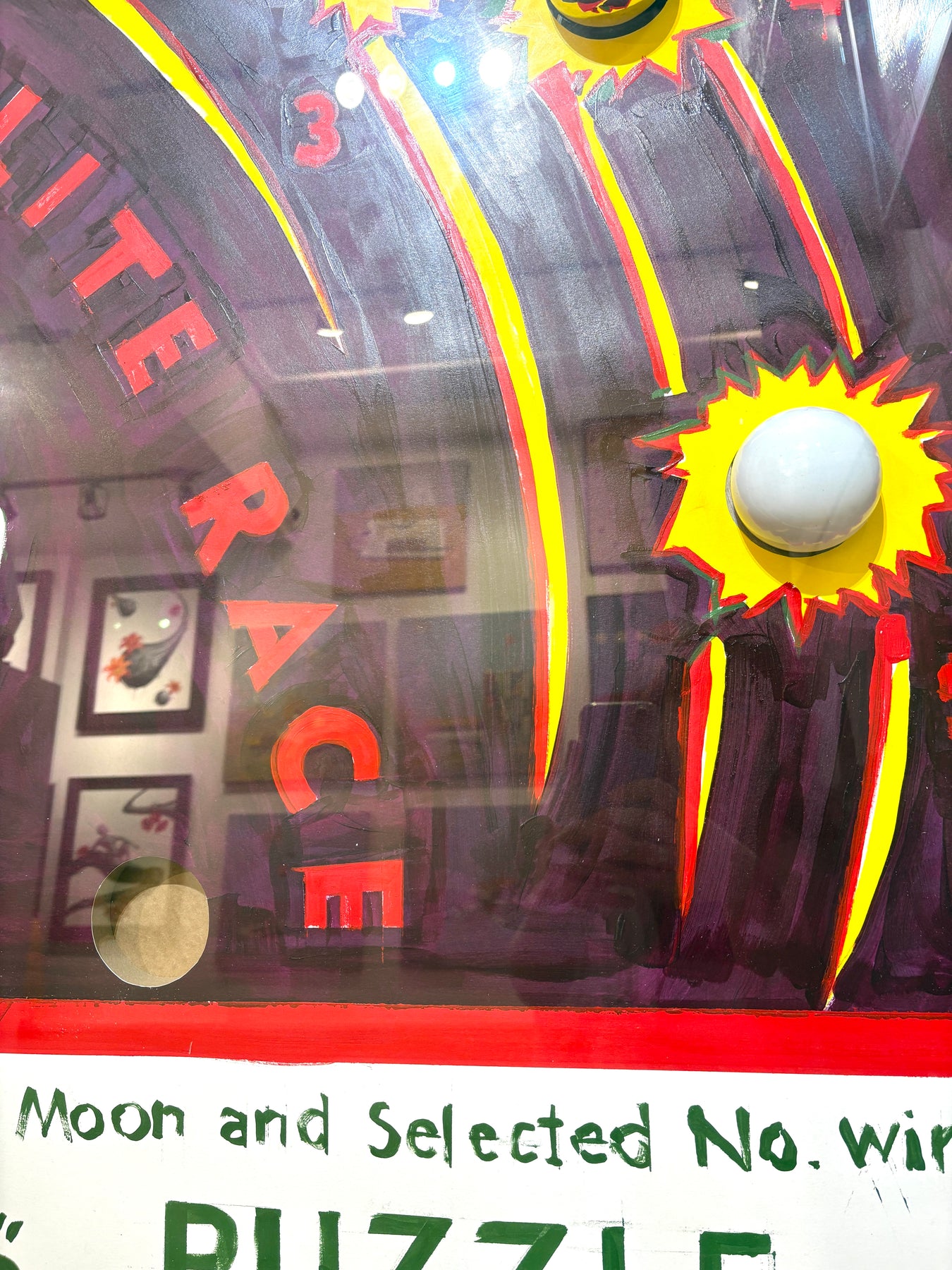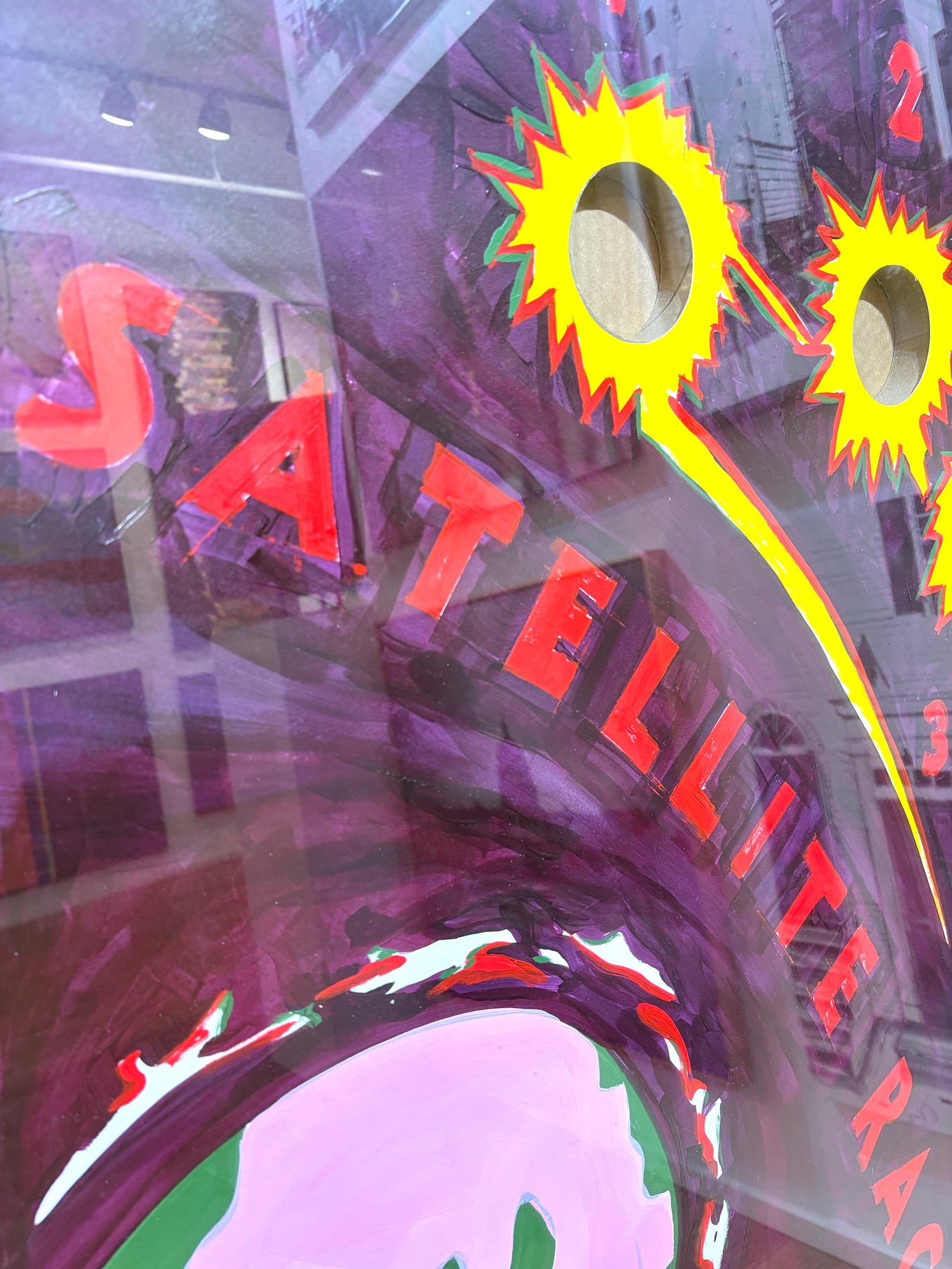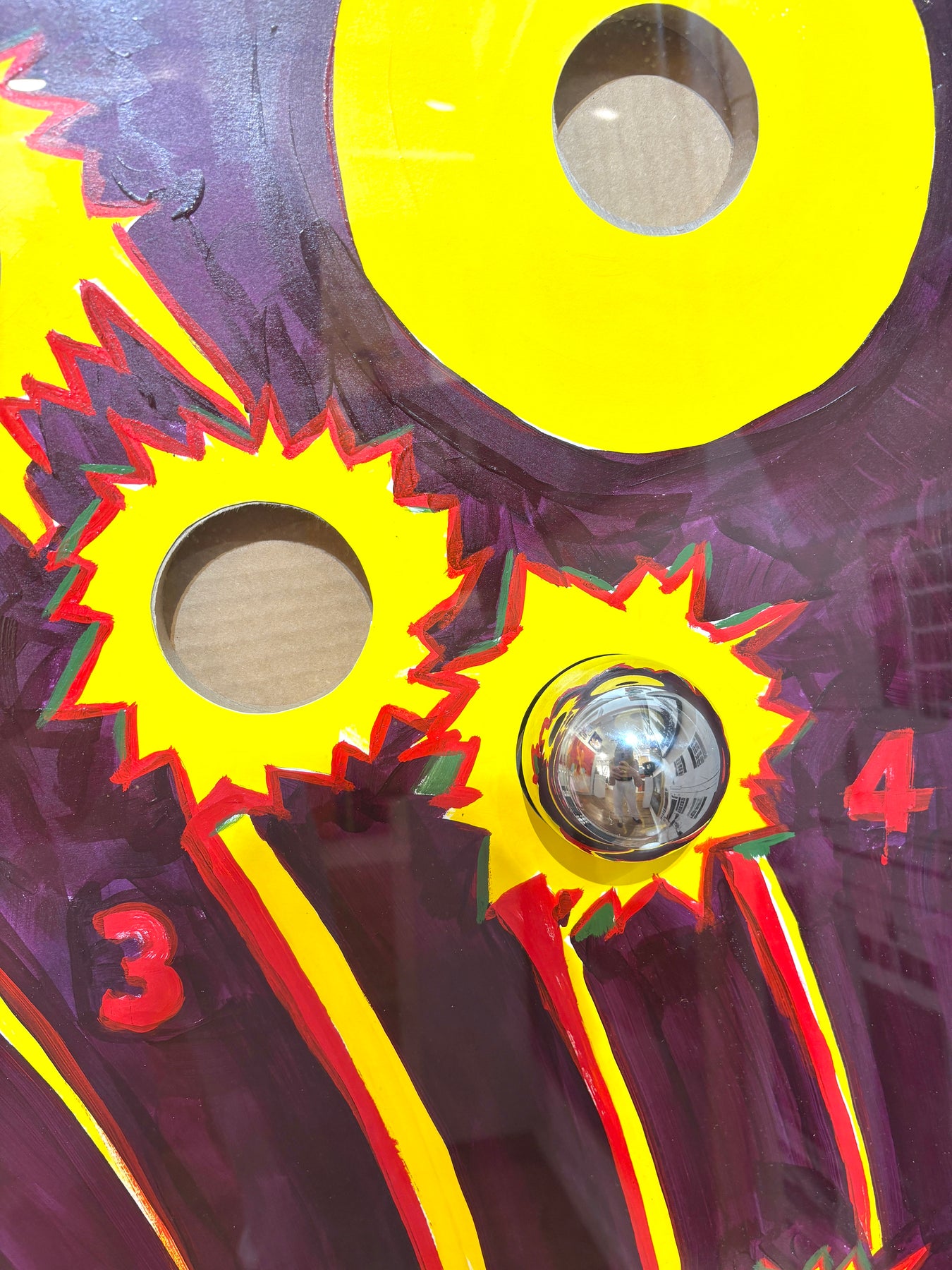 - Acrylics on rag paper, acid free foam board, cardboard, plexiglass, enamel painted chrome spheres, and plywood