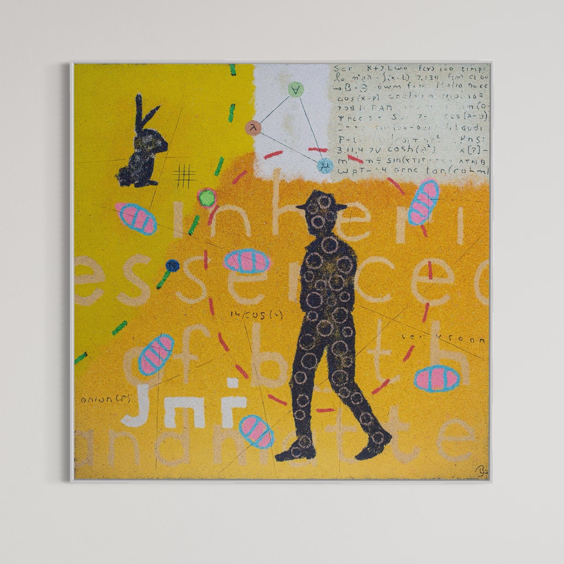 60"x60" abstract piece using crushed volcanic rock and acrylic paint featuring abstract forms over a yellow and orange background.
