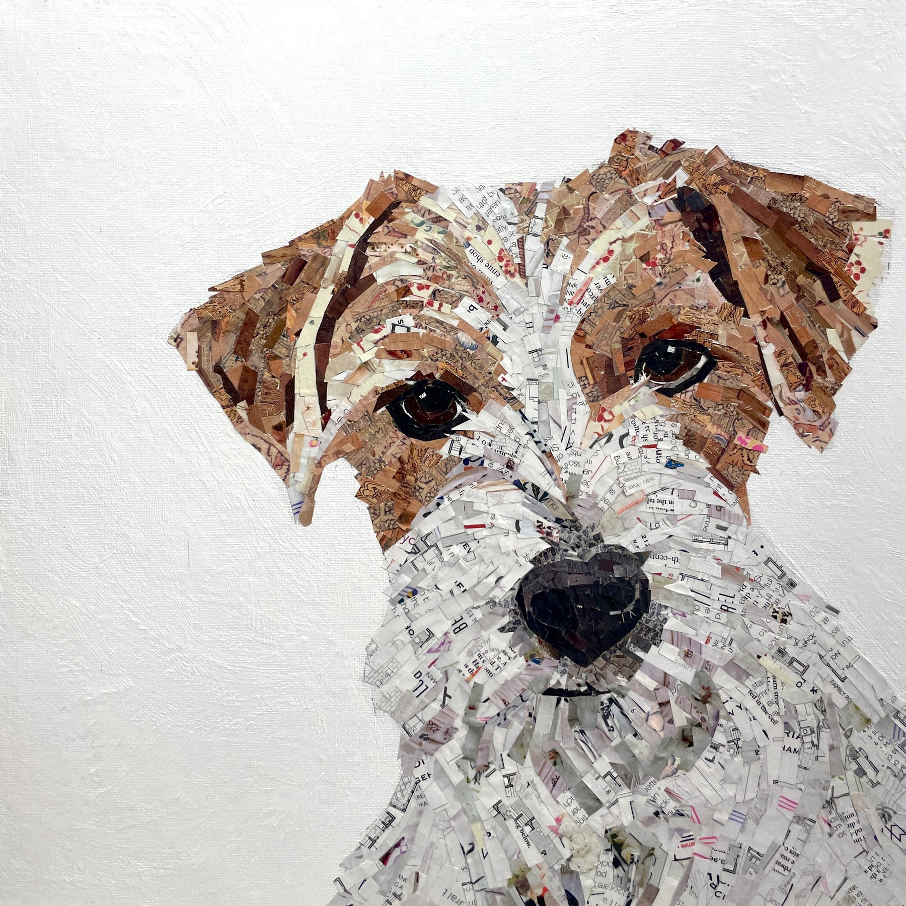 jack russell dog looking at viewer in brown and white made of cut paper magazine collage on white background