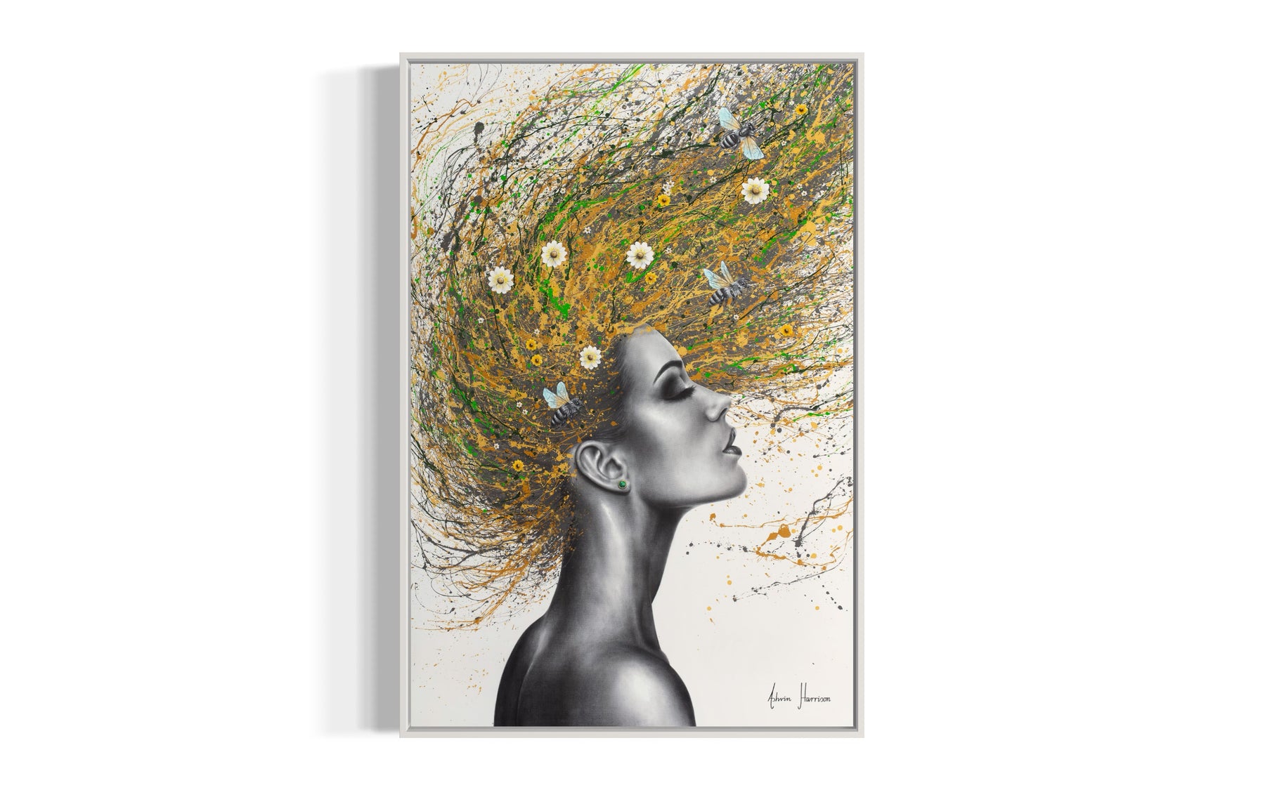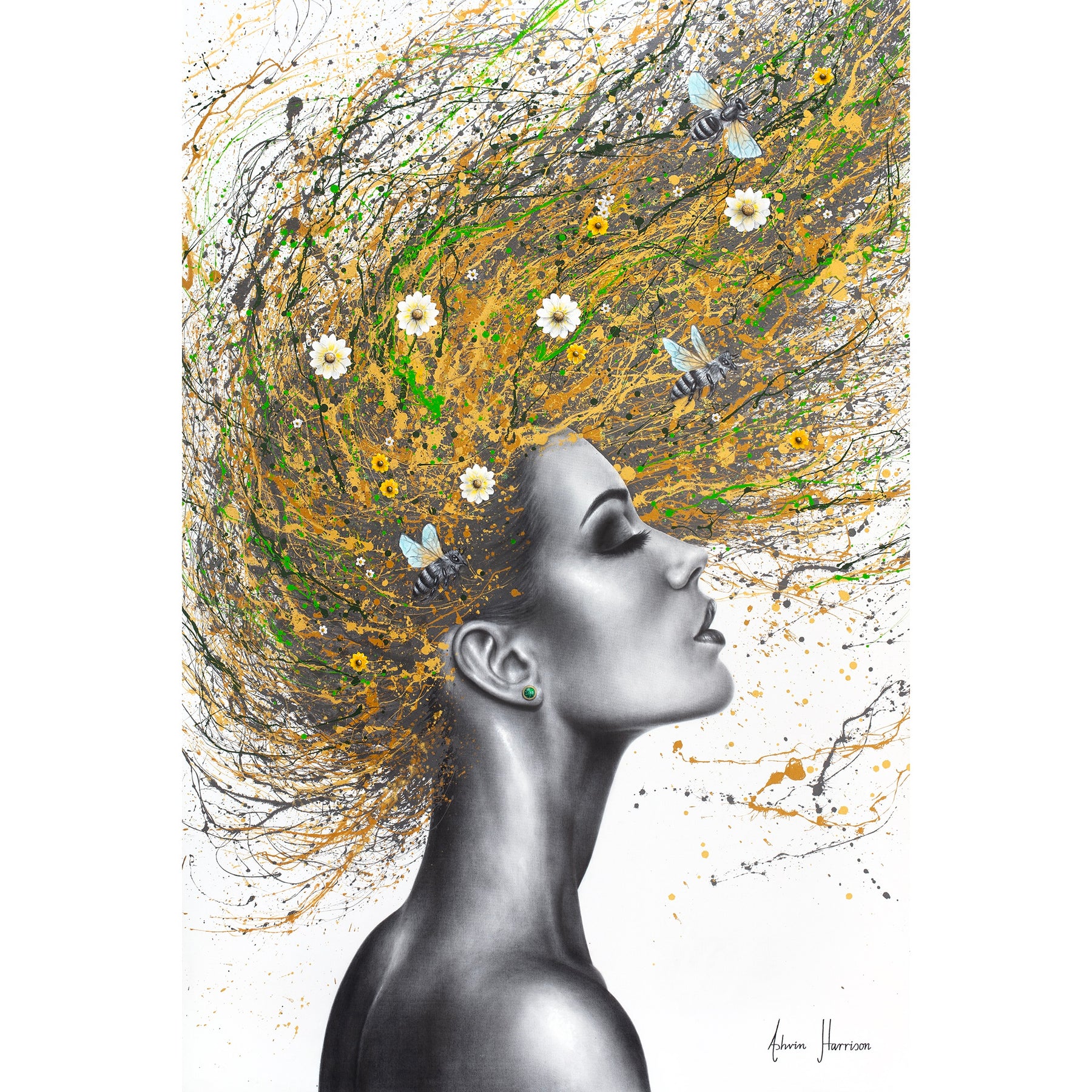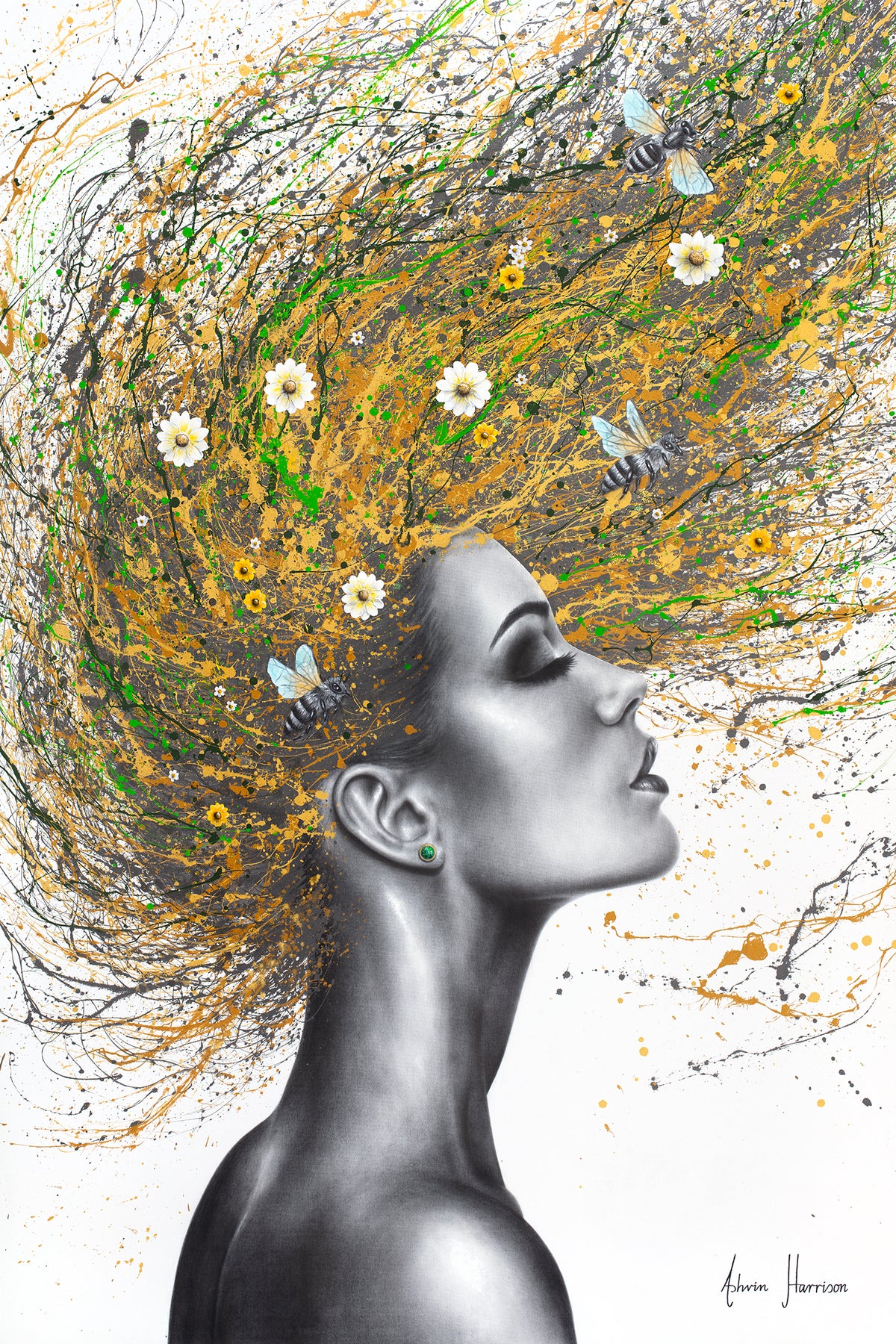 black and white profile womans face and head flipping golden hair back with splatters of green and small daisy flowers and bees in hair on white background