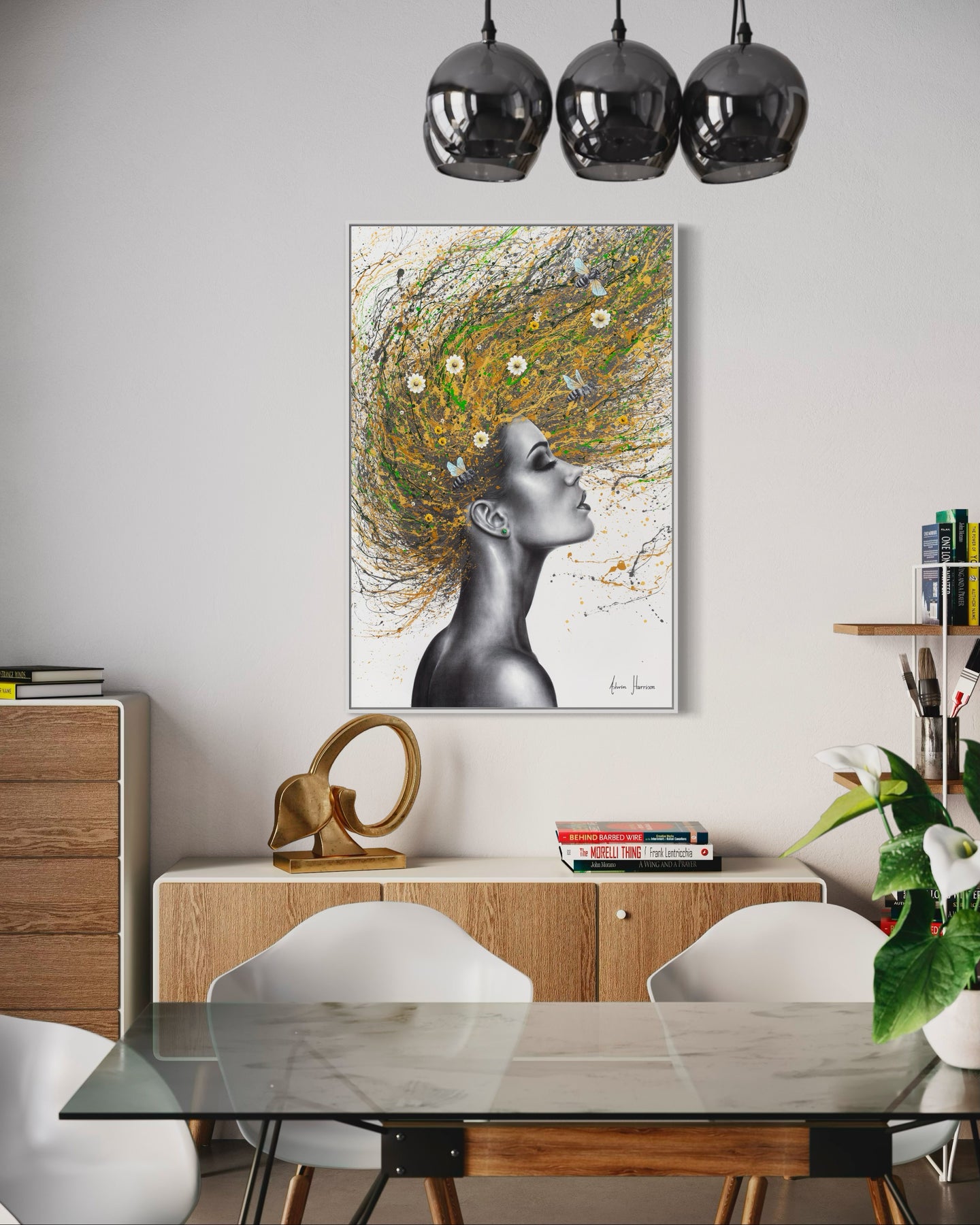 Working with charcoal dust powder, acrylic, and oil, Ashvin Harrison’s contemporary artistic style is so musical that his figures almost literally dance off the canvas. Harrison has come to be known worldwide for his integration of contrasting mediums. The painter begins with the soft, sultry subtlety of brushed charcoal to create sensual, hyper-realistic figures with digital-like precision in black and white -- dancers, hummingbirds, planets, trees, and musical instruments to name the most iconic. From there, Ashvin splatters and paints this initial charcoal with many layers of color, creating a mystical chorus of beauty, sensation, and light.