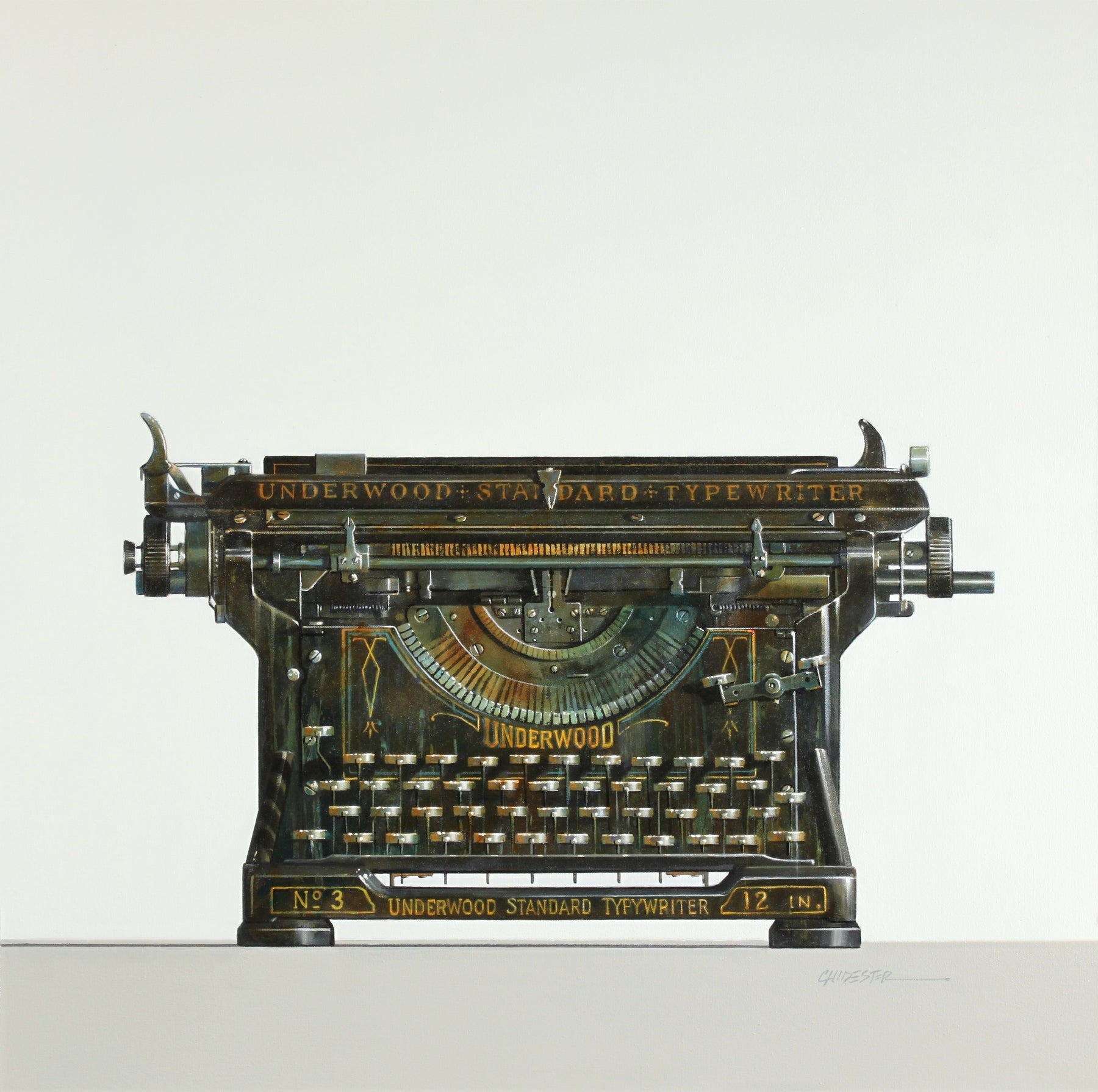 In her gorgeous photo-realistic still-lifes, American oil painter Wendy Chidester pays homage to lost relics of the past. Artifacts like vintage cameras and projectors, 40’s trunk luggage, bubblegum machines, childrens’ pedal cars and tricycles, and old telephones and typewriters are represented nostalgically in her work. She frames these objects as icons, memorializing the color and ingenuity of the past.