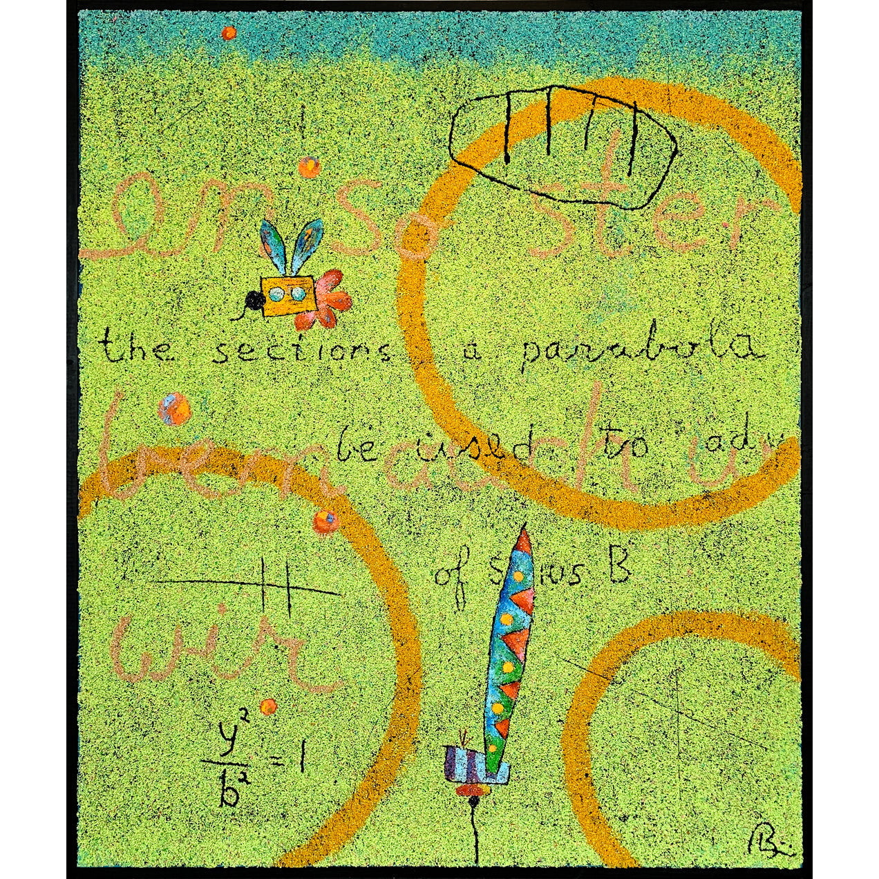 Bob Landström is an artist who primarily works with crushed, pigmented volcanic rock. His abstract paintings, with their highly granulated texture and color combinations, only achieved through such a medium, reconsider our relationship with meaning by eliciting the iconography of ancient languages, science, religions, and mysticism.