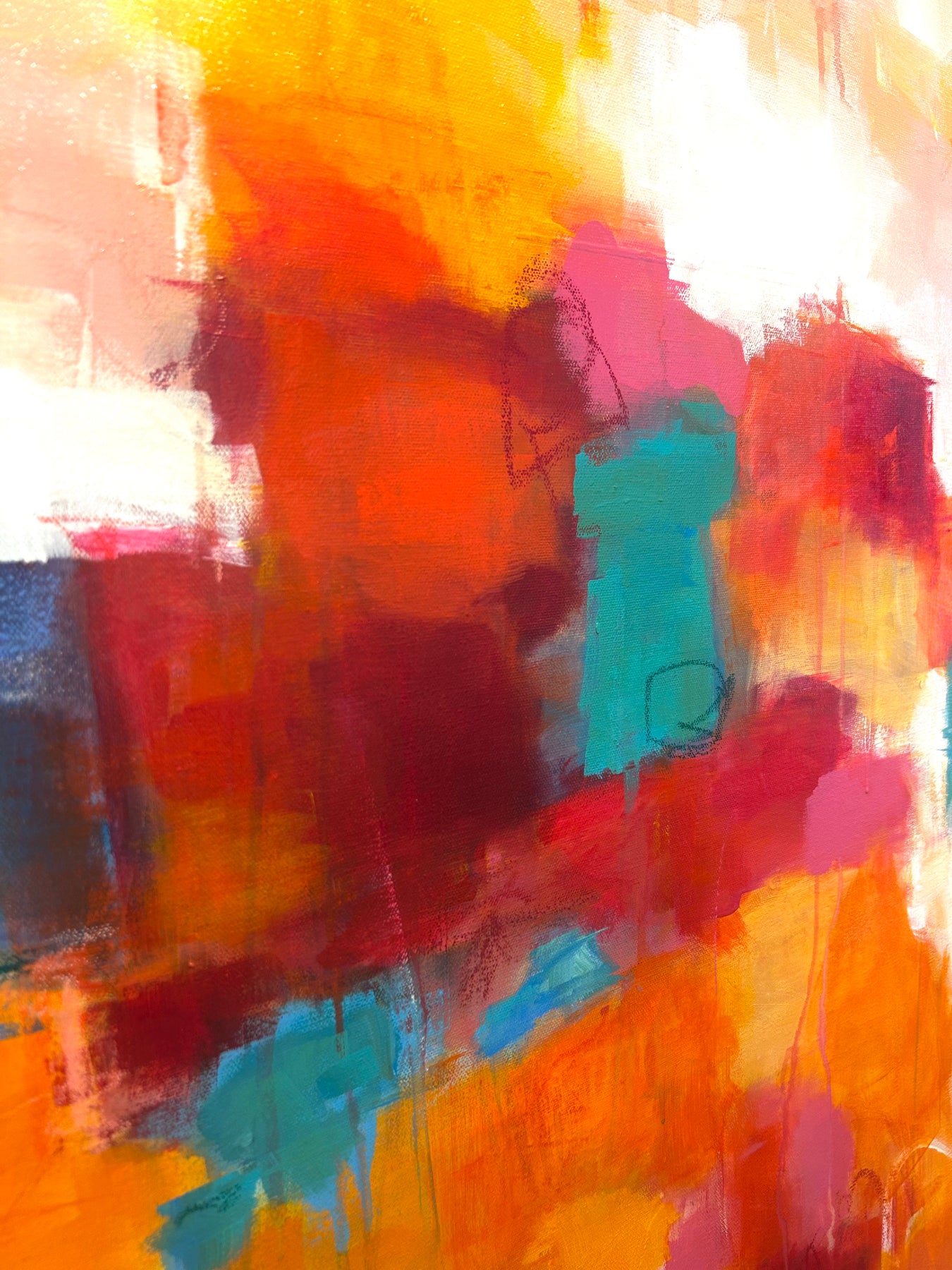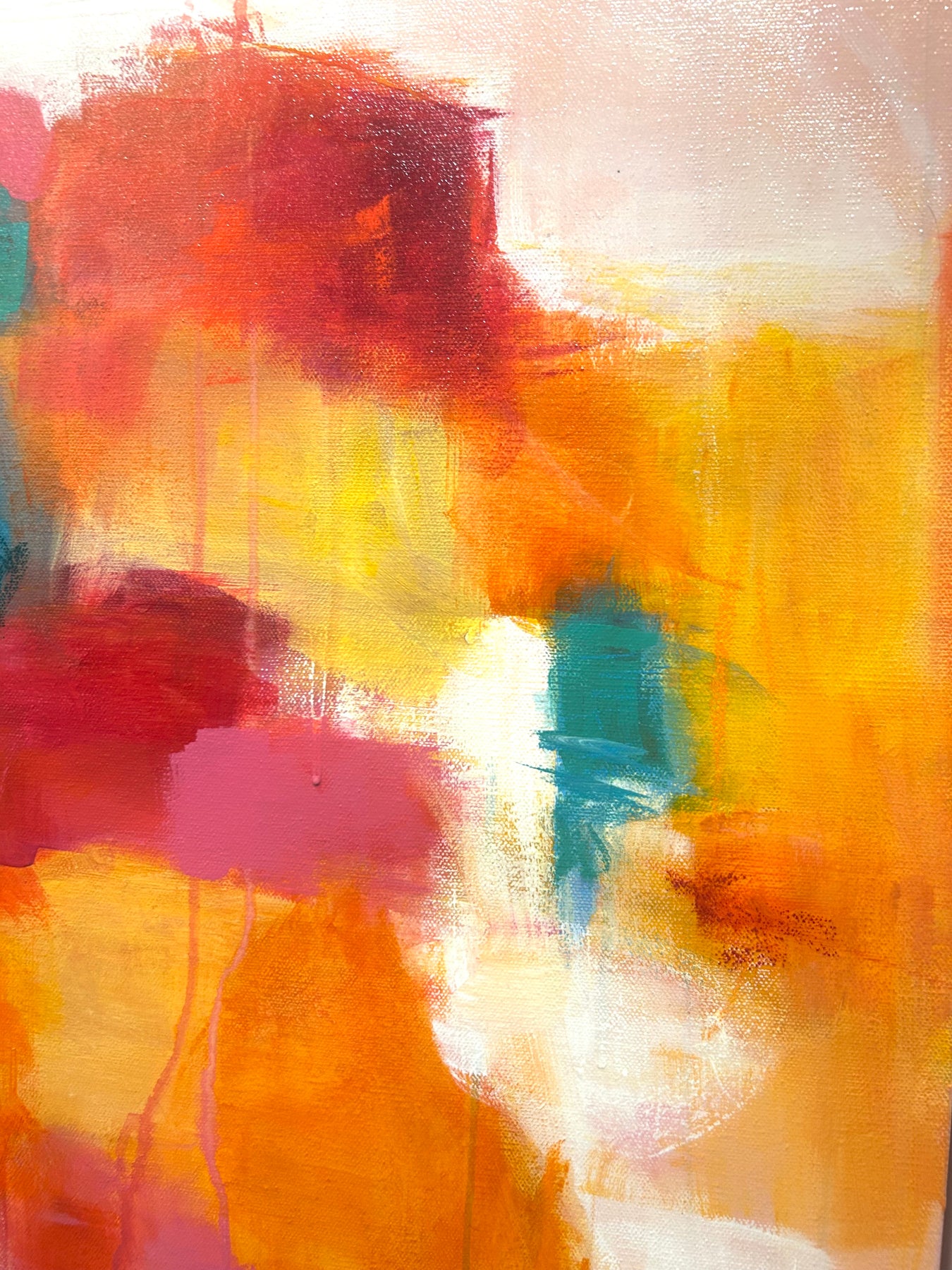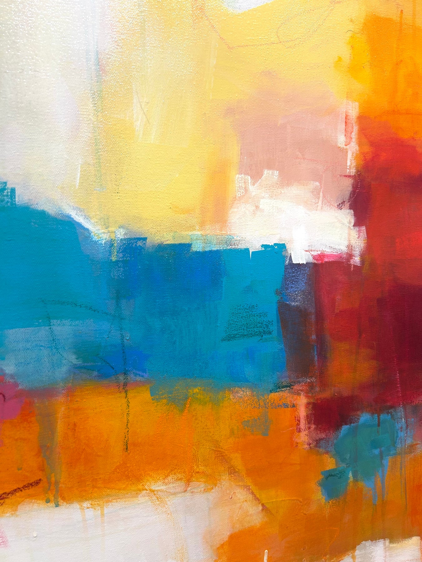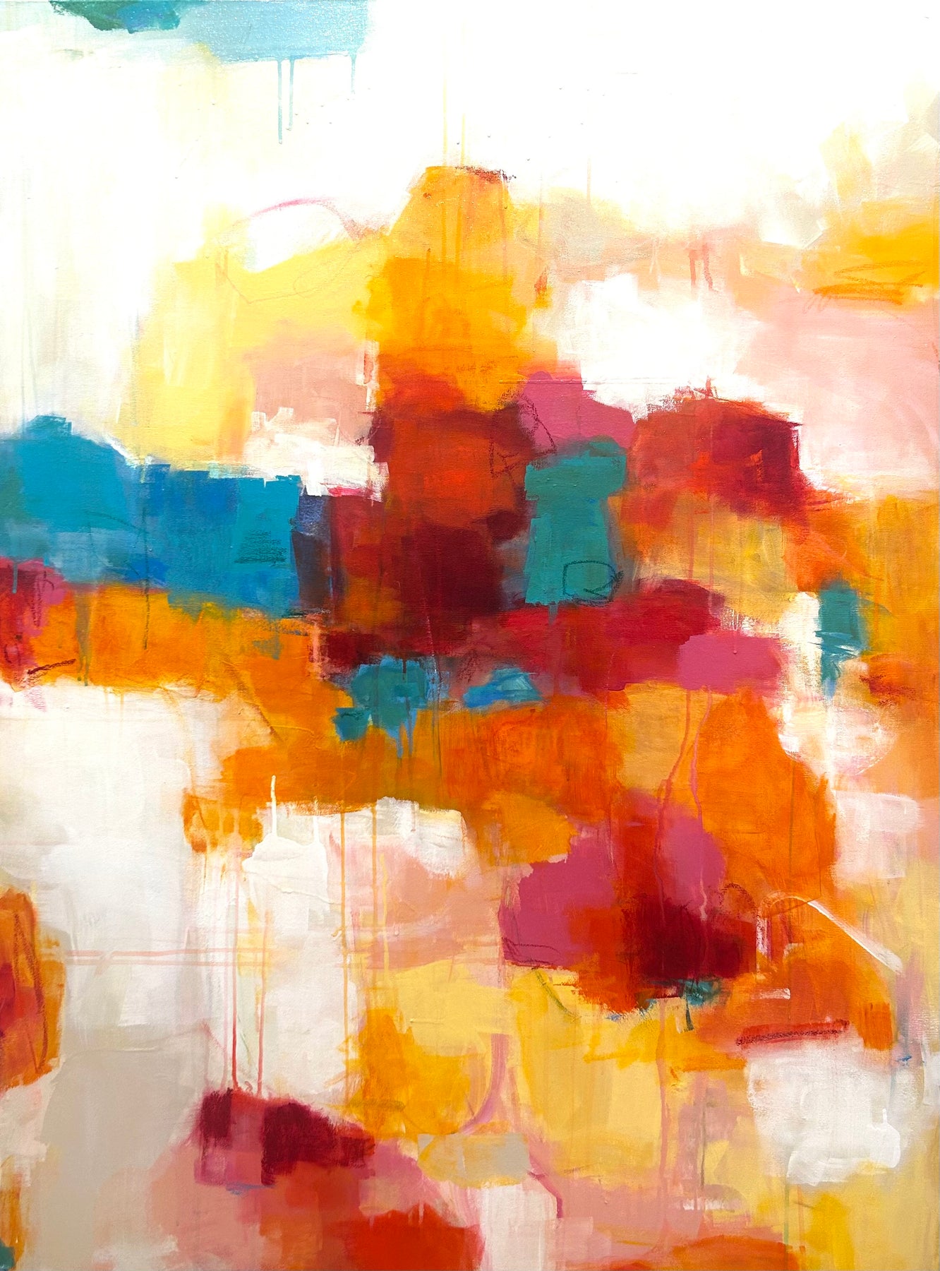 36”W x 48”H abstract acrylic on canvas painting with orange, red, yellow blue and cream.