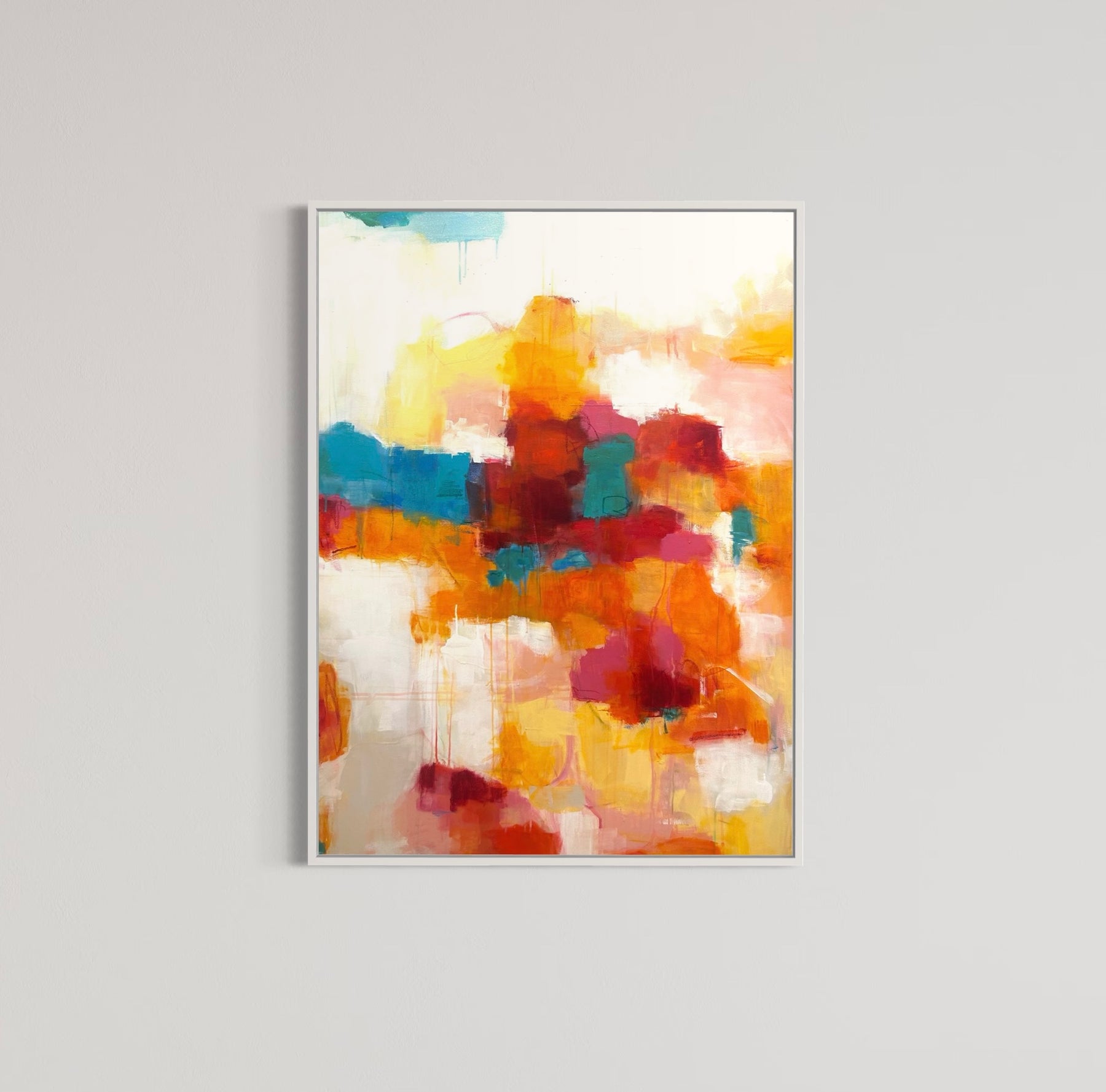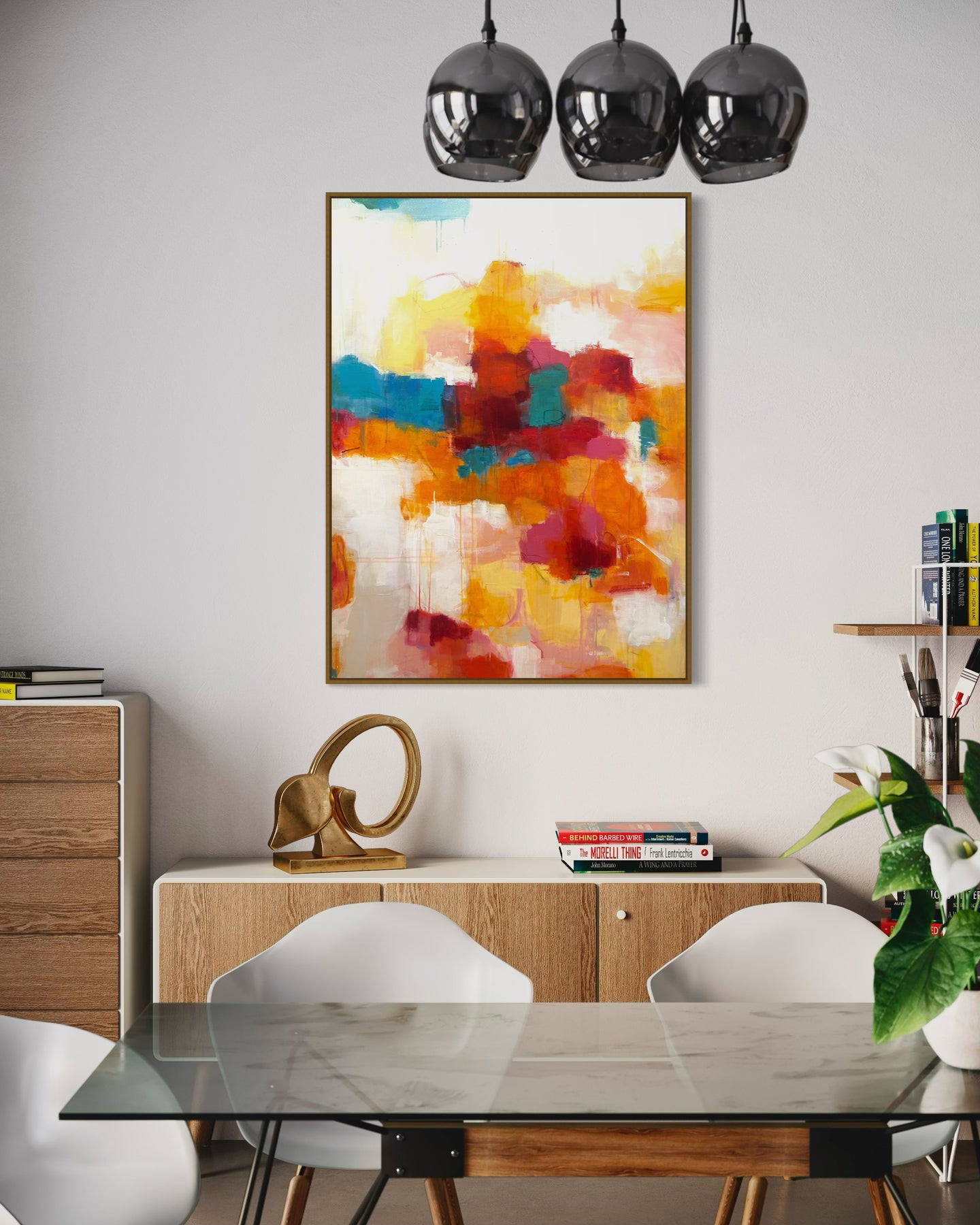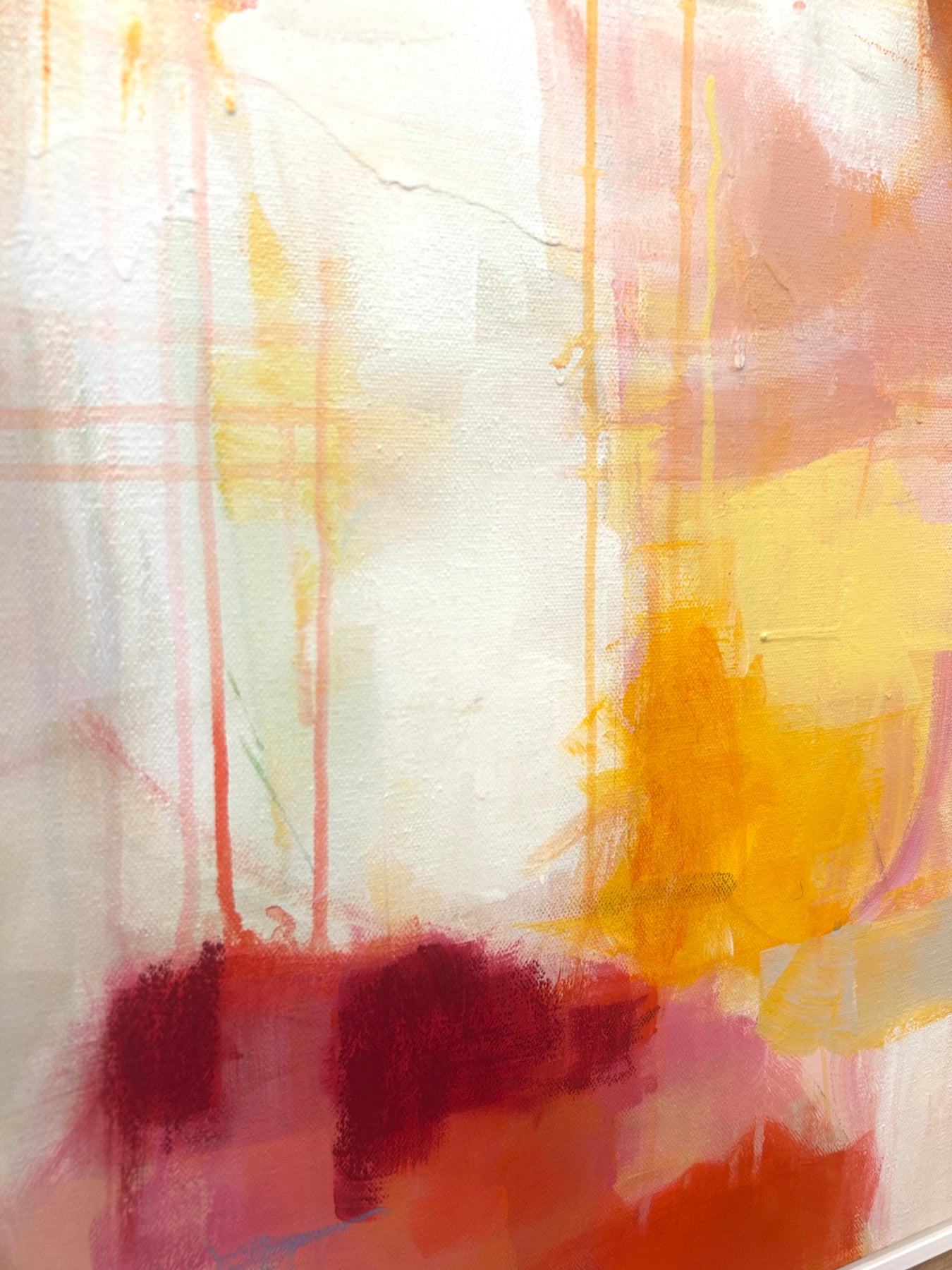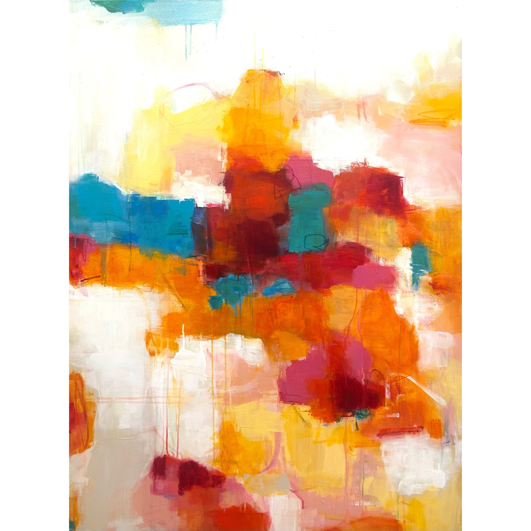 36”W x 48”H abstract acrylic on canvas painting with orange, red, yellow blue and cream.