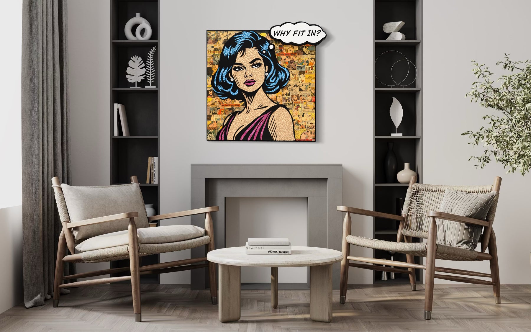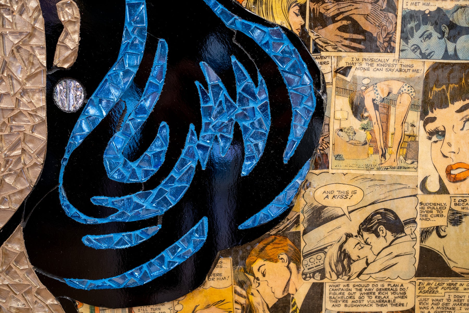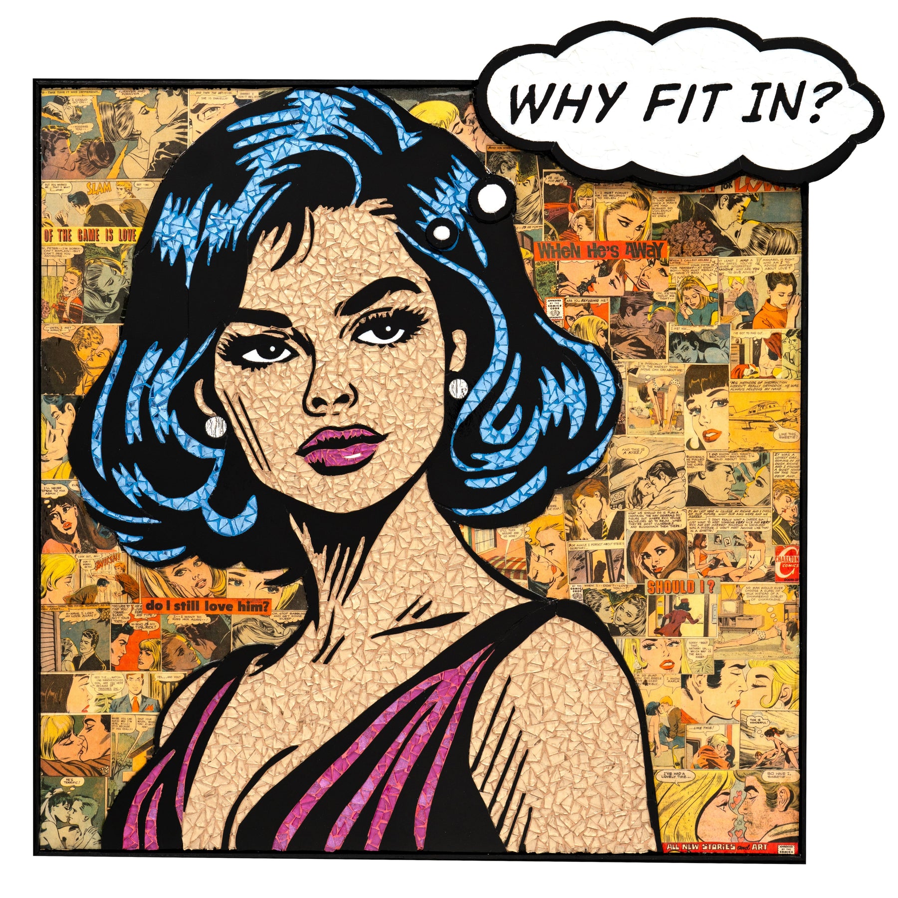 Glass mosaic artwork by Sarah Flishbein of a woman in the style of 60s comic art with a thought bubble saying "why fit in?" with a collage of woman in vintage comics behind her.