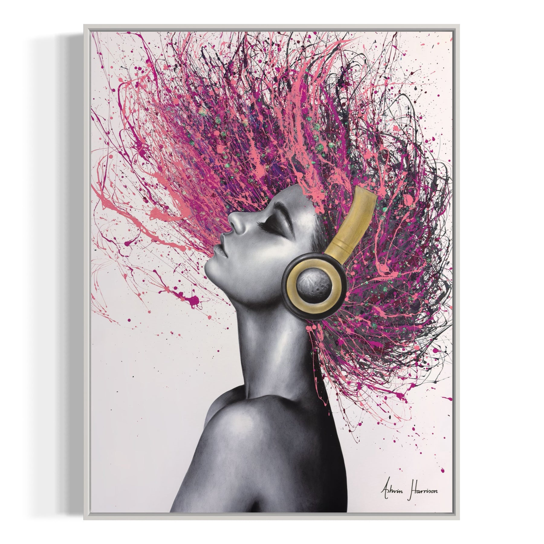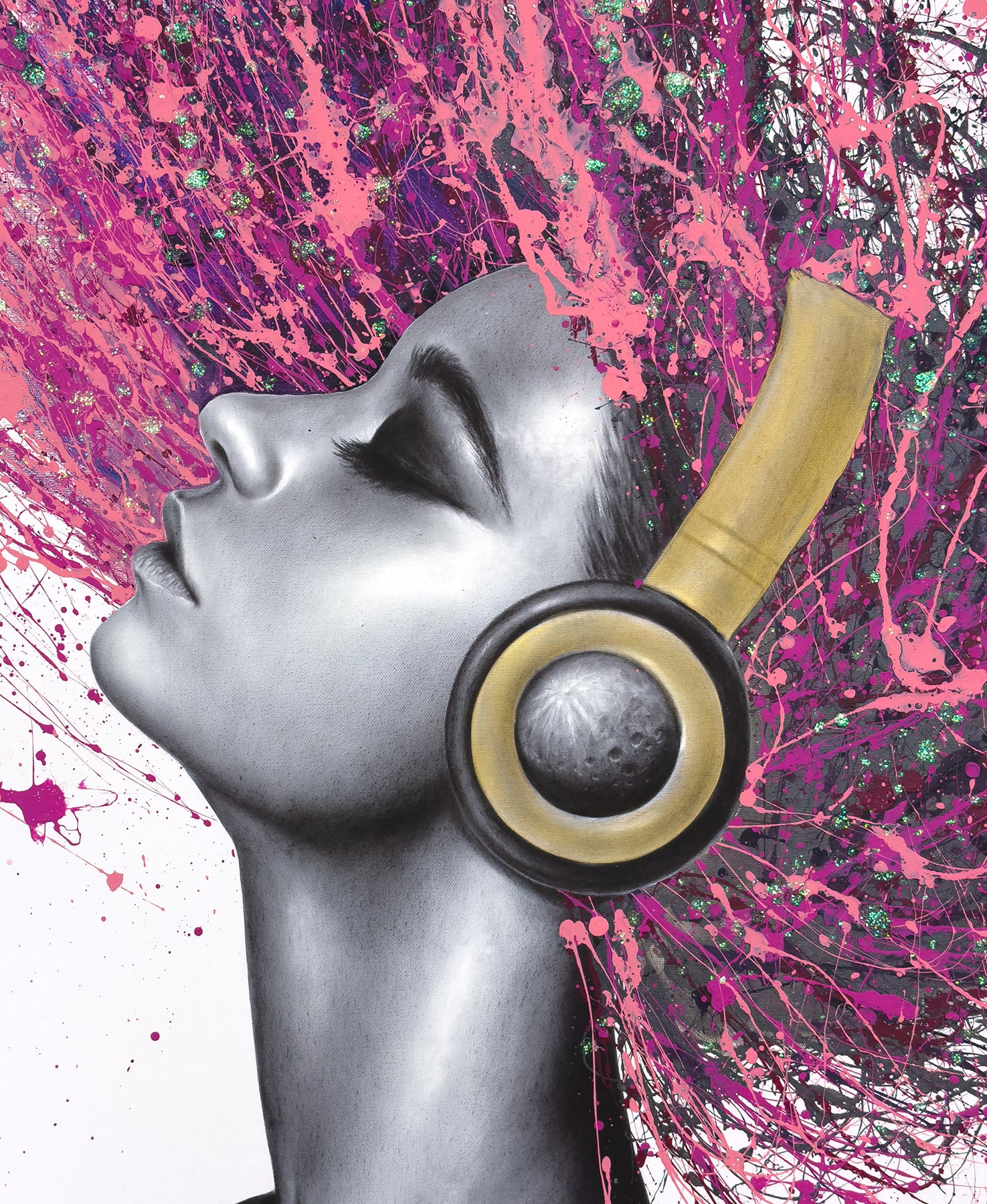 woman profile side view portrait in black and white with hair flipping back with pink acrylic splashes and glitter moon headphones acrylic paint expressionism