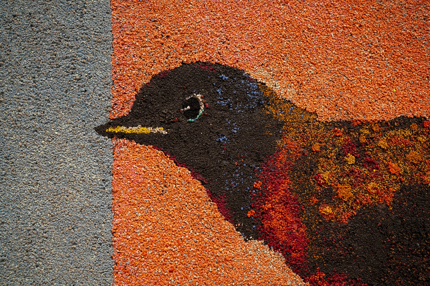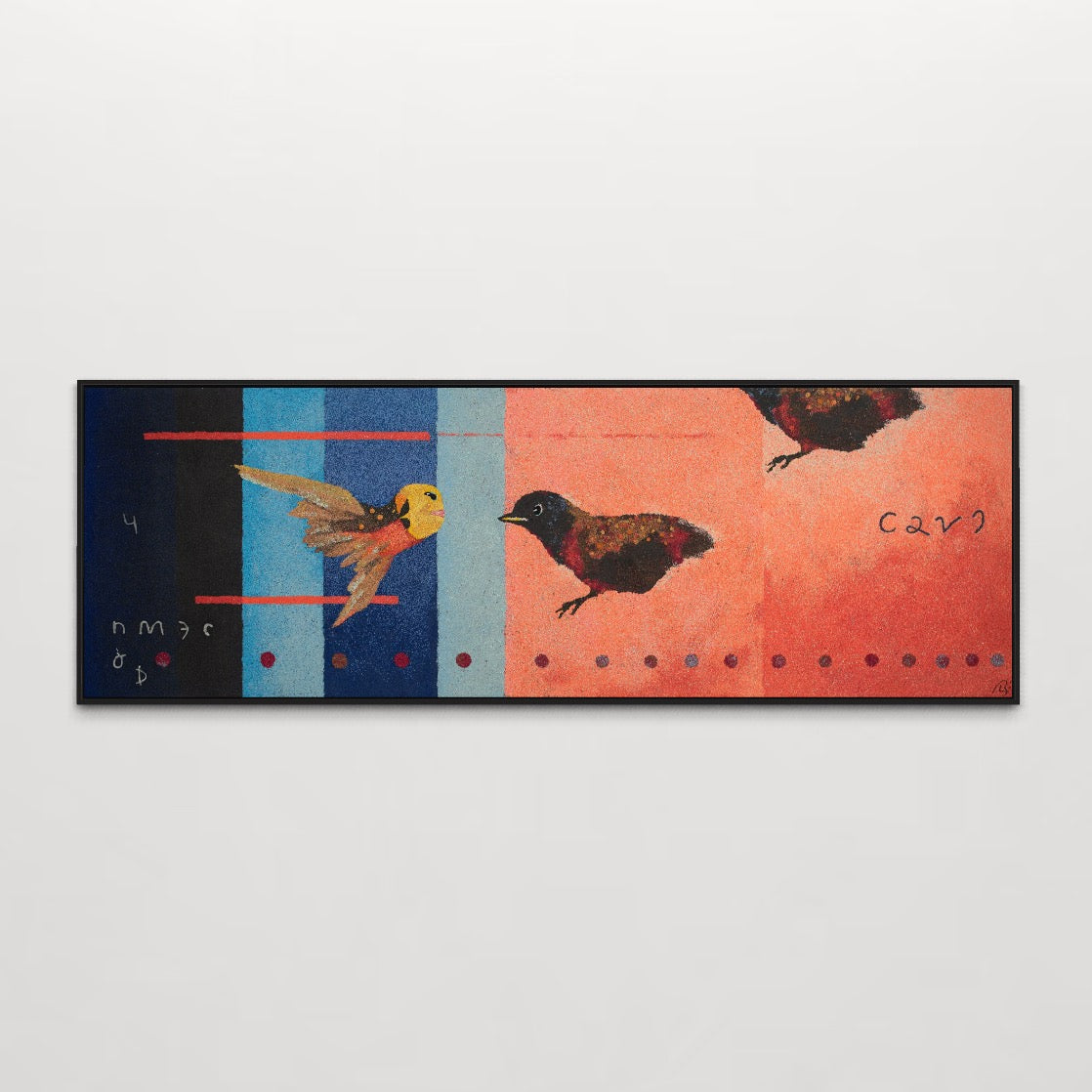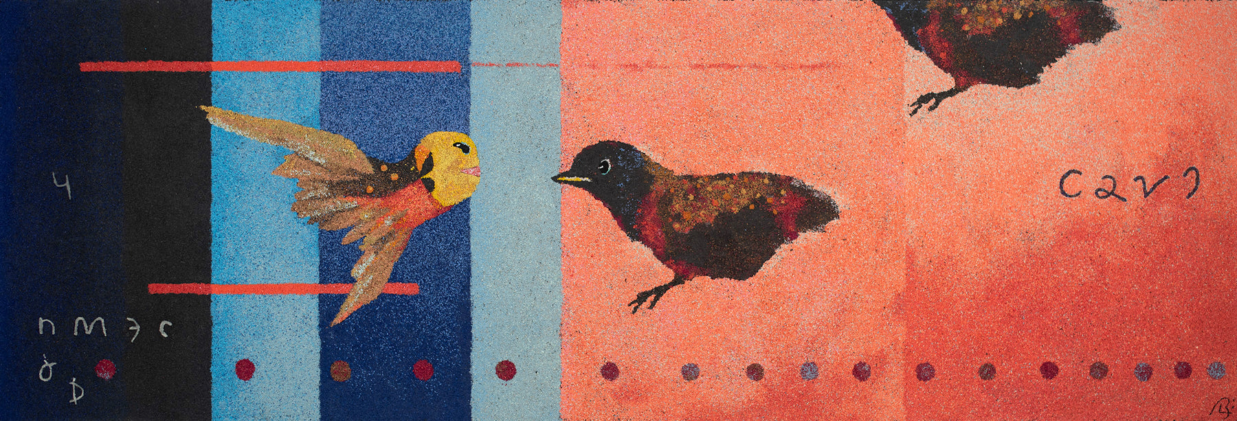 Bob Landström is an artist who primarily works with crushed, pigmented volcanic rock. His abstract paintings, with their highly granulated texture and color combinations, only achieved through such a medium, reconsider our relationship with meaning by eliciting the iconography of ancient languages, science, religions, and mysticism.