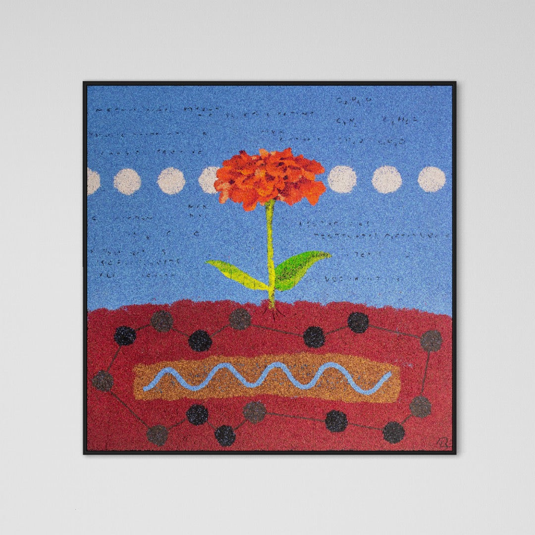 Bob Landström is an artist who primarily works with crushed, pigmented volcanic rock. His abstract paintings, with their highly granulated texture and color combinations, only achieved through such a medium, reconsider our relationship with meaning by eliciting the iconography of ancient languages, science, religions, and mysticism.
