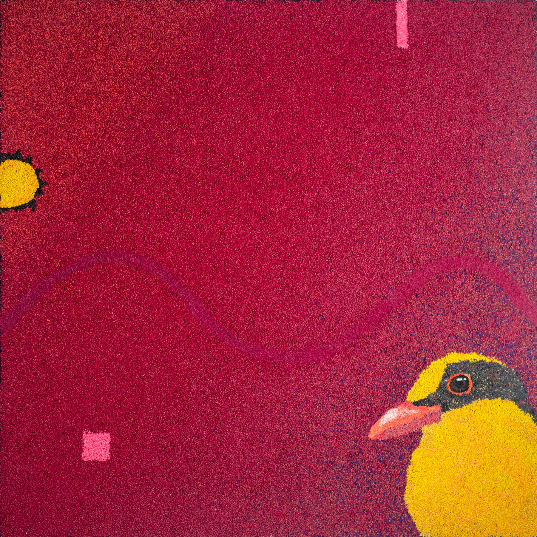 30"x30" abstract piece using crushed volcanic rock and acrylic paint with a bird and abstract forms over a red background.