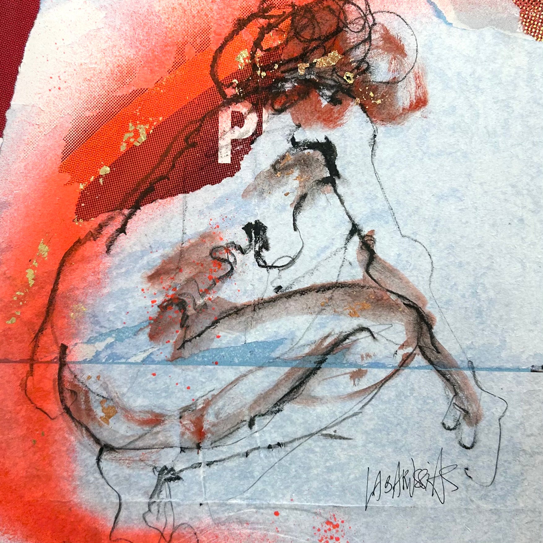 French figurative artist Corinne Labarussias seeks to reveal human desire and form in her delicate watercolor, charcoal, and gold leaf nudes. These totally unique romantic portraits offer a lens of distortion that resists convention. Her characters are erotic and psychological, beautiful and raw. Labarussias conceives of her drawings as a spontaneous dance, with rhythm and movement, captured in a moment, then frozen in time. Her use of recycled materials like old magazines and handmade paper texturize her work in a powerful multi-dimensional way.