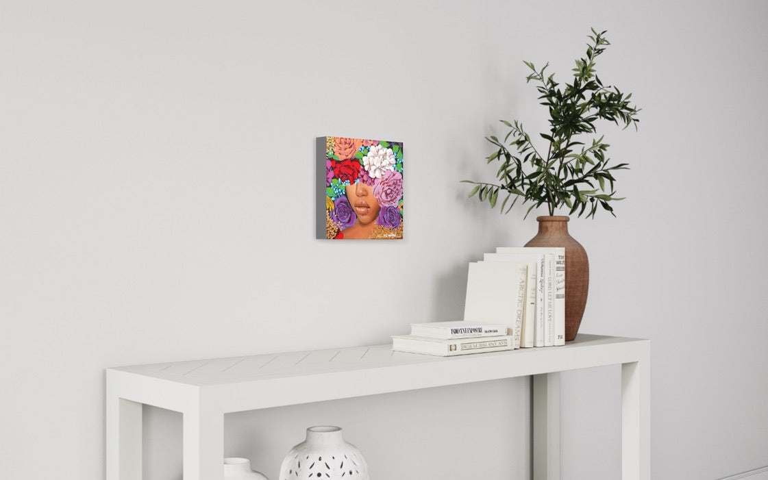 In Full Bloom III, artwork by Sally K., displayed in a home. Acrylic paint on canvas. 12 by 12 inches.