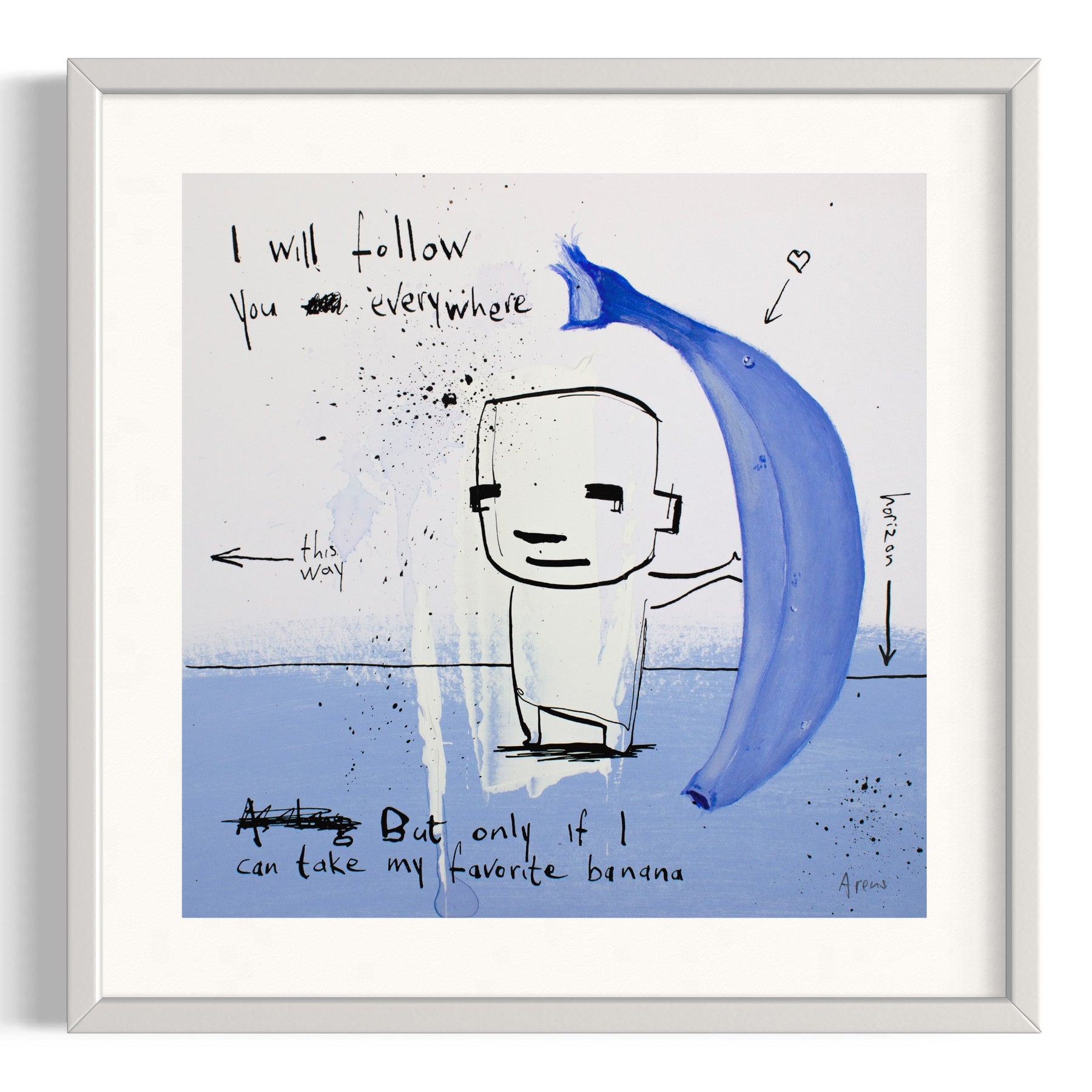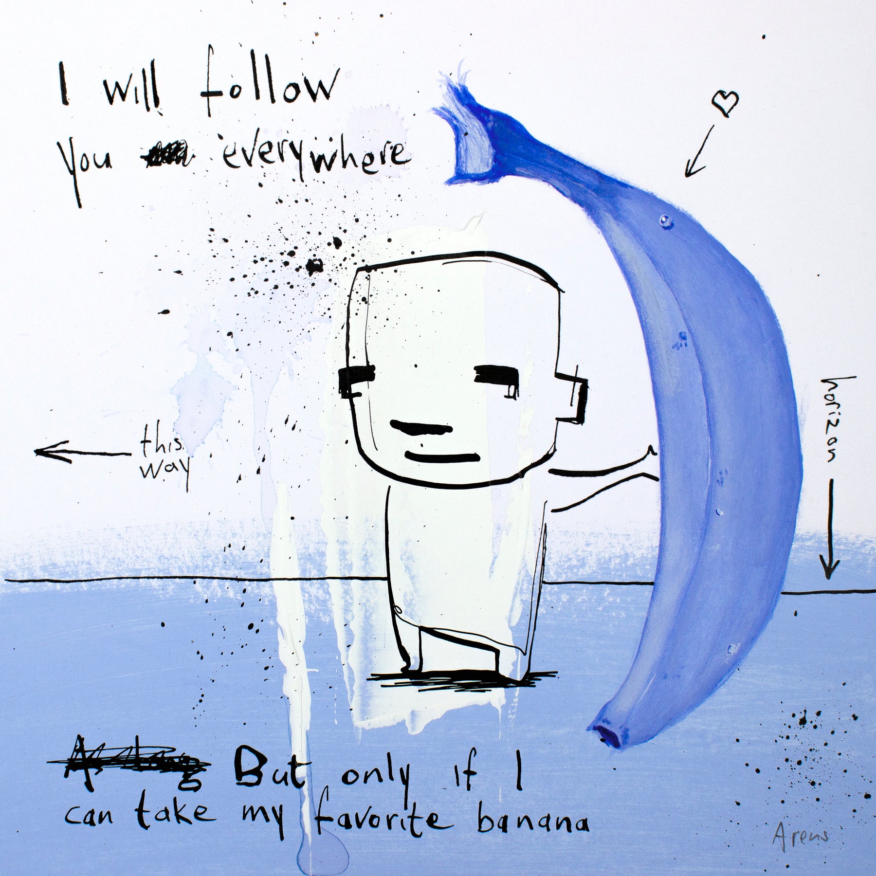 doodle sketch figure holding a large life size blue banana with handwritten text, ink splatter and paint on a blue and white background