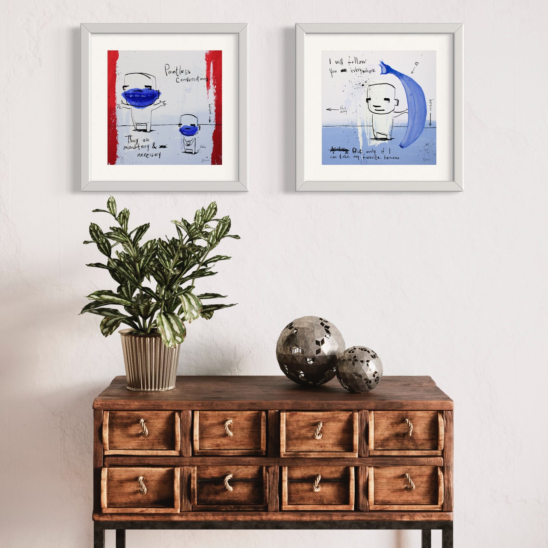 Concentrating on universally understood needs and emotions, Dutch artist Jan-Hein Arens is able to connect with every viewer and admirer of his works. Arens brings together humor and alienation through his paintings. The forefront is typically centered on a simplified figure and text that almost appears to be the thoughts of the figure. Often realistic drawings of body parts, common everyday objects or products are superimposed onto the foreground. Each piece is augmented with additional handwritten text detailing certain aspects of the piece in a comical tone. Paint splatters and rough brushstrokes fill out the remaining space in the paintings, allowing the figures and text to be the focus of each well-thought-out illustration.