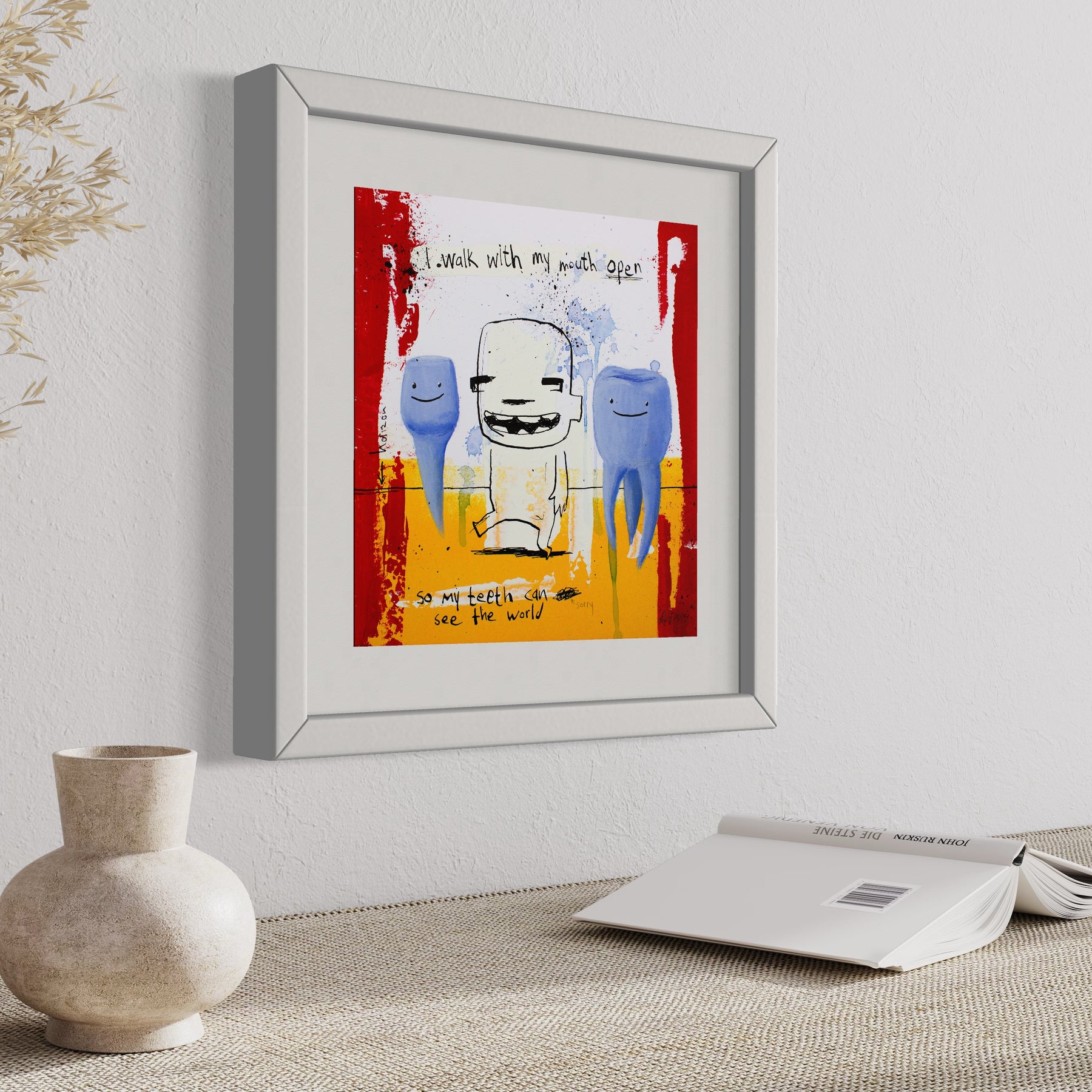 doodle sketched character with moth open and teeth showing, walking along side two blue teeth with smiley faces, hand written text, ink splatter, on a yellow, red and white background
