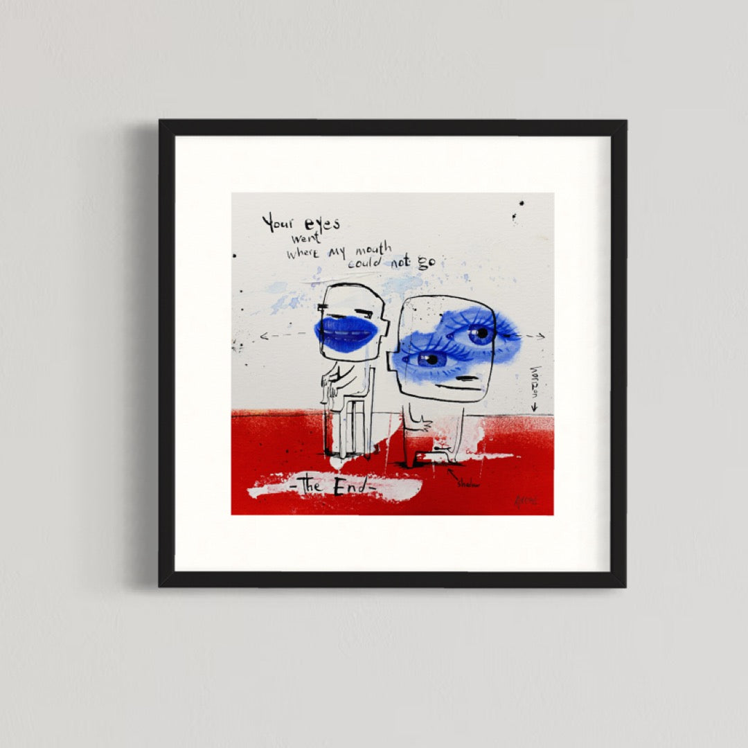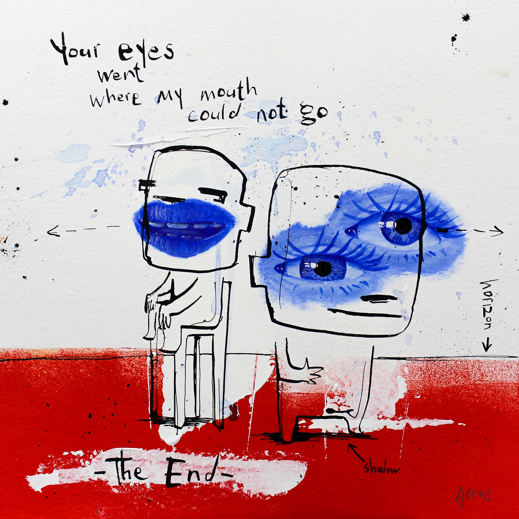 Concentrating on universally understood needs and emotions, Dutch artist Jan-Hein Arens is able to connect with every viewer and admirer of his works. Arens brings together humor and alienation through his paintings. The forefront is typically centered on a simplified figure and text that almost appears to be the thoughts of the figure. Often realistic drawings of body parts, common everyday objects or products are superimposed onto the foreground. Each piece is augmented with additional handwritten text detailing certain aspects of the piece in a comical tone. Paint splatters and rough brushstrokes fill out the remaining space in the paintings, allowing the figures and text to be the focus of each well-thought-out illustration.