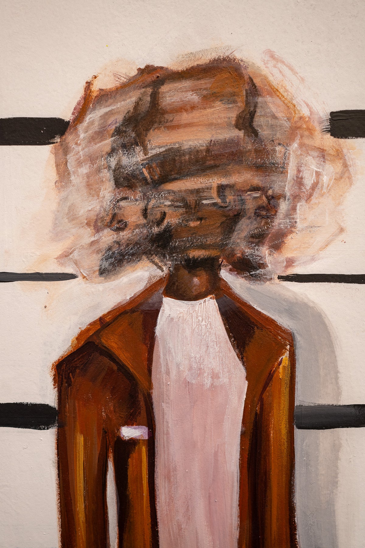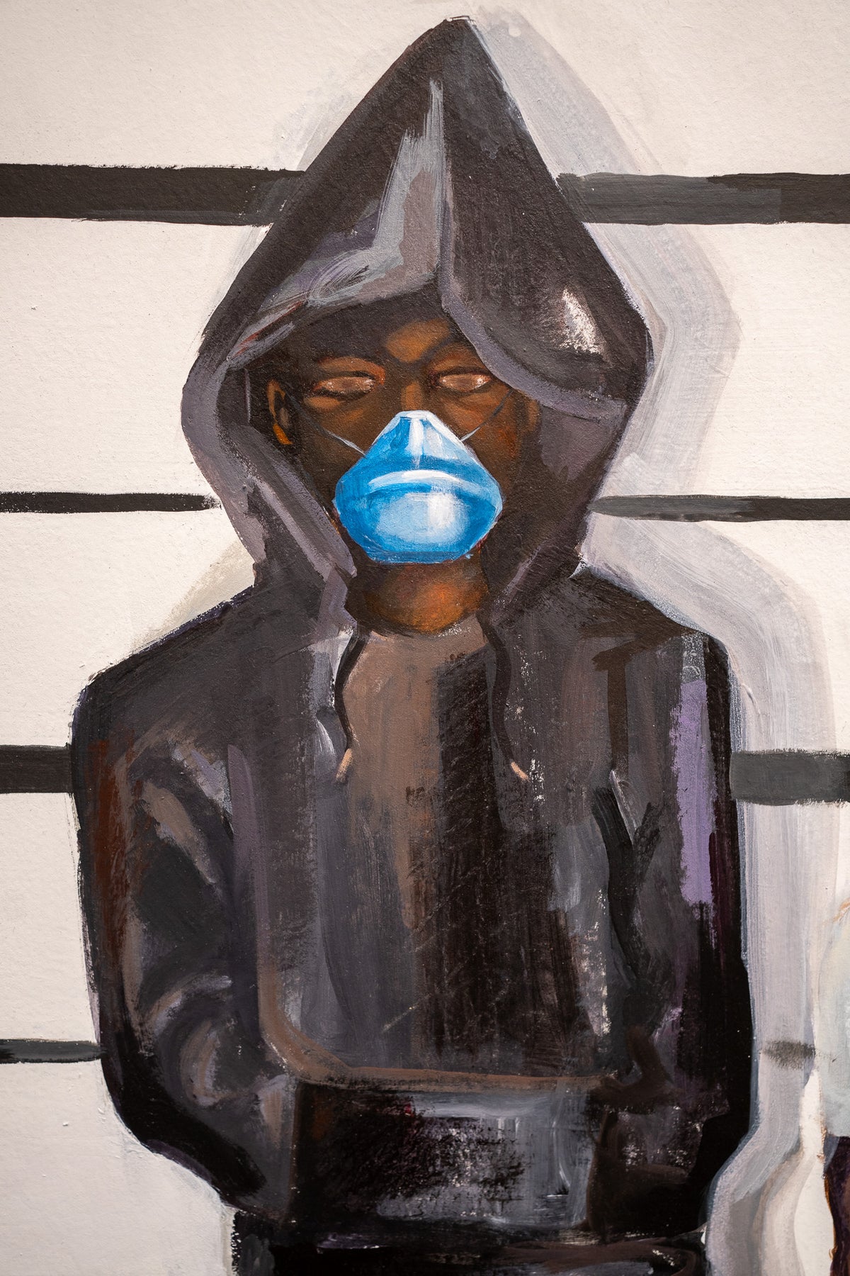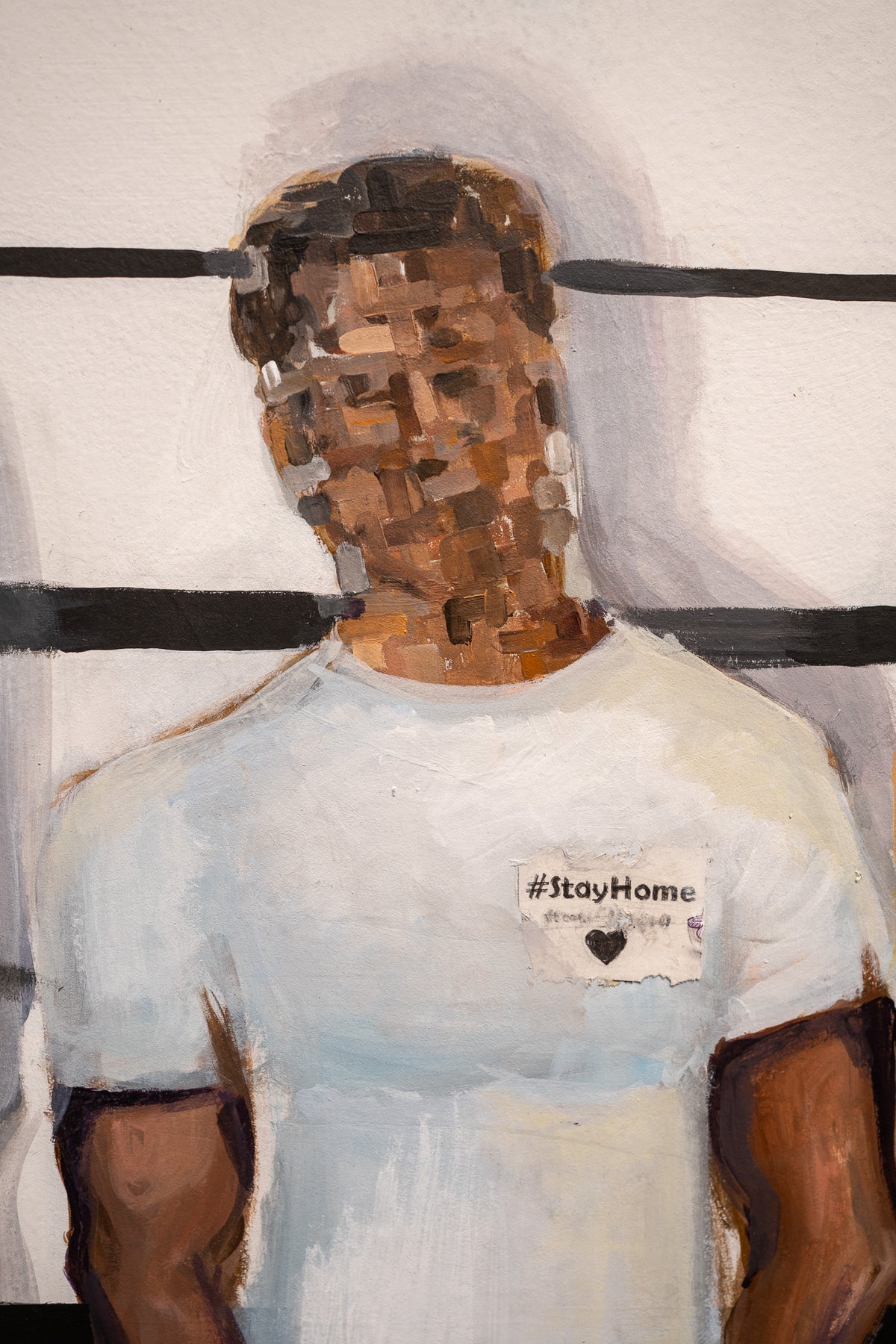 Acrylic Painting and Collage on Parachute Paper by Keith Andrews of a five individual in a prison line up with their face blurred. 54"x54". Bright green and blue foreground