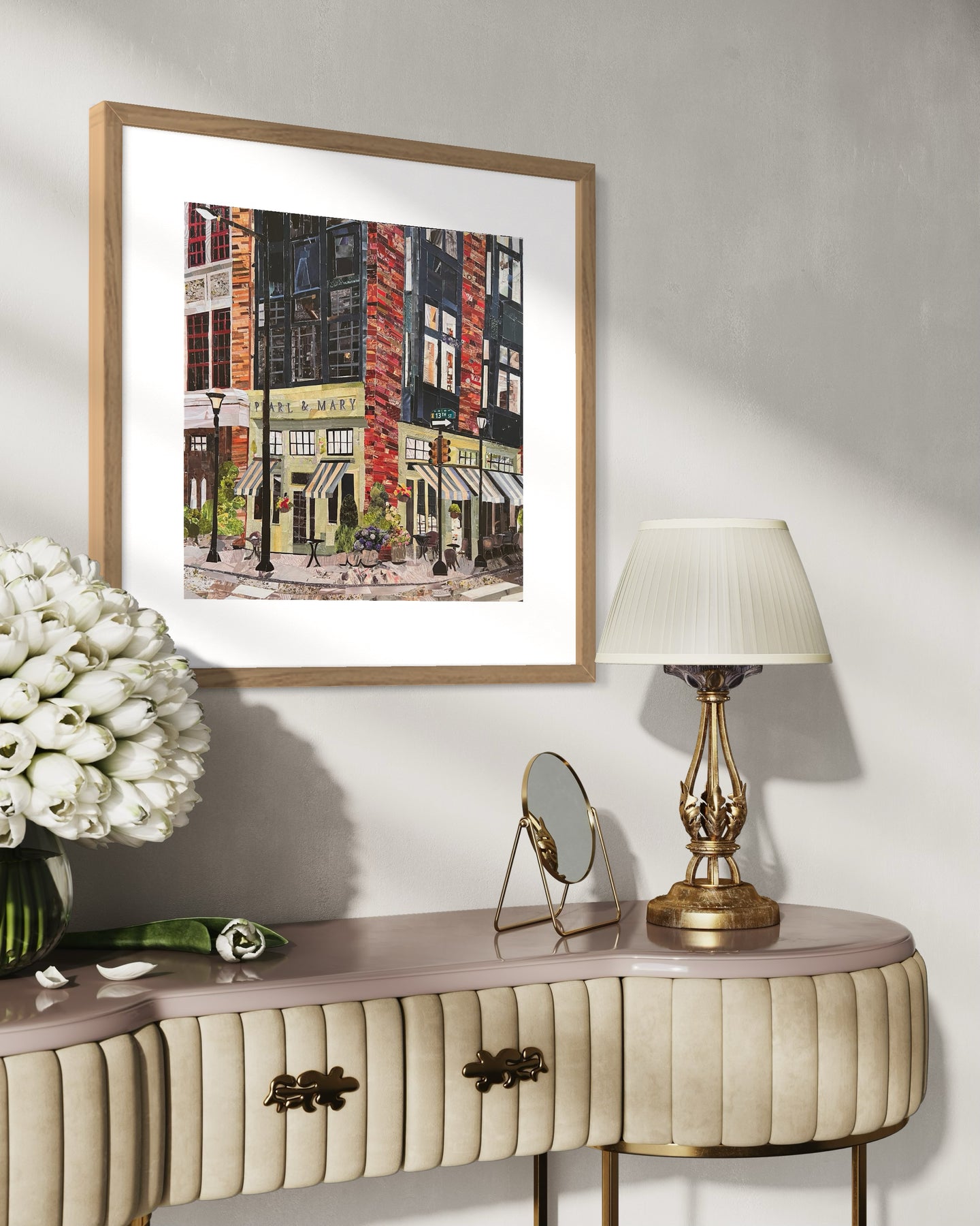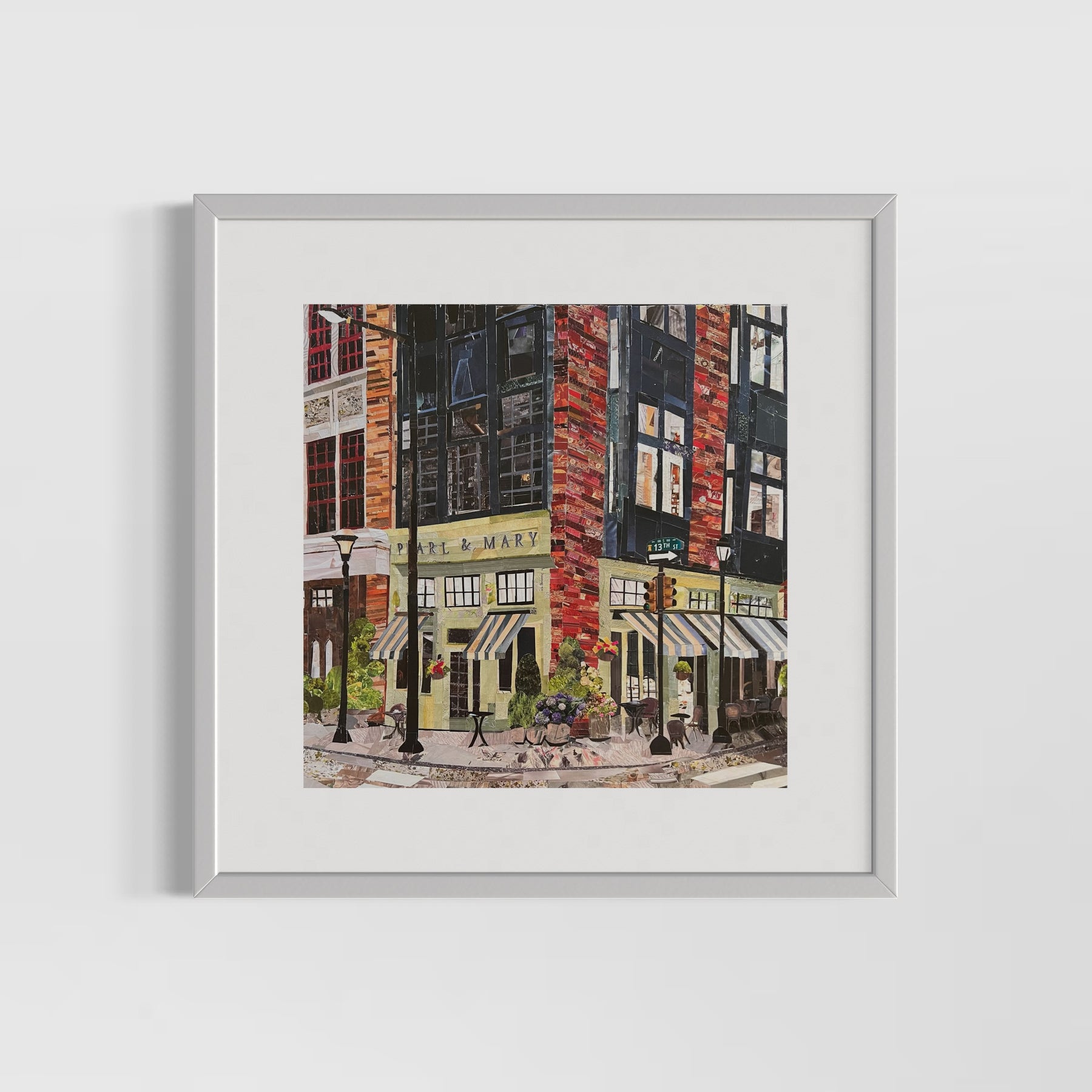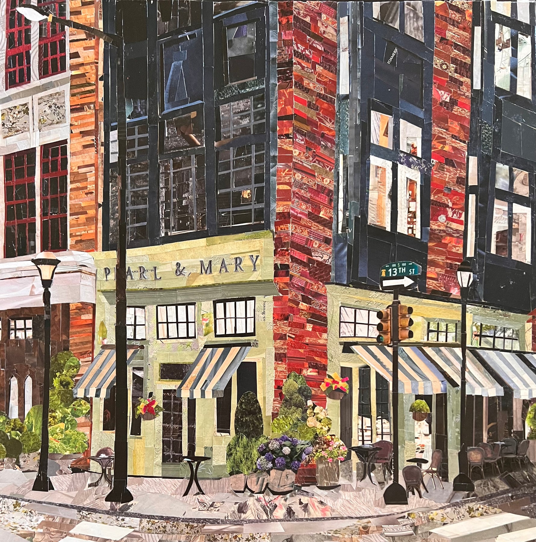 17" x 17" matted torn paper collage artwork by Chrissy McIntyre. Art of Pearl and Mary Oyster Bar in Philadelphia, view of street corner with signs and lampposts, done in yellow, black and red.