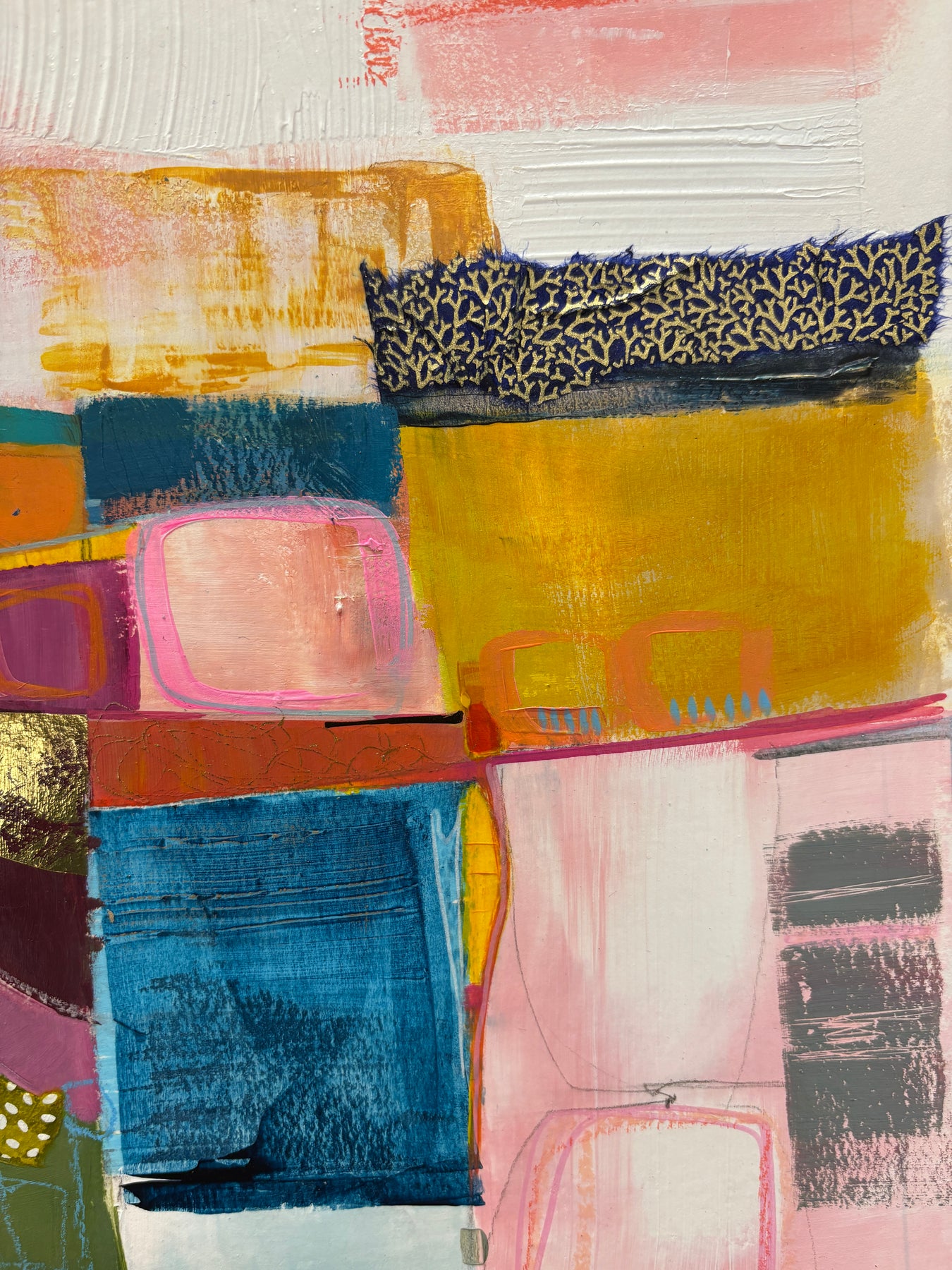 abstract geometric collage of square and semi circle shapes in fabric graphite acrylic paint gold leaf foil in pink green blue stacked and overlapping on pink and white background