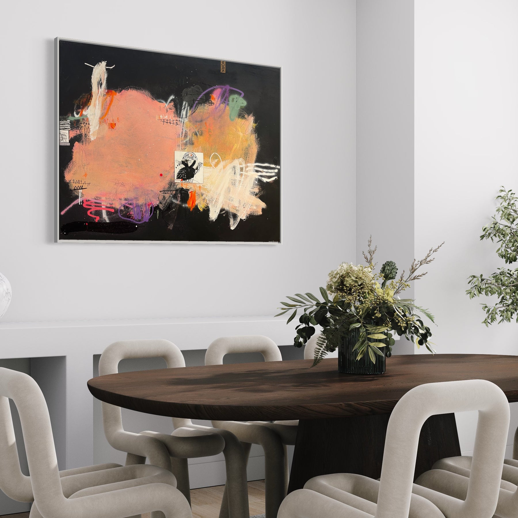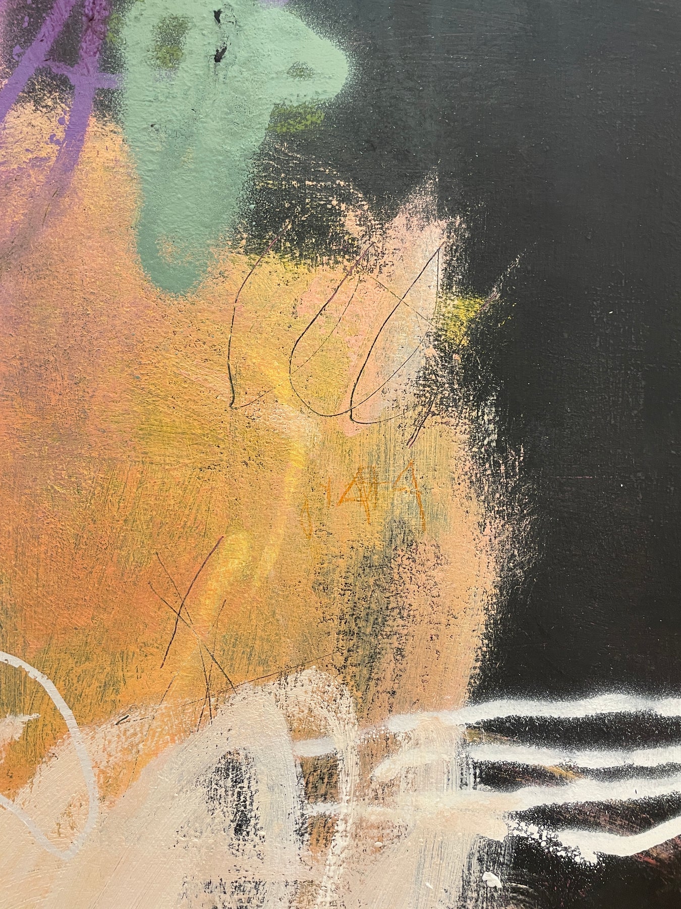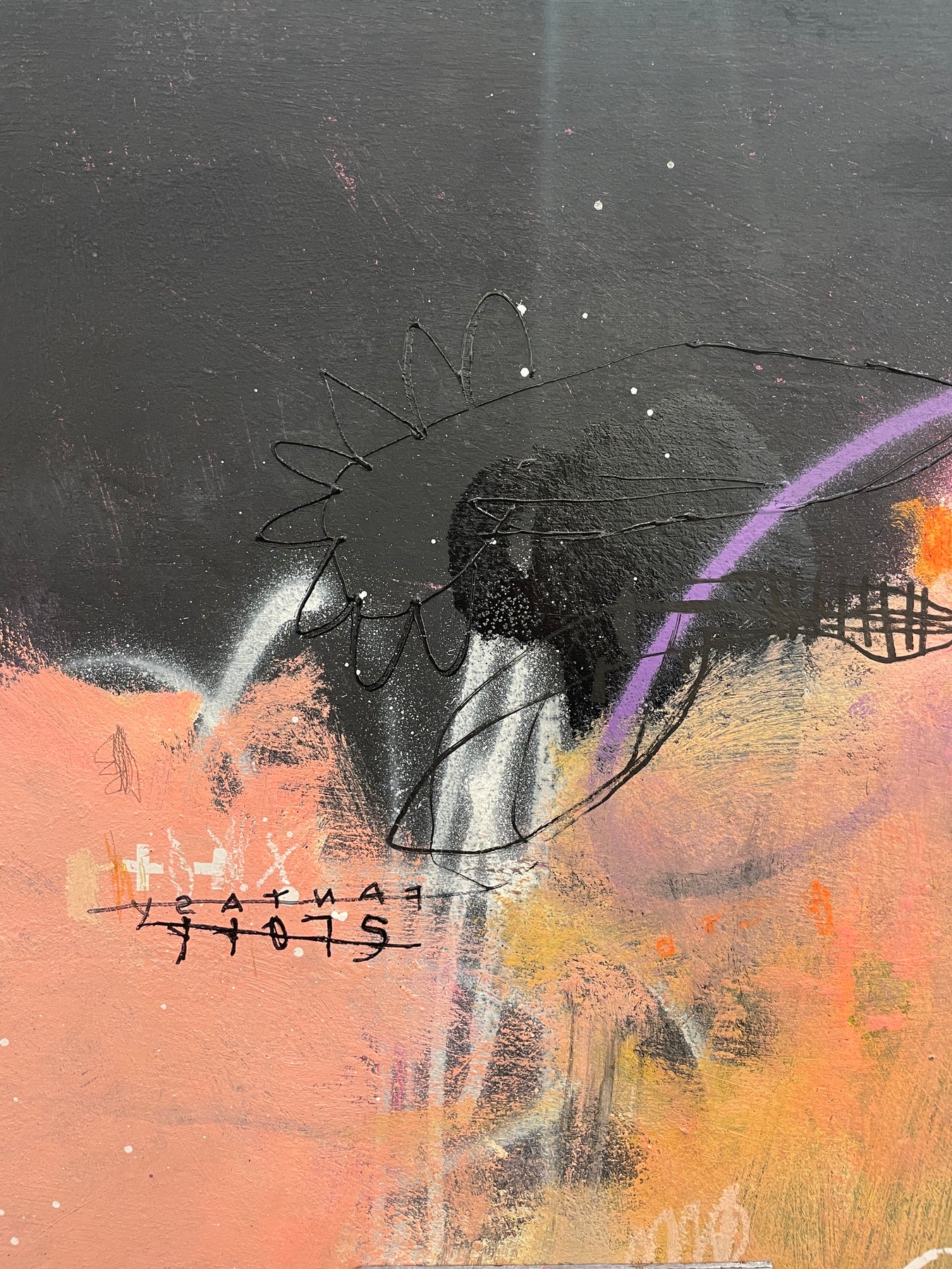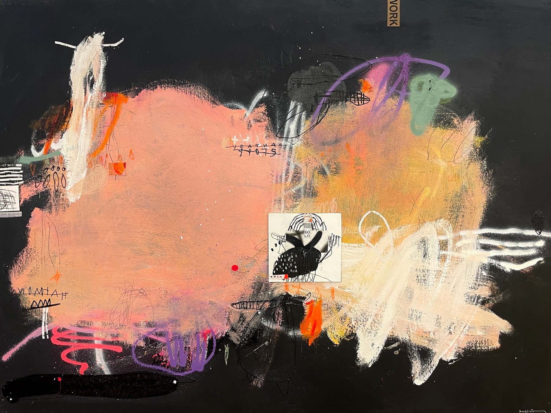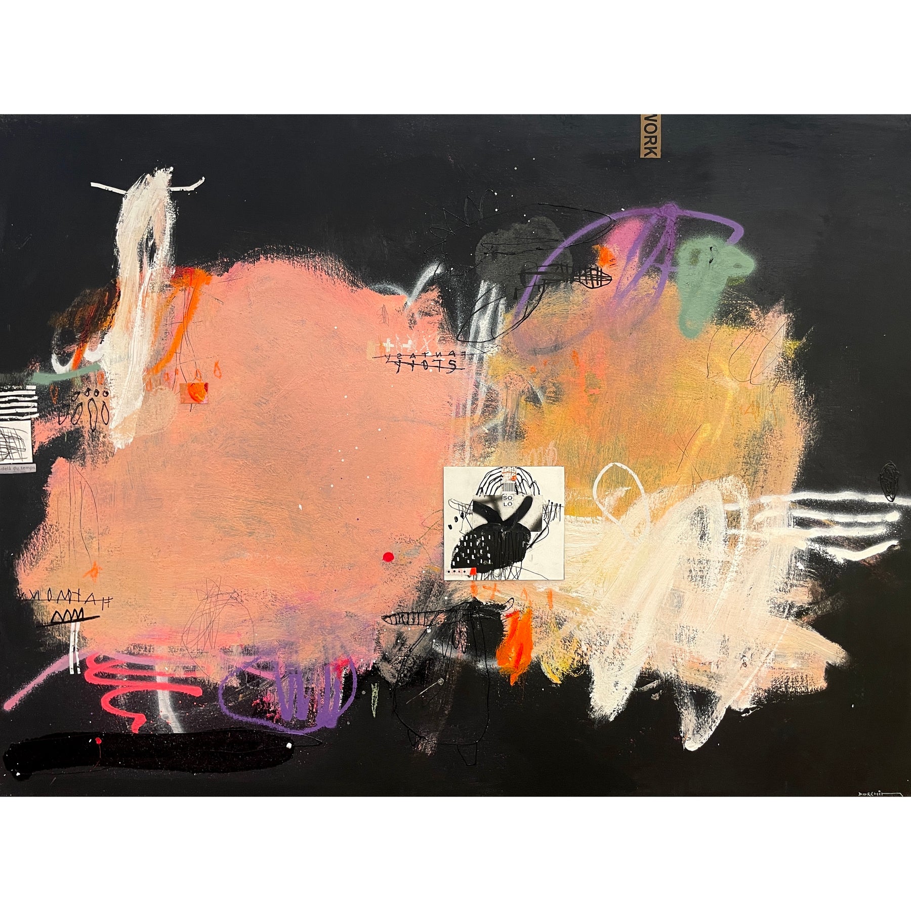 - Acrylic paint, collage, graphite, pastel and spray paint on canvas
