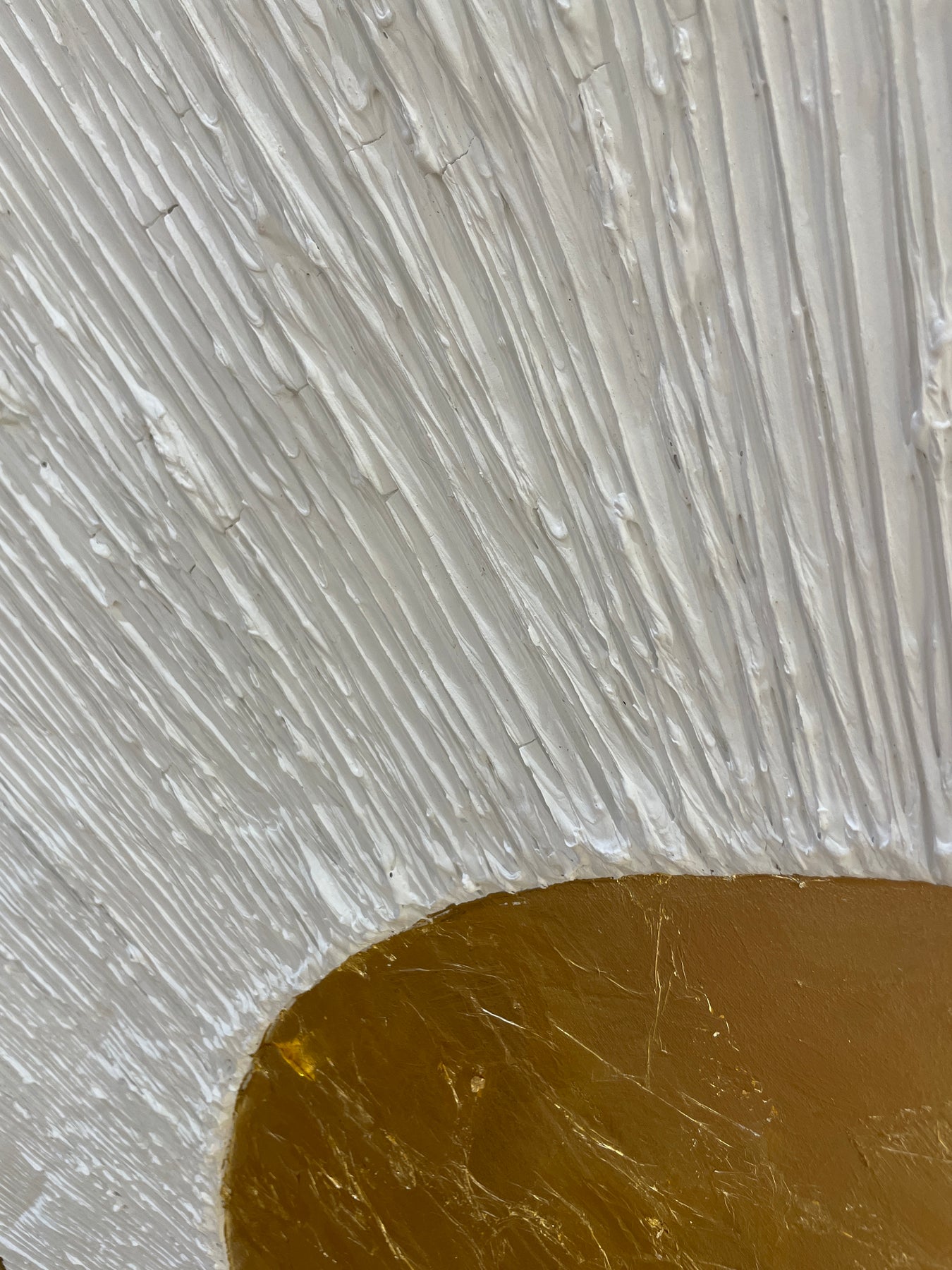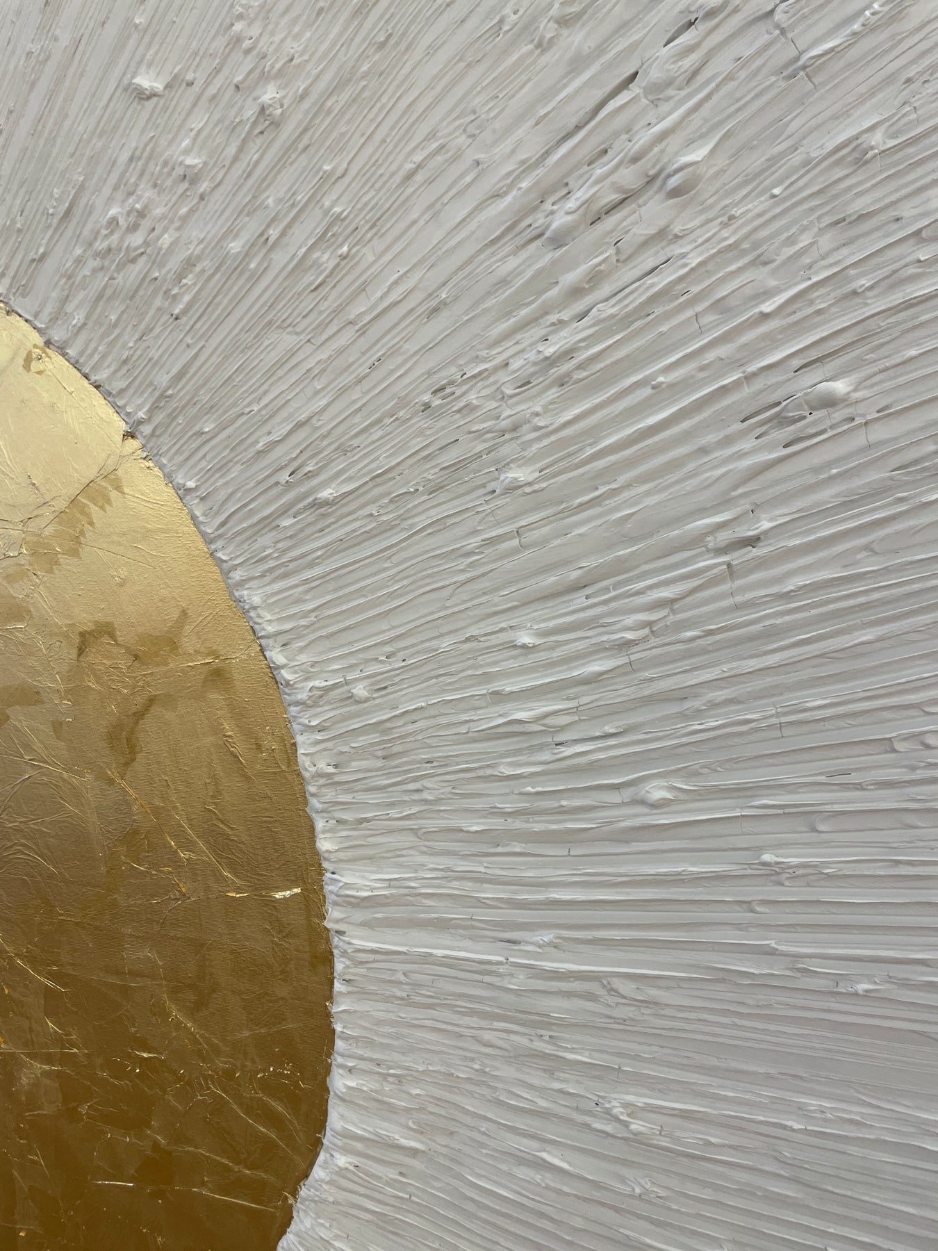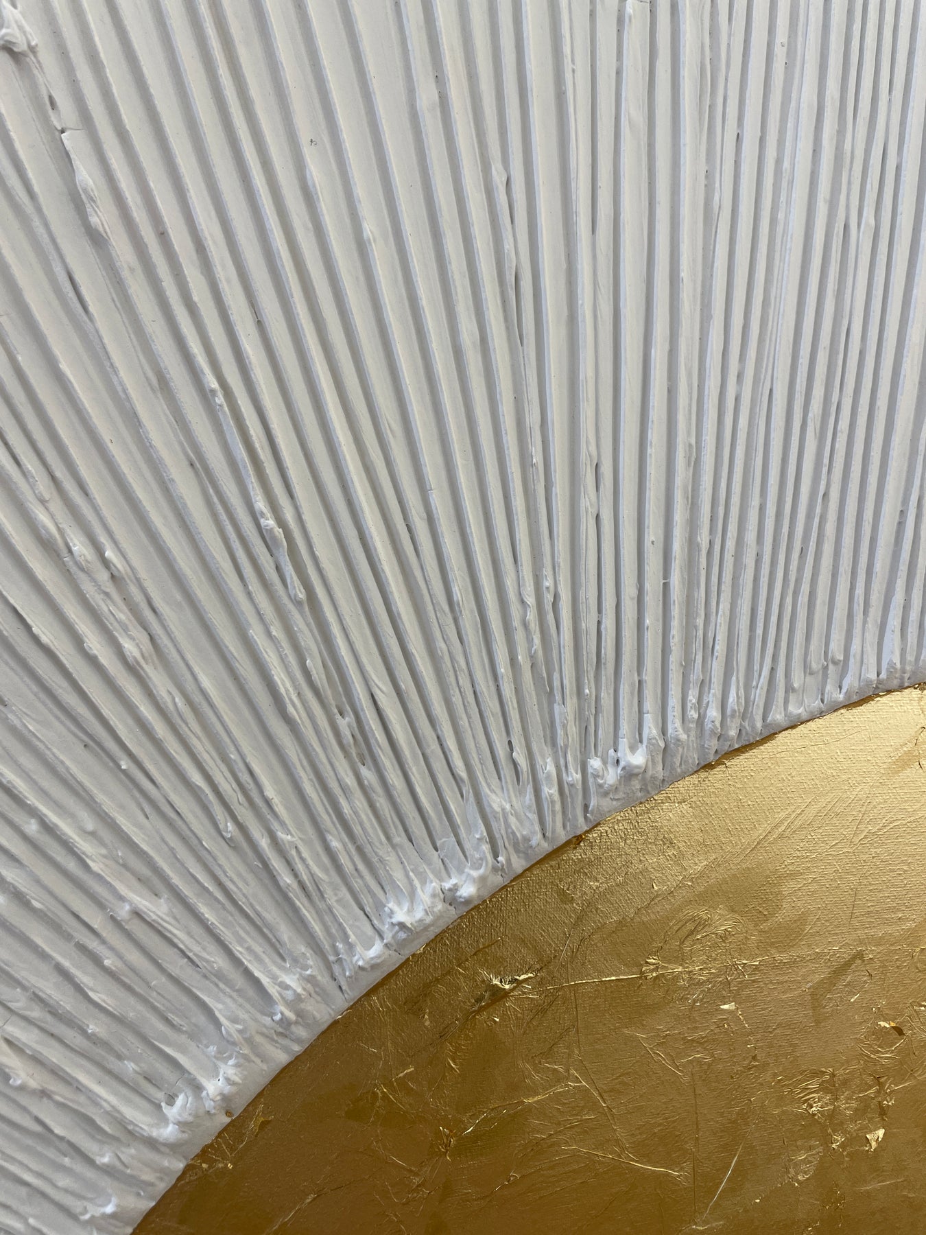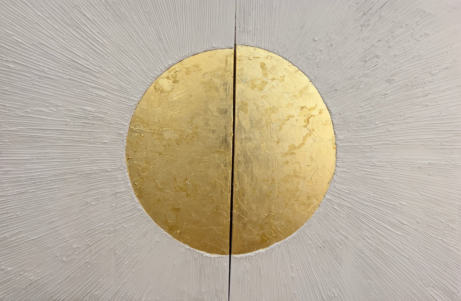 Jerilee, a Philadelphia-based artist working under the name ‘Lee in Cerulean’, creates striking minimalist pieces. For Lee, simple curves, asymmetry, and overlapping forms reflect the beautiful world around us—and find, within our surroundings, the continuity, serendipity, and at times mundane nature of everyday life. Deriving from the Japanese Wabi-Sabi philosophy’s embrace of imperfection, highly textural pieces show Lee’s freeform strokes, using a blend of joint compound, acrylic paint, and a myriad of other media. Under this philosophical orientation, ridges and built-up materials are a reminder that we continue to evolve, just as nature does.