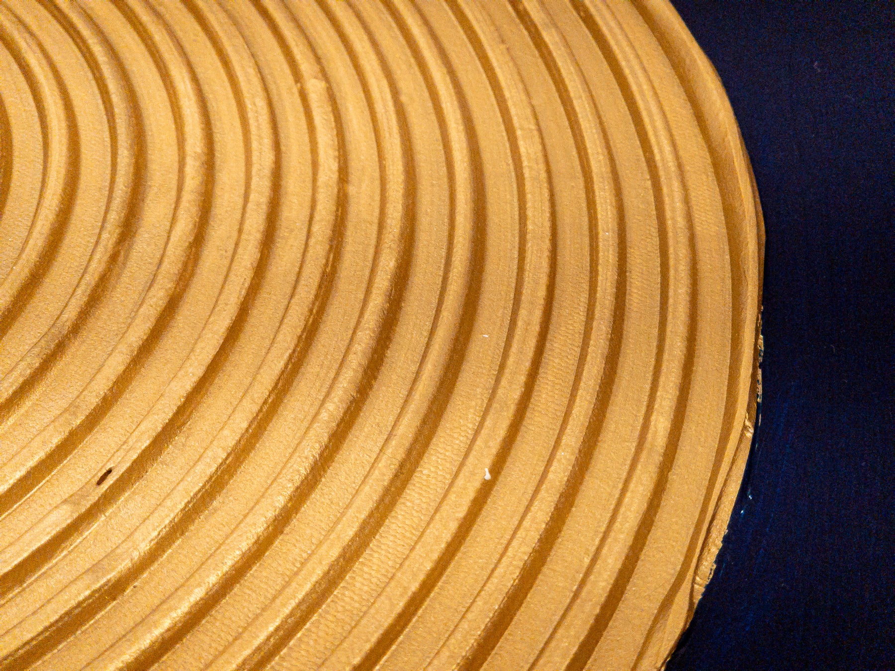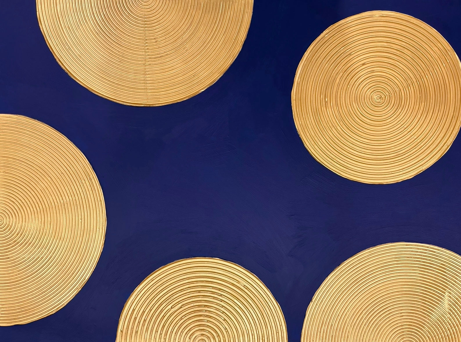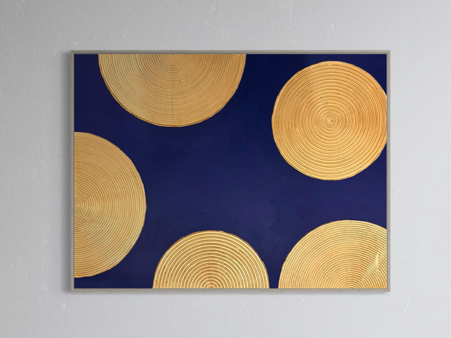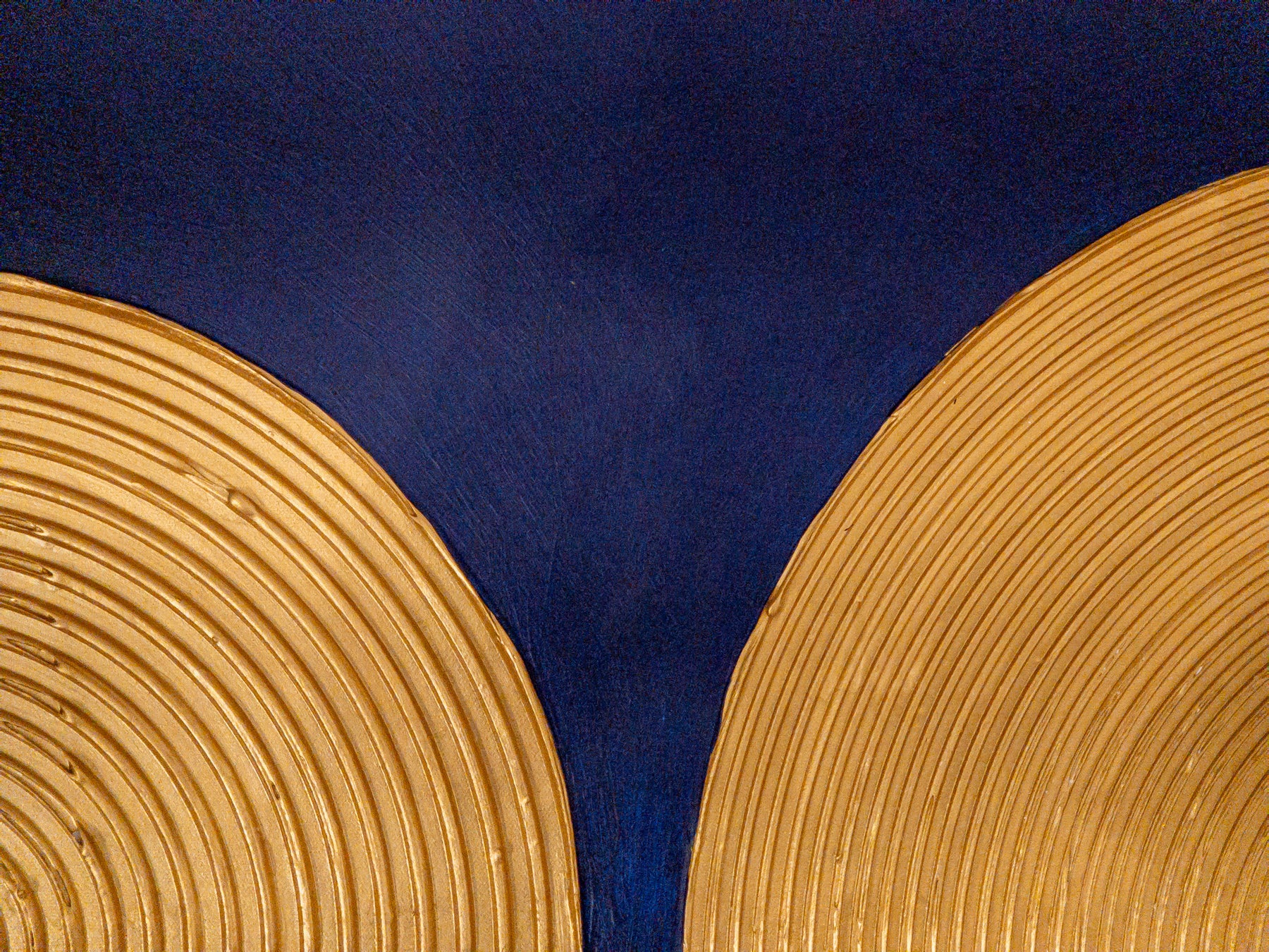 Jerilee, a Philadelphia-based artist working under the name ‘Lee in Cerulean’, creates striking minimalist pieces. For Lee, simple curves, asymmetry, and overlapping forms reflect the beautiful world around us—and find, within our surroundings, the continuity, serendipity, and at times mundane nature of everyday life. Deriving from the Japanese Wabi-Sabi philosophy’s embrace of imperfection, highly textural pieces show Lee’s freeform strokes, using a blend of joint compound, acrylic paint, and a myriad of other media. Under this philosophical orientation, ridges and built-up materials are a reminder that we continue to evolve, just as nature does.