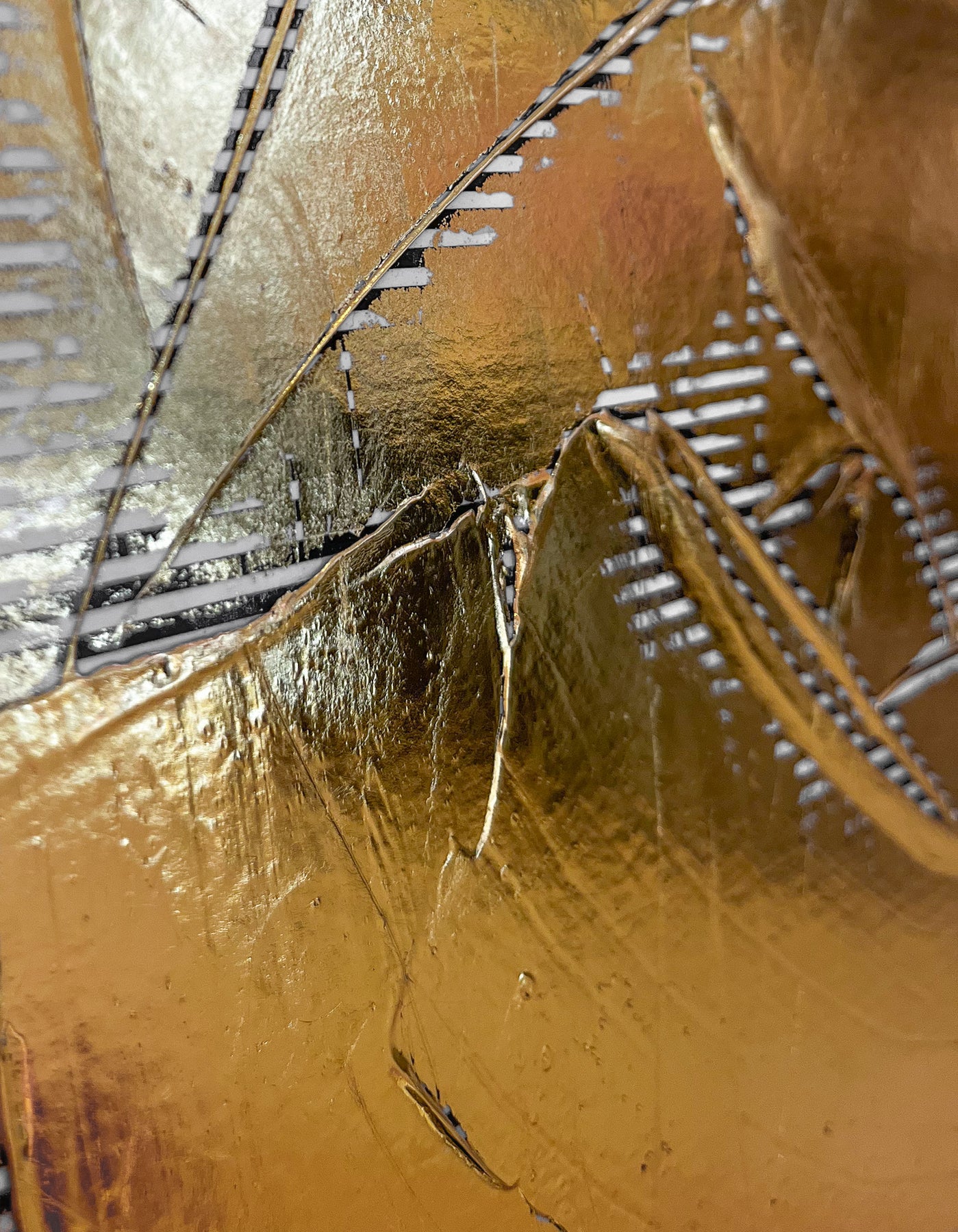 NYC based artist, M. Clark, creates light-reflecting works wherein the artist manipulates heat and pressure to fix metallic foil onto various surfaces -- there is no paint on her artworks, only gold, copper, or silver foil. Clark often uses a palette knife to help texturize her highly reflective, modern and minimalist works of art.