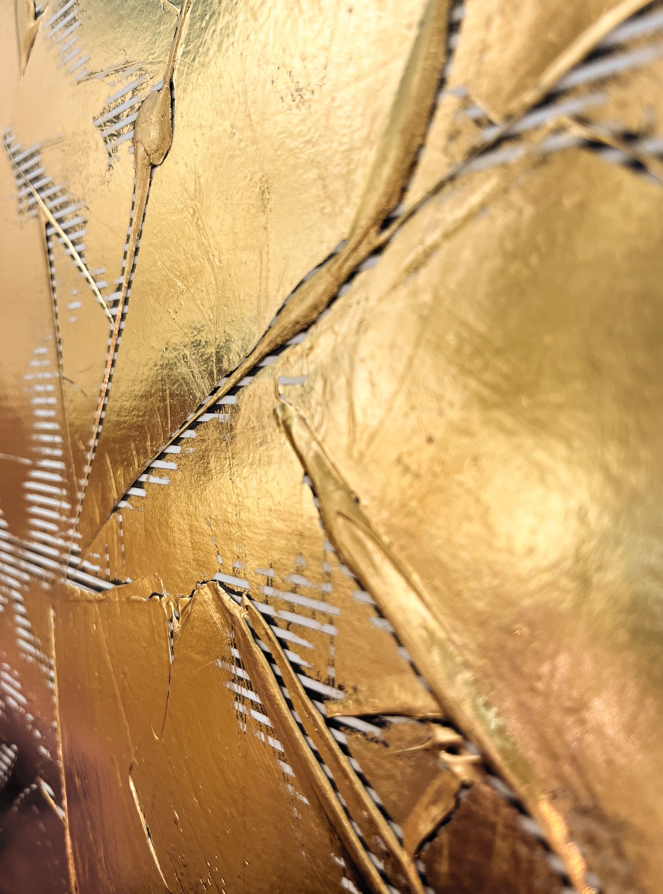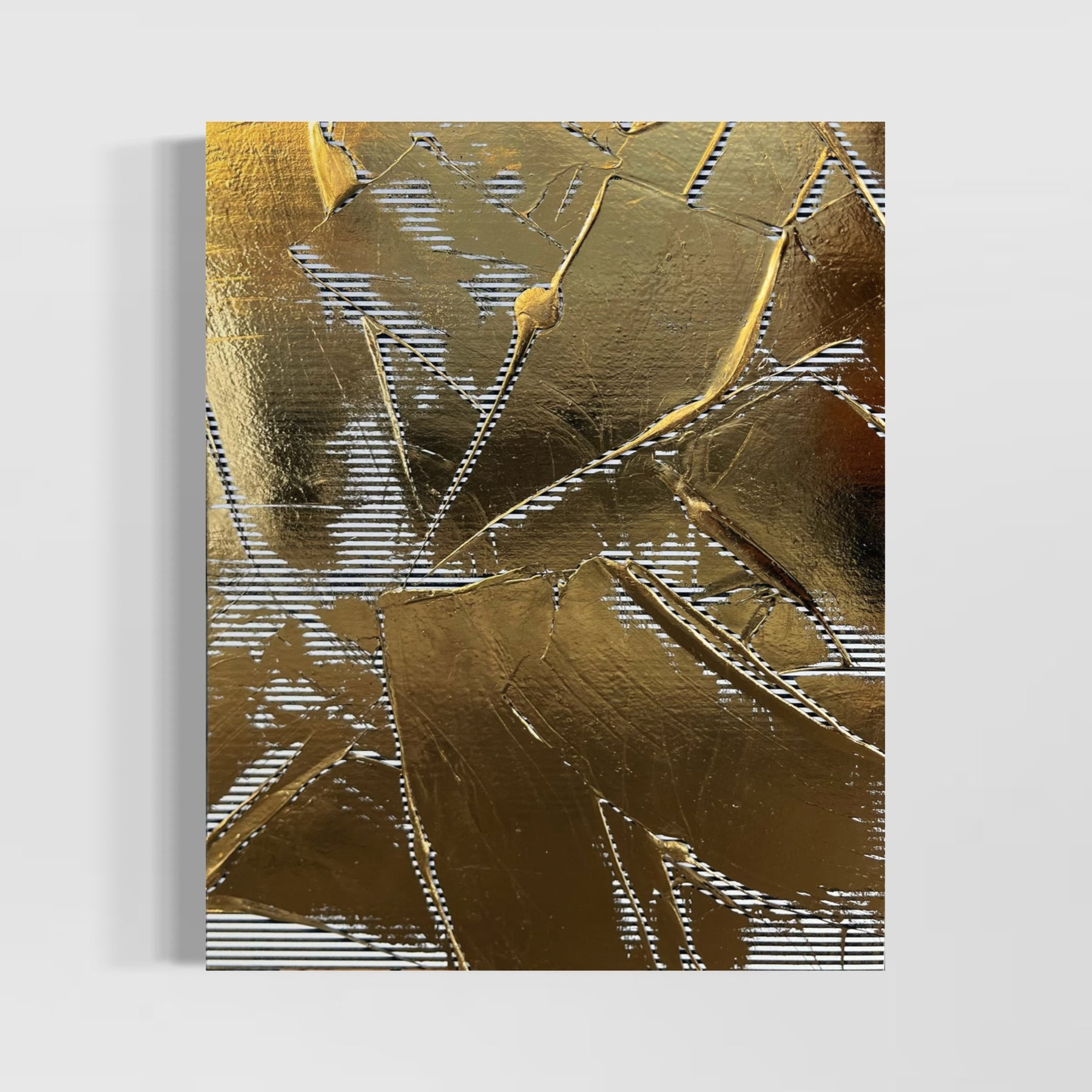 Golden Texture No. 365 by M. Clark, thick gold brush strokes on striped background, gold foil artwork, abstract