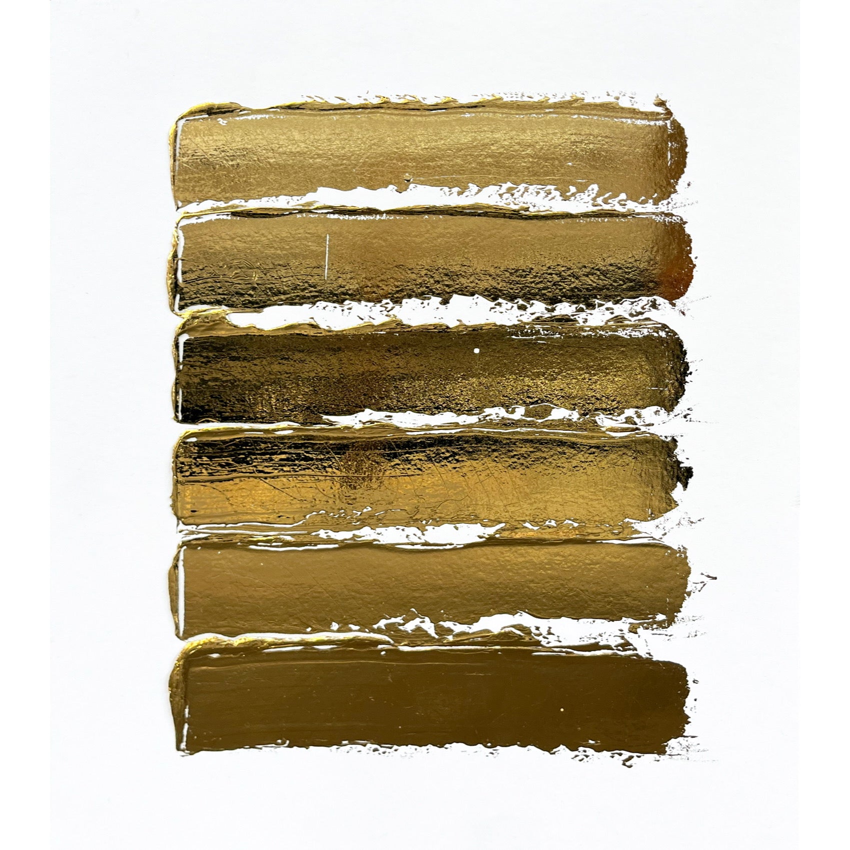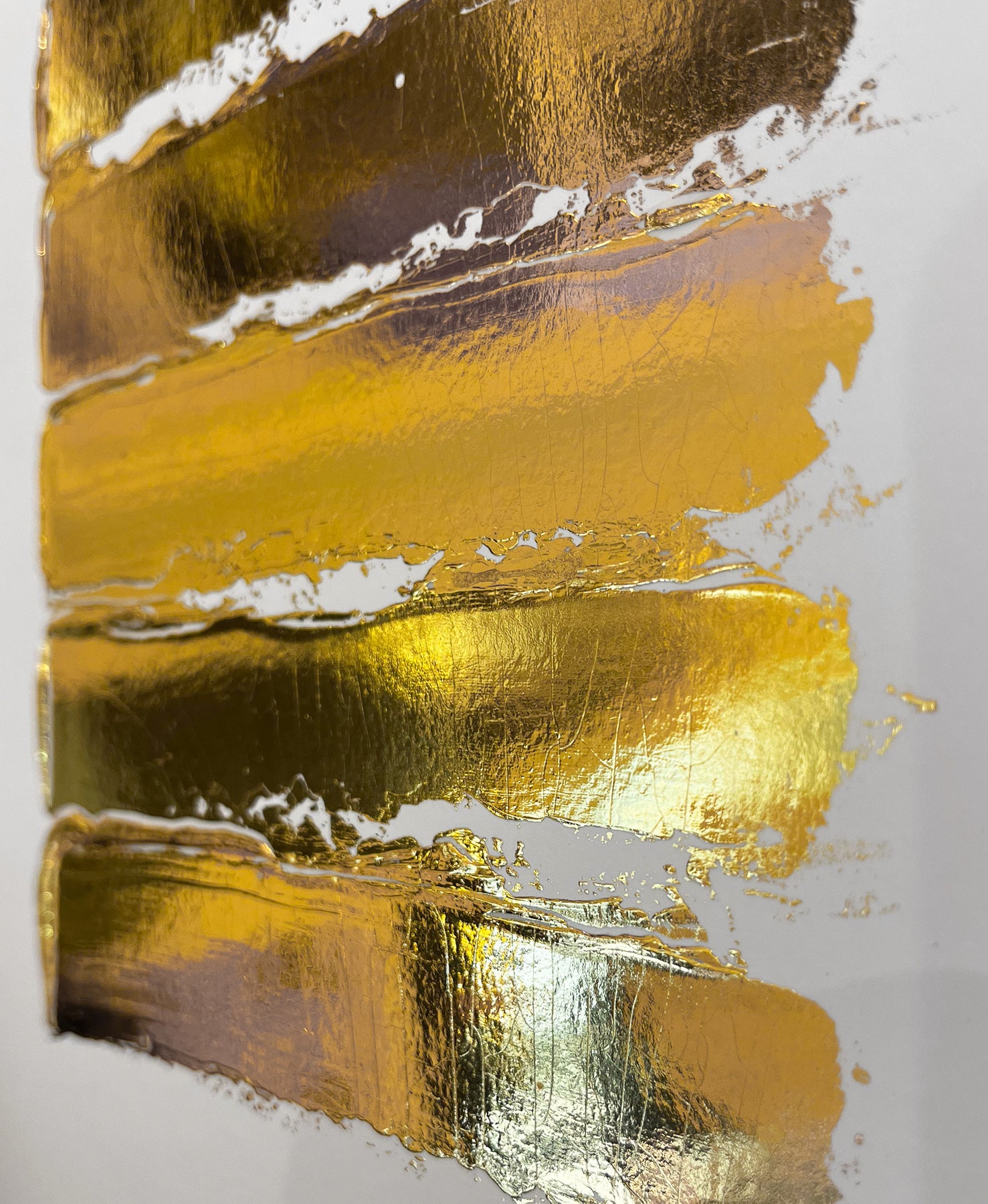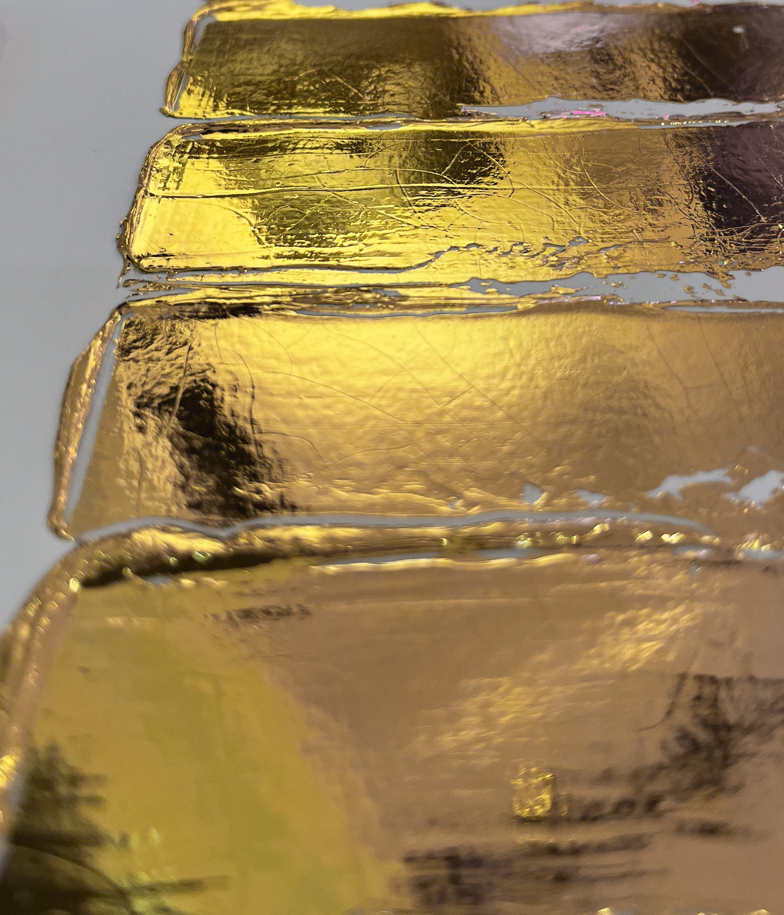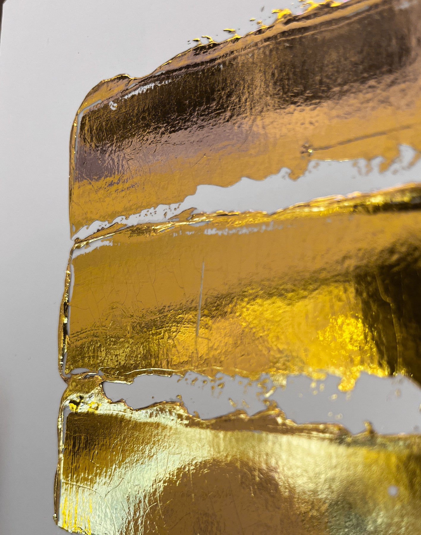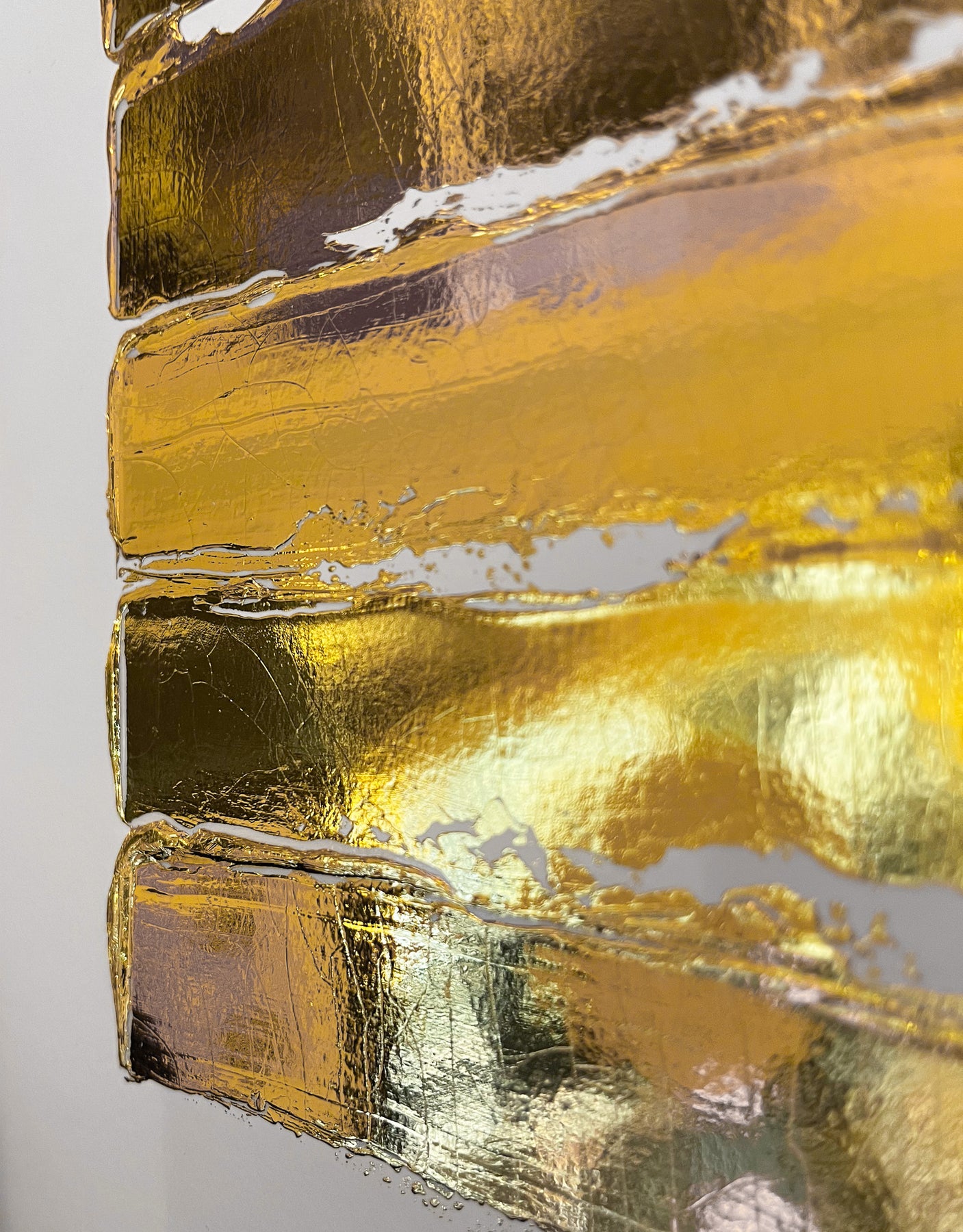 NYC based artist, M. Clark, creates light-reflecting works wherein the artist manipulates heat and pressure to fix metallic foil onto various surfaces -- there is no paint on her artworks, only gold, copper, or silver foil. Clark often uses a palette knife to help texturize her highly reflective, modern and minimalist works of art.